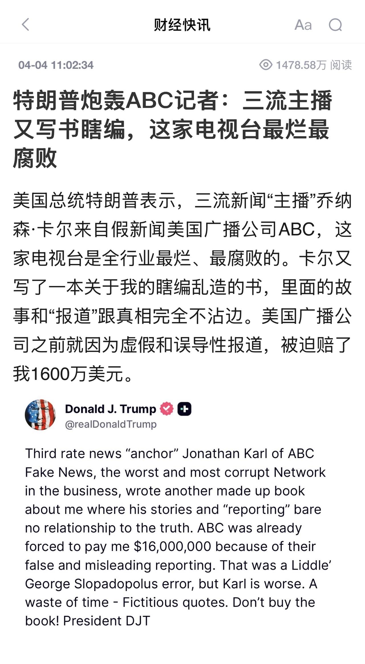 深夜22:58,特朗普总统还没睡,又发了一条推文。看完后说他是“愤怒入睡”都算客气了,这分明是带着核弹级别的起床气,一头扎进社交平台开始“扫射”。 炮口对准的是ABC新闻的乔纳森·卡尔,特朗普的原话是:三流新闻“主播”、来自最烂最腐败的ABC假新闻台,又写了一本关于我的瞎编乱造的书,故事和“报道”跟真相完全不沾边。 注意这个“又”字。卡尔不是第一次写特朗普了,之前就出过好几本,本本都是《纽约时报》畅销书。特朗普显然是被写怕了,也是被写烦了,半夜翻来覆去睡不着,索性爬起来敲键盘。 更关键的是,这本书是2025年10月出的,距离现在已经过去将近半年。特朗普没有在书刚出的时候骂,没有在登顶畅销榜的时候骂,偏偏在伊朗战场焦头烂额、F-15被击落、飞行员悬赏活捉的节骨眼上,半夜跳出来骂一本半年前的书。 你品,你细品。这叫“转移视线”。国内问题解决不了?那就骂媒体。战场打不赢?那就骂记者。深夜睡不着?那就找个靶子开火。特朗普这套操作,熟练得让人心疼。 当然,他也没忘记翻旧账。文中专门提了一嘴ABC因为“虚假和误导性报道”被迫赔了他1600万美元,还点名乔治·斯特凡诺普洛斯犯了错,但卡尔更糟。 这1600万的来龙去脉挺有意思。2024年,斯特凡诺普洛斯在节目中说特朗普“被判犯有强奸罪”,而实际上陪审团认定的是“性侵”,不是纽约法律定义的强奸。 ABC事后后悔得肠子都青了,不仅登报道歉,还掏出1600万美元和解——1500万捐给特朗普的总统图书馆,100万付律师费。 特朗普每次提起这事,都像是中了彩票一样得意洋洋。1600万,对他来说可能不算什么大钱,但这是“假新闻媒体”向他屈服的铁证。他要的就是这个效果:你们骂我,我告你们,你们赔钱,我赢了。 但这里有个最讽刺的地方——特朗普一边骂ABC“最烂最腐败”,一边拿着人家赔的1600万盖总统图书馆。这叫什么?这叫端起碗吃饭,放下碗骂娘。哦不对,是端着碗骂娘,放下碗还骂娘。 卡尔的新书叫《疲惫的胜利》,讲的是特朗普如何把共和党改造成自己的个人品牌,以及他在2024年大选中的复仇之路。书里有很多“虚构的引语”,特朗普说全是编的,浪费时间,别买。 但问题是,这书已经出了半年,该买的早就买了,该看的早就看了。特朗普现在喊“别买”,跟电影院散场后喊“别看”有什么区别?典型的“马后炮”,还是半夜响的那种。 不过话说回来,特朗普这波深夜开火,效果倒是立竿见影。金十数据、RawStory等媒体第一时间跟进报道,标题清一色“特朗普炮轰ABC记者”。 全网都在讨论“三流主播”和“1600万”,至于伊朗战场上那个还在山沟沟里躲着的美国飞行员?谁还记得? 这才是特朗普的精明之处。他不是在跟卡尔吵架,他是在跟自己的“睡不着觉”和解。骂完一通,神清气爽,关手机,睡觉。至于明天醒来世界变成什么样,那是明天的事。 最后说句大实话:特朗普骂ABC不是新闻,特朗普深夜不睡觉也不是新闻,但特朗普在伊朗战事吃紧、F-15被击落的节骨眼上,揪着一本半年前的书骂到半夜——这才是真正的“新闻”。这说明什么?说明白宫里的那位,心态已经崩了。 毕竟,当一个总统开始用“别买这本书”来刷存在感的时候,你就知道,他的战场已经不在中东,而在自己的枕头边了。