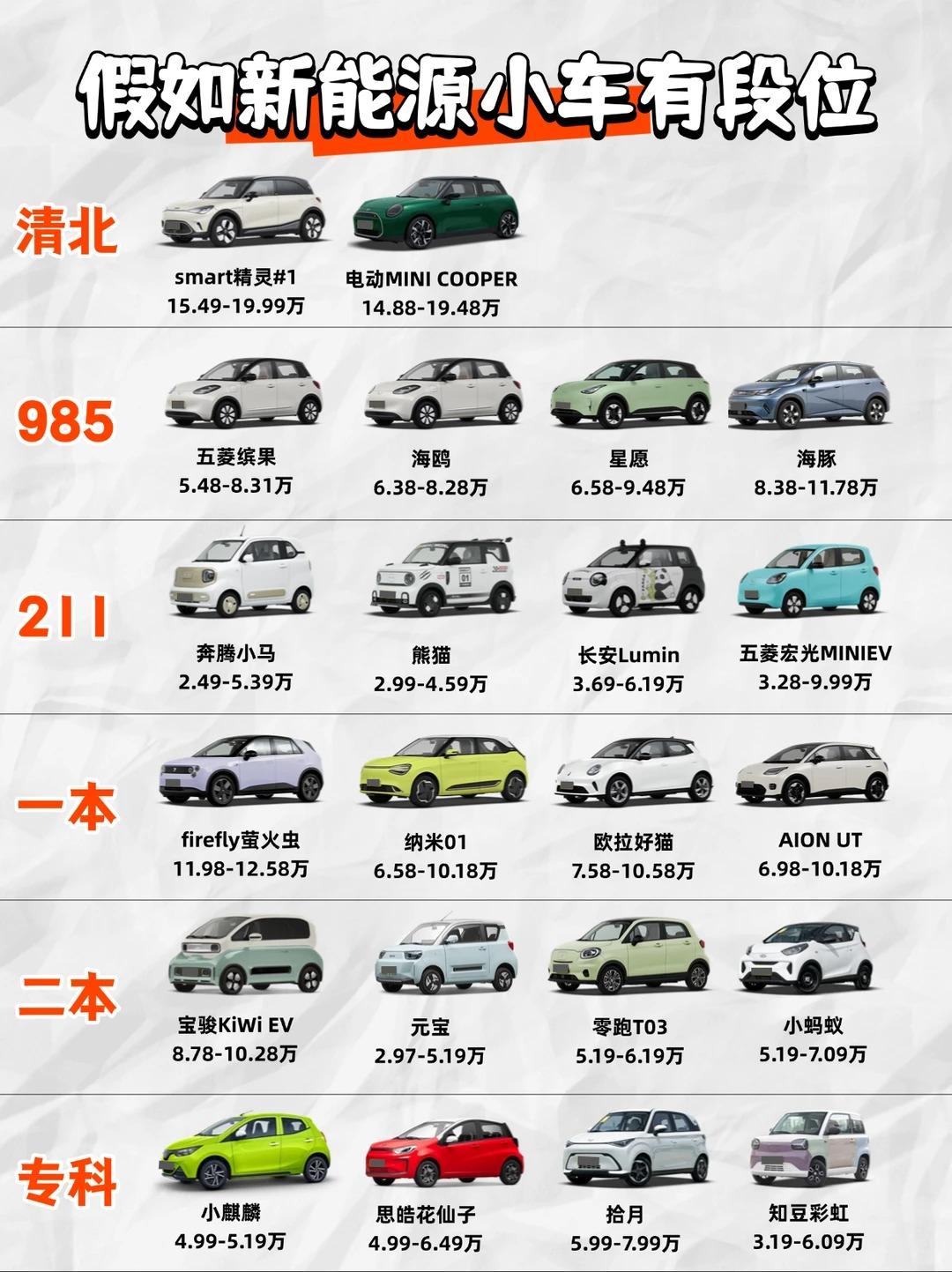 假如新能源小车有学历段位🔥 你的预算能“考”上哪款? 现在的新能源小车内卷到离谱!价格从3万横跨到30万,颜值、性能、智能一个都不落下,卷得让人眼花缭乱~ 今天就玩点不一样的,用「学历版」段位给它们排个名,看看你的预算,能拿下哪所“小车名校”,哪款才是你的本命座驾? 🚕 清北级|精致小资天花板(颜值性能双在线) smart精灵1:15.49万起,奔驰设计加持+吉利三电技术背书,CLTC续航可达570km,5.1秒就能破百,无框车门搭配发光LOGO,质感拉满,妥妥的都市小资党专属,开出去自带高级感。 电动MINI COOPER:补贴后14.88万起,经典英伦复古造型自带辨识度,搭载190kW大功率电机,CLTC续航412km,操控灵动,复古控、颜值党直接冲就对了。 🚕 985级|性价比卷王(实用与实力并存) 五菱缤果:5.38万起,CLTC续航410km,配备便捷怀挡设计,空间比五菱MINIEV宽敞不少,接送孩子、日常买菜代步超合适,堪称宝妈专属神器。 比亚迪海鸥:7.38万起,CLTC续航305km,全系标配快充功能,安全配置拉满,车身小巧灵活,城市通勤代步首选,新手也能轻松驾驭。 吉利星愿:6.88万起,堪称纯电小车里的“全能学霸”,续航扎实不缩水,智能座舱配置越级,兼顾实用与科技感,性价比直接拉满。 比亚迪海豚:11万级“六边形战士”,空间宽敞、续航稳定,无论是家用还是单人通勤都适配,配置无短板,闭眼入不踩坑。 🚕 211级|经济适用派(省心好开性价比高) 长安Lumin:4.89万起,萌系造型软萌可爱,CLTC续航301km,配备电子手刹+后轮盘刹,操作便捷,颜值与实用性兼具,是女生代步的首选车型。 五菱宏光MINIEV:3万级“国民神车”,销量常年稳居前列,改装潜力巨大,车身小巧好停车,纯短途代步性价比无敌,堪称代步界的“卷王”。 吉利熊猫:吉利出品品质有保障,安全配置拉满,还自带快充功能,日常补能方便,颜值萌动,兼顾安全与实用,代步超省心。 奔腾小马:4万级新晋新秀,造型Q弹可爱,车身小巧灵动,续航适配短途通勤,价格亲民,适合预算有限、主打代步的朋友。 🚕 一本级|个性小众党(不走寻常路首选) 萤火虫:吉利旗下精品微型车,设计独特有辨识度,打破常规小车的同质化,颜值亮眼,适合追求个性、不想撞款的姐妹。 纳米01:东风出品,堪称微型车界的“空间魔术师”,后排空间宽敞到能跷二郎腿,兼顾个性与实用性,日常代步超舒适。 欧拉好猫:复古与未来感碰撞的设计,专属女生配色颜值拉满,续航扎实稳定,内饰精致,是女生专属的个性座驾。 AION UT:广汽埃安全新力作,智能配置越级表现,科技感拉满,操作便捷,适合喜欢新鲜科技、追求智能体验的科技控。 🚕 二本级|实用主义首选(主打代步无压力) 宝骏KiWi EV:造型科幻独特,打破传统小车的刻板印象,智能配置丰富实用,车身小巧灵活,穿梭在城市街巷毫无压力。 零跑T03:5.99万起,CLTC续航可达403km,搭载80kW电机,动力充沛,配置扎实,性价比直接炸裂,纯代步首选。 奇瑞小蚂蚁:奇瑞经典微型车,深耕市场多年,续航扎实可靠,售后网点遍布广泛,后期保养方便,代步省心又安心。 北汽元宝:北汽制造出品,价格亲民,配置够用不冗余,没有多余花哨设计,主打纯短途代步,预算有限者可冲。 🚕 专科级|极致性价比(低价代步刚需) 知豆彩虹:补贴后3.19万起,CLTC续航205km,车身小巧,适合日常买菜、短途代步,价格低廉,满足基础代步需求。 东风风光小麒麟:3万级纯代步小车,续航表现中规中矩,但胜在价格亲民,预算极低、只需要基础代步的朋友可考虑。 思皓花仙子:大众旗下微型车,设计软萌可爱,颜值在线,操作便捷,适合喜欢可爱风格、主打短途代步的女生。 拾月:新势力微型车,配置简单实用,没有冗余设计,胜在价格实惠,性价比突出,纯代步无压力。 看完这份“学历版”新能源小车段位排行,你的预算能“考”上哪所“小车名校”?评论区聊聊,哪款才是你心中的本命小车吧!【来自懂车帝车友圈】