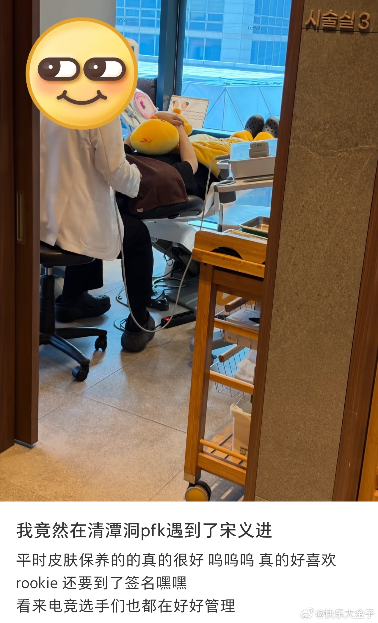 Rookie戴戒指 iG今天新赛季开门红,而远在韩国没归队的老队长Rookie,在皮肤科做保养时被粉丝偶遇。