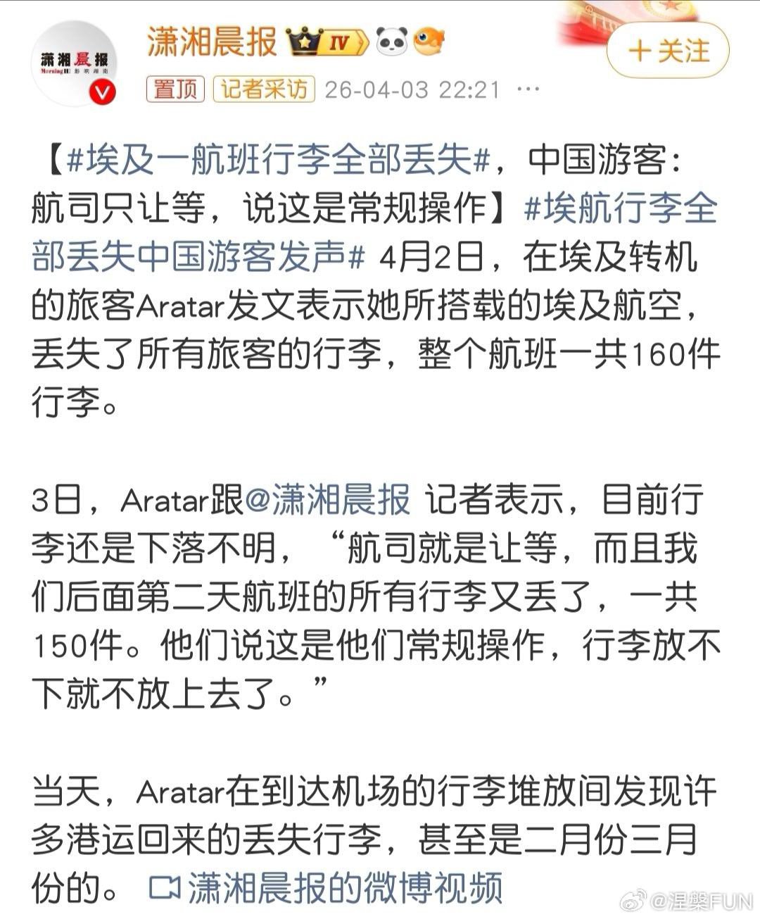 埃及一航班行李全部丢失 这不是个案,有游客反馈埃及国内航班托运行李丢失率高,曾出现"一个飞机50多位乘客,最后40多位行李丢了"的情况,2026年3月也有乘客因行李被故意卸下而起诉埃及航空的案例。