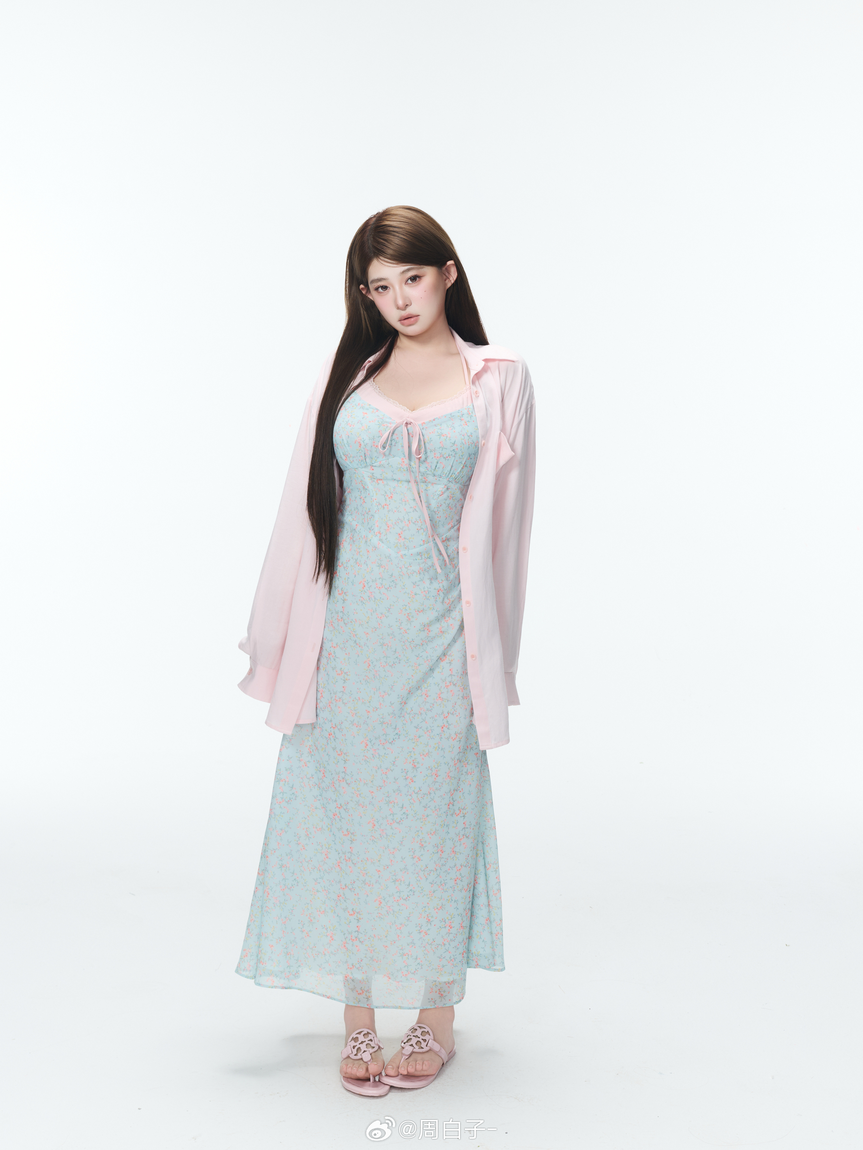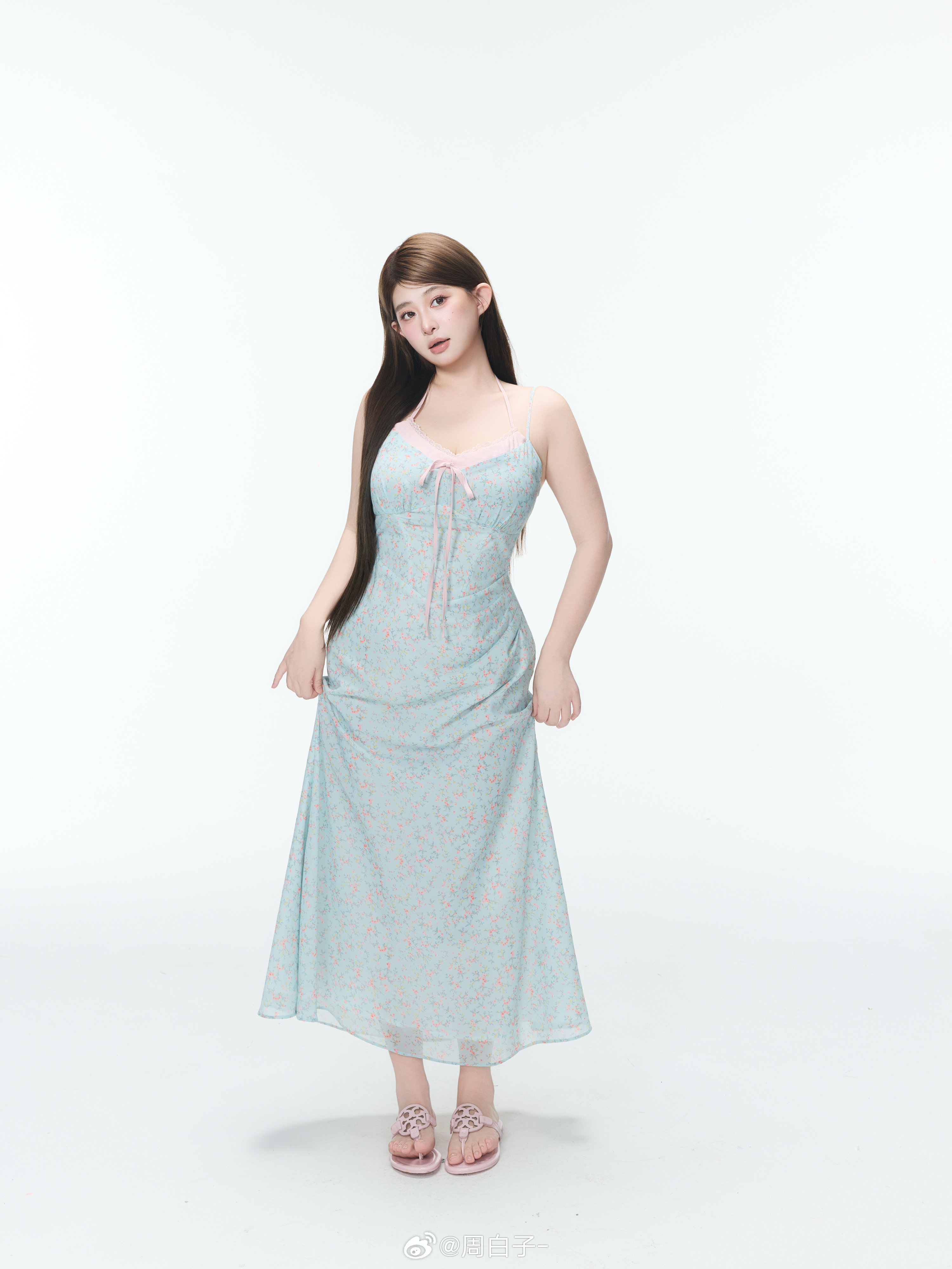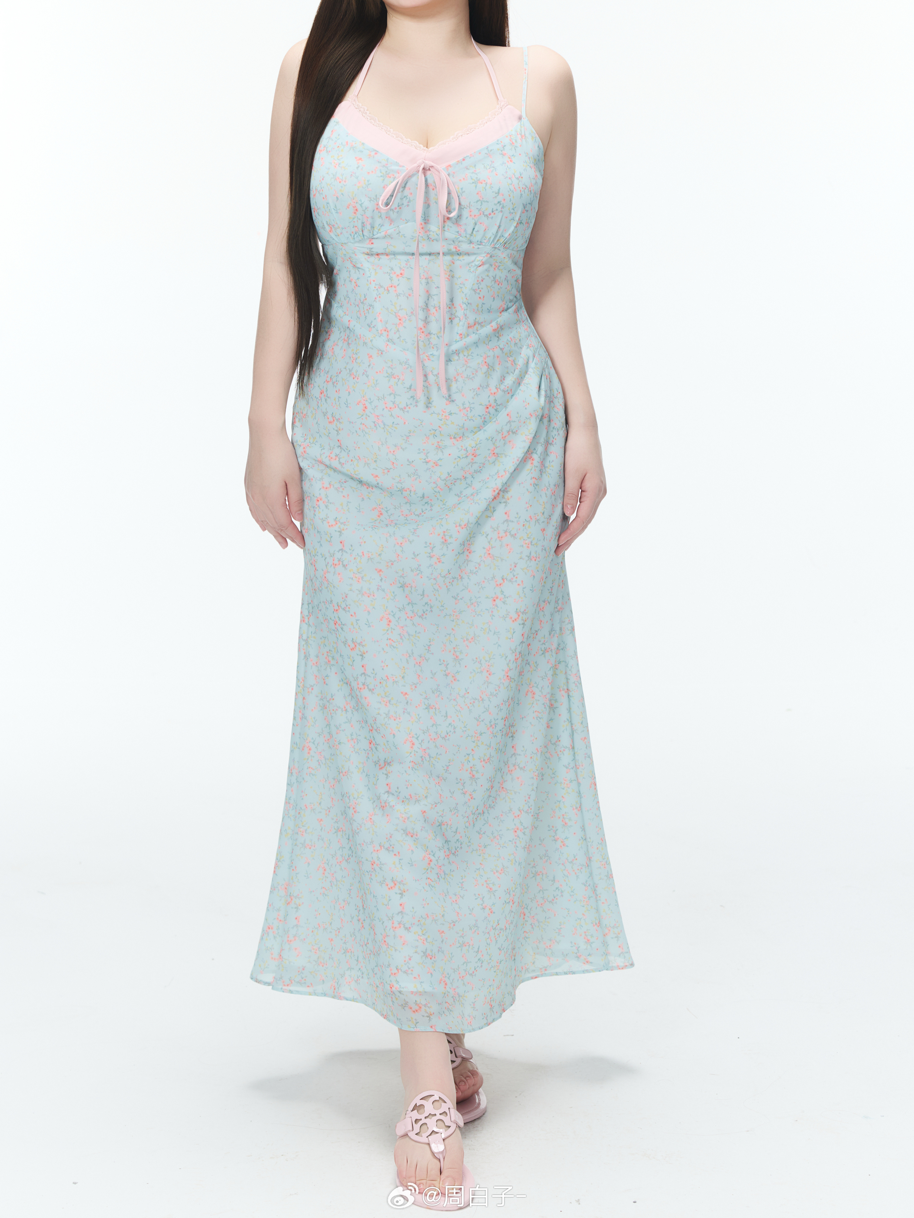 "甜妹本命!!“薄荷风信子裙”蓝底碎花撞色,奶呼呼显白不挑皮✨雪纺透气垂顺,夏天穿凉丝丝不闷汗~V 领蕾丝+蝴蝶结,甜欲感直接拉满🎀收腰抽褶设计,可调节肩带微胖姐妹放心冲‼️夏日清透感穿搭,被这条碎花裙拿捏了💘"