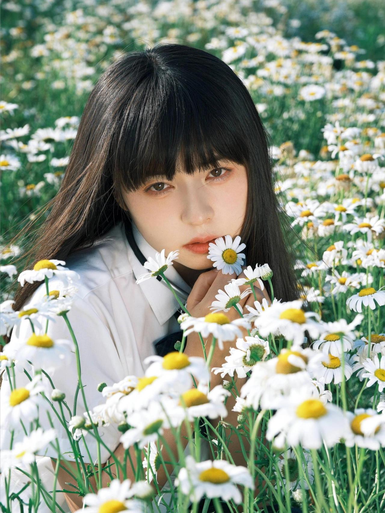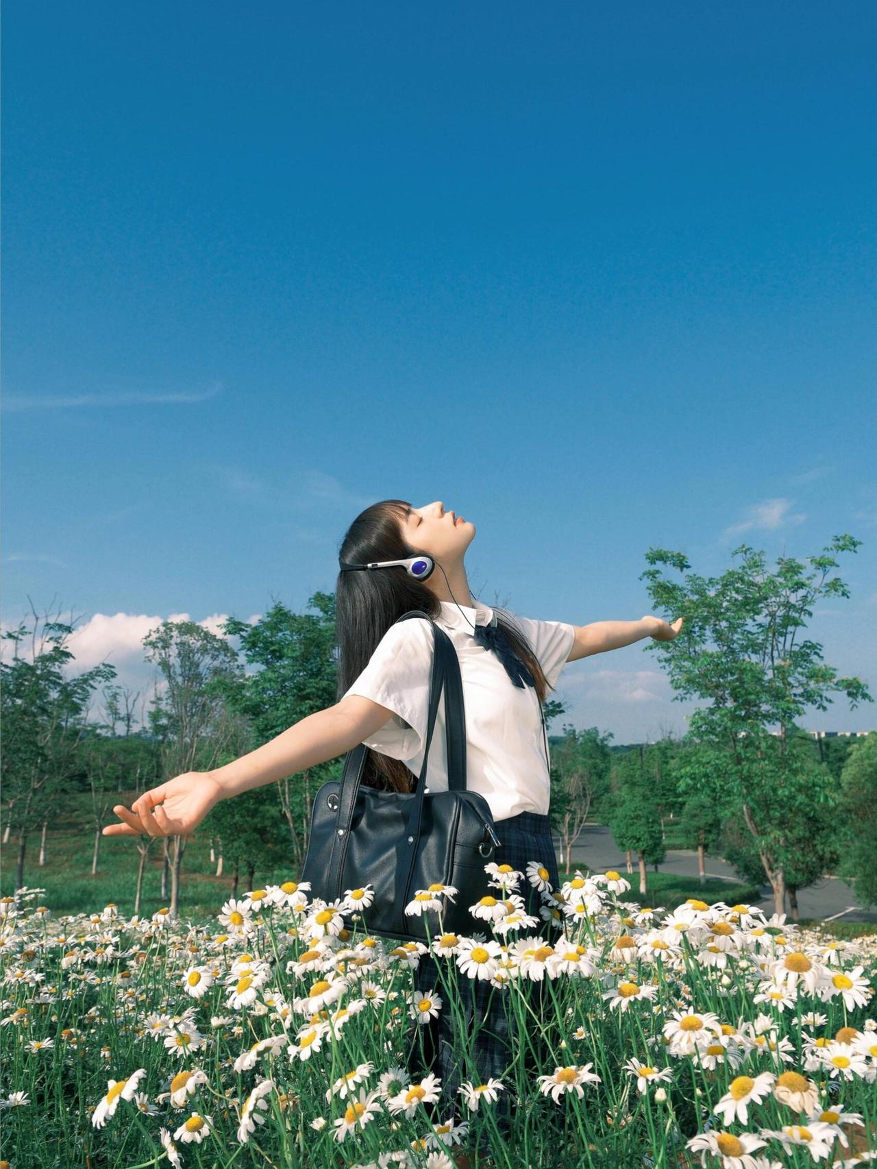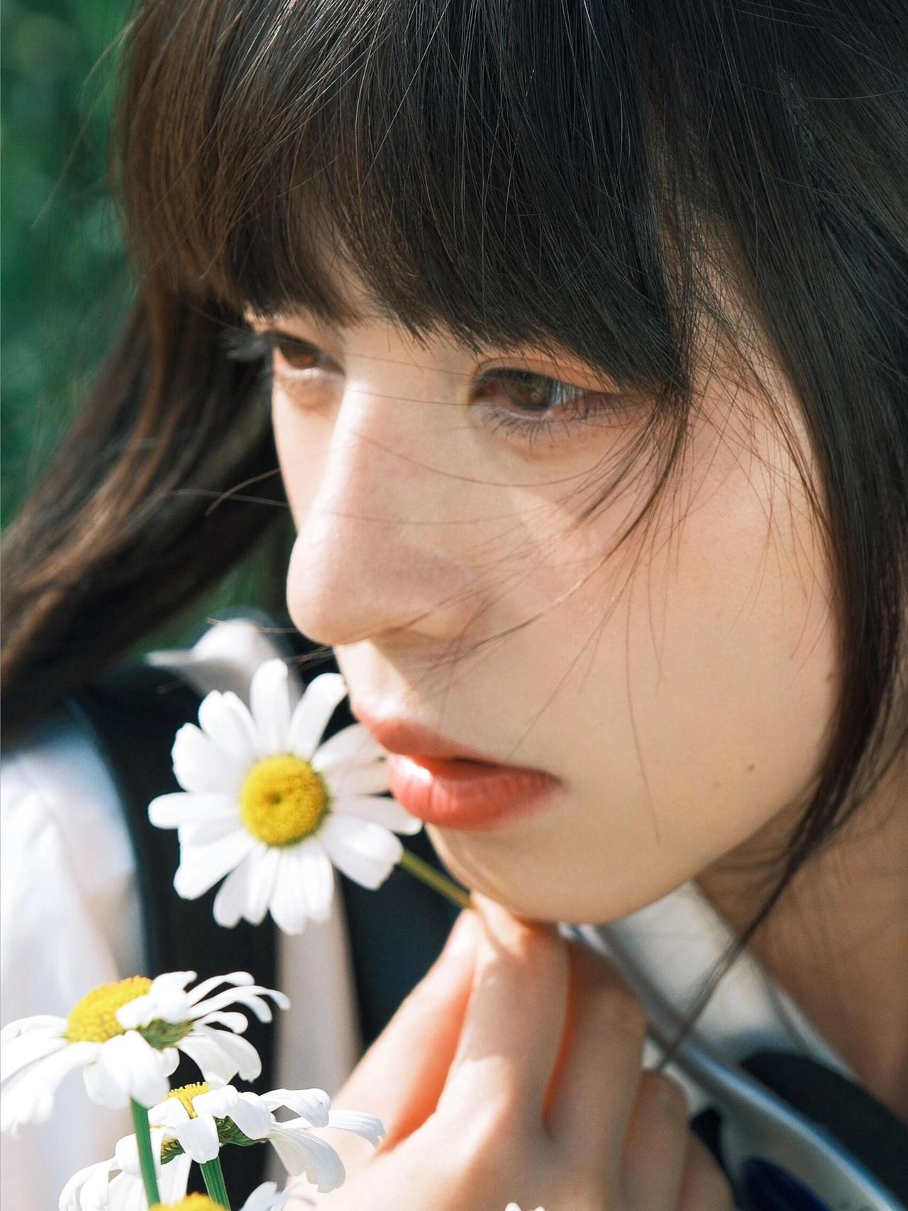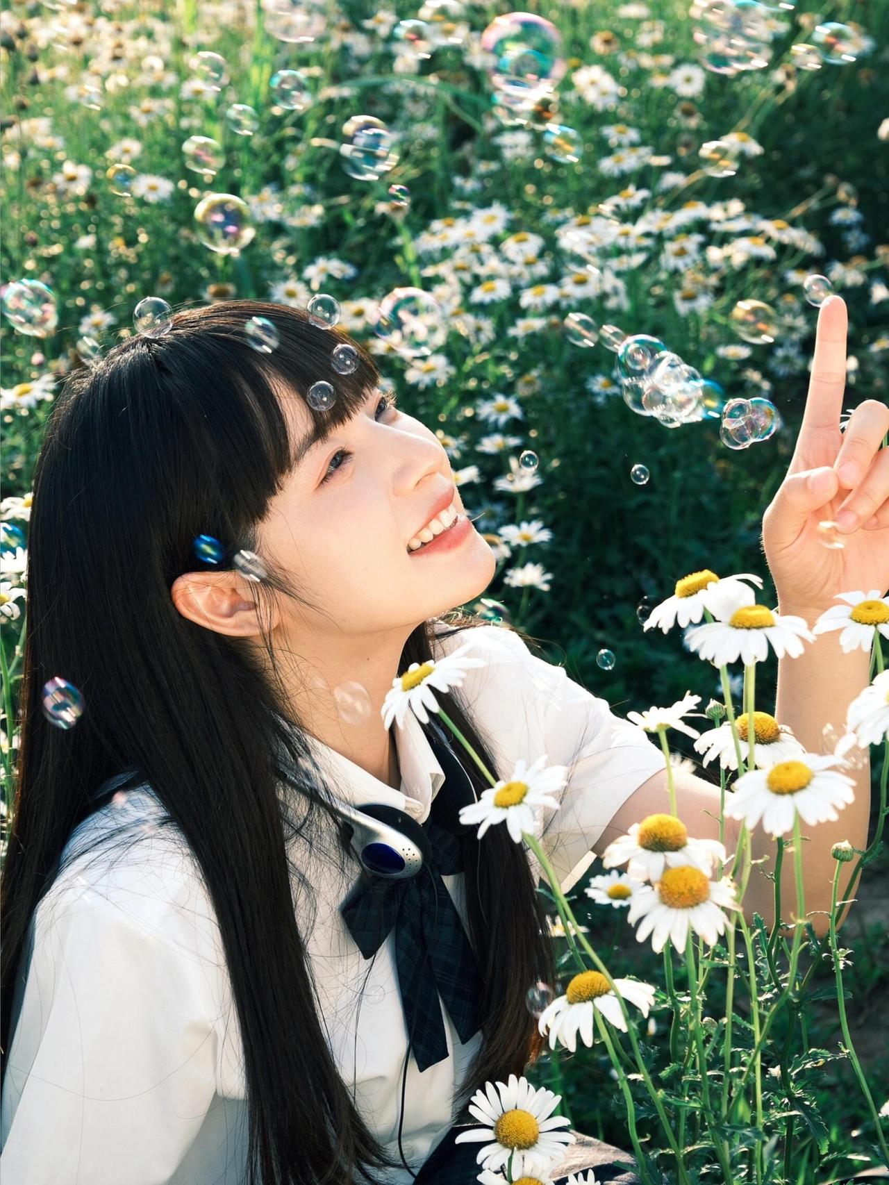 一组好的作品,离不开摄影师对构图逻辑与场景叙事的精准把控,让每一张照片都有清晰的情绪表达。在大场景拍摄中,摄影师采用低机位仰拍,将人物置于画面中心,以蓝天为背景、雏菊为前景,既拉伸了空间纵深感,又让人物在自然中显得舒展自由,传递出拥抱世界的青春张力。 中景与特写的切换,让叙事更有层次。中景捕捉人物与泡泡互动的瞬间,用动态元素打破静态摆拍的呆板,让画面充满灵动的生气;特写则聚焦于人物的眼神与表情,用浅景深虚化背景,突出人物的情绪,无论是触碰泡泡的笑意,还是轻嗅雏菊的温柔,都让人物形象更立体鲜活。 前景的运用是一大亮点,摄影师多次用雏菊作为前景,形成自然的框架构图,既遮挡了杂乱的背景,又让画面有了呼吸感,同时强化了雏菊的主题,让人物与环境深度融合。色彩搭配上,以白、绿、蓝为主的清新色调,契合青春主题,没有过度调色,保留了自然的质感,让每一张照片都充满治愈感,实现了技术与审美、情绪与场景的完美统一。