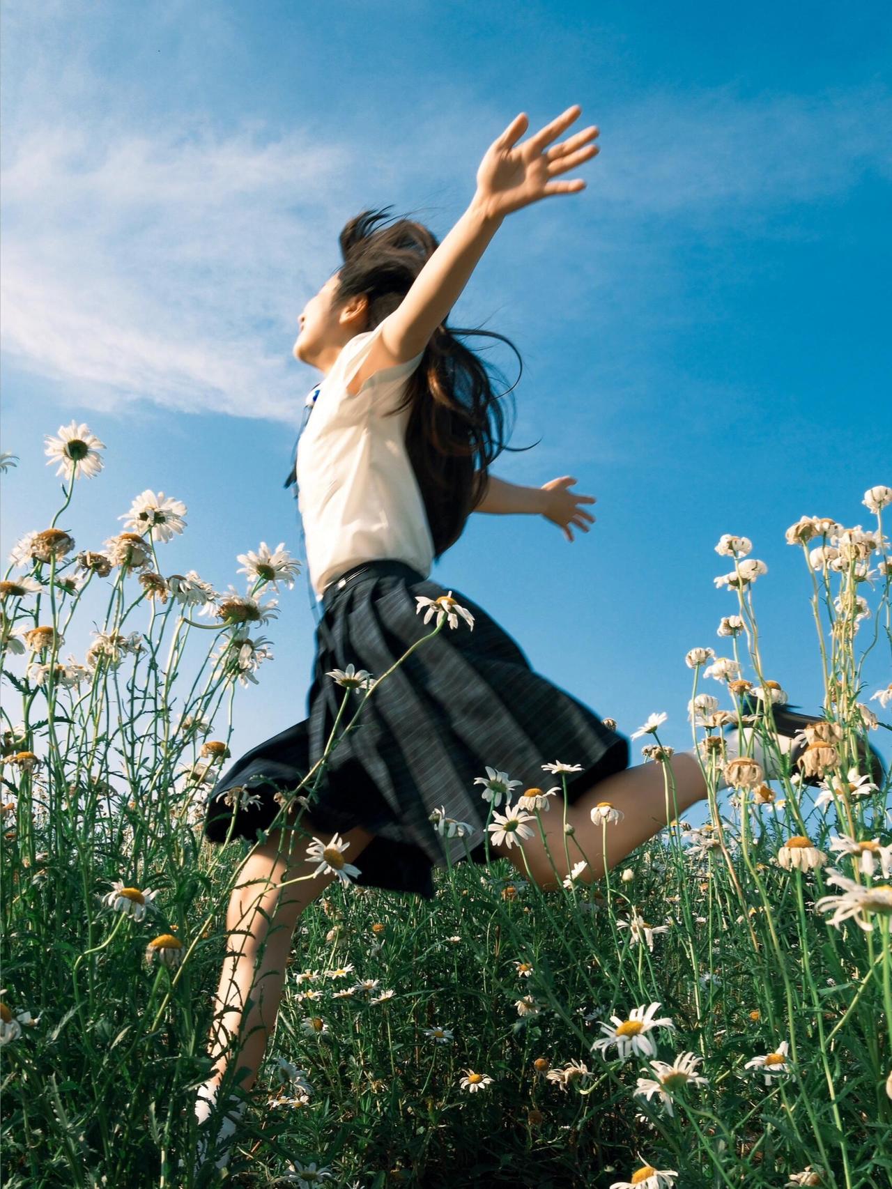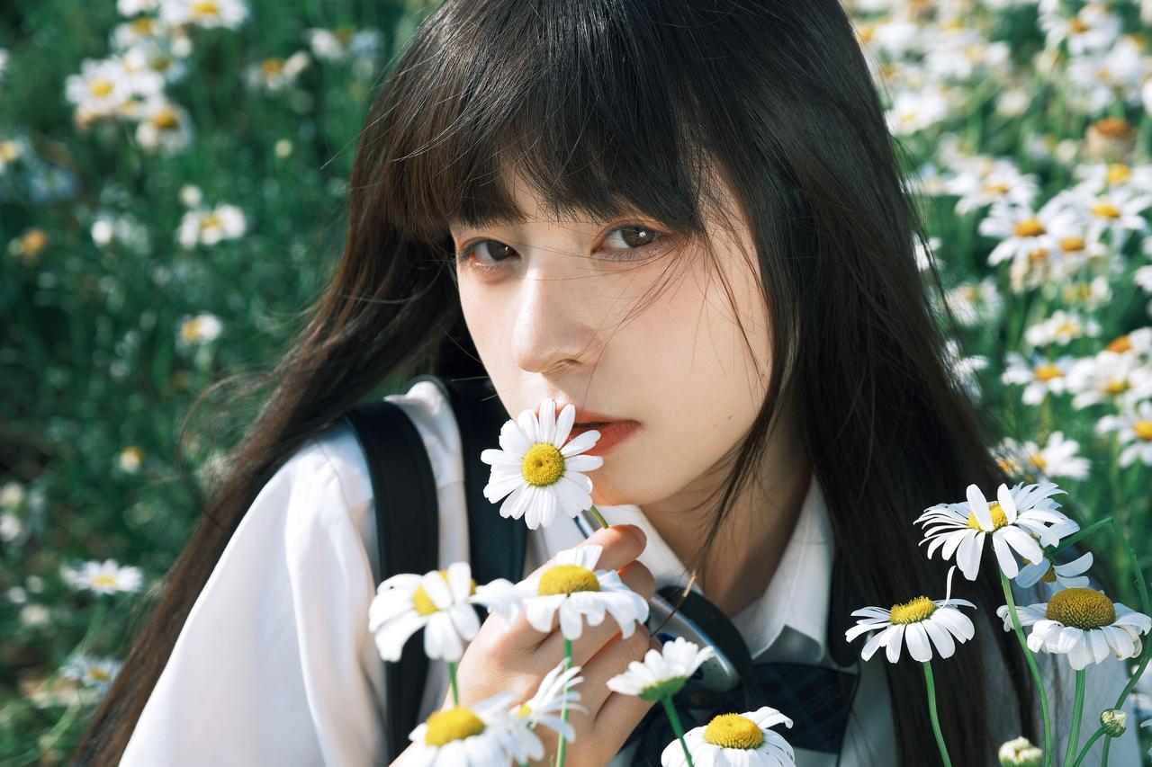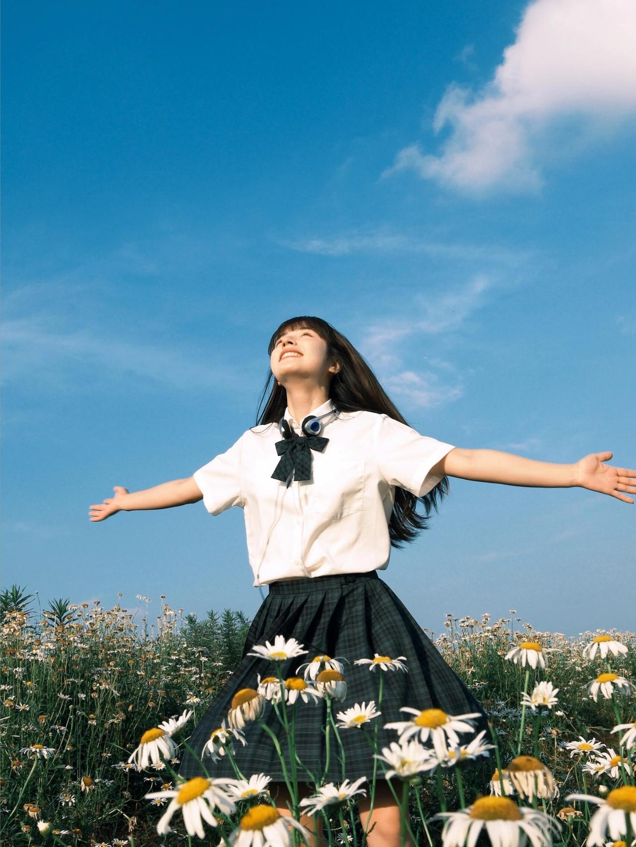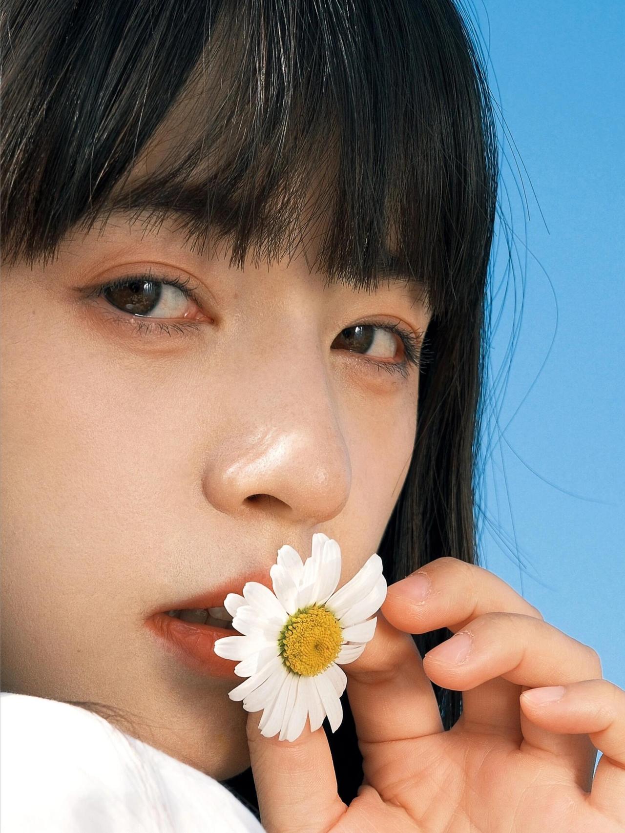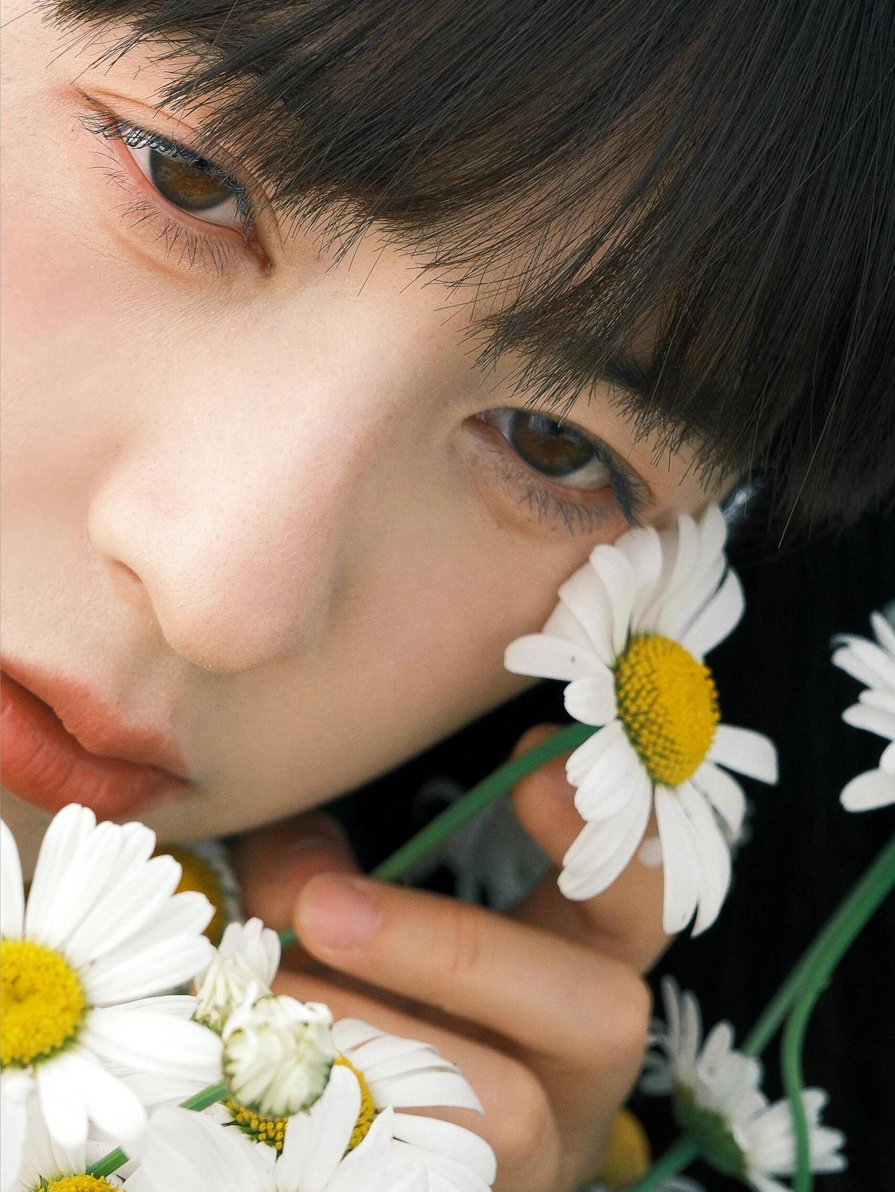 一组好的作品,离不开摄影师对构图逻辑与场景叙事的精准把控,让每一张照片都有清晰的情绪表达。在大场景拍摄中,摄影师采用低机位仰拍,将人物置于画面中心,以蓝天为背景、雏菊为前景,既拉伸了空间纵深感,又让人物在自然中显得舒展自由,传递出拥抱世界的青春张力。 中景与特写的切换,让叙事更有层次。中景捕捉人物与泡泡互动的瞬间,用动态元素打破静态摆拍的呆板,让画面充满灵动的生气;特写则聚焦于人物的眼神与表情,用浅景深虚化背景,突出人物的情绪,无论是触碰泡泡的笑意,还是轻嗅雏菊的温柔,都让人物形象更立体鲜活。 前景的运用是一大亮点,摄影师多次用雏菊作为前景,形成自然的框架构图,既遮挡了杂乱的背景,又让画面有了呼吸感,同时强化了雏菊的主题,让人物与环境深度融合。色彩搭配上,以白、绿、蓝为主的清新色调,契合青春主题,没有过度调色,保留了自然的质感,让每一张照片都充满治愈感,实现了技术与审美、情绪与场景的完美统一。