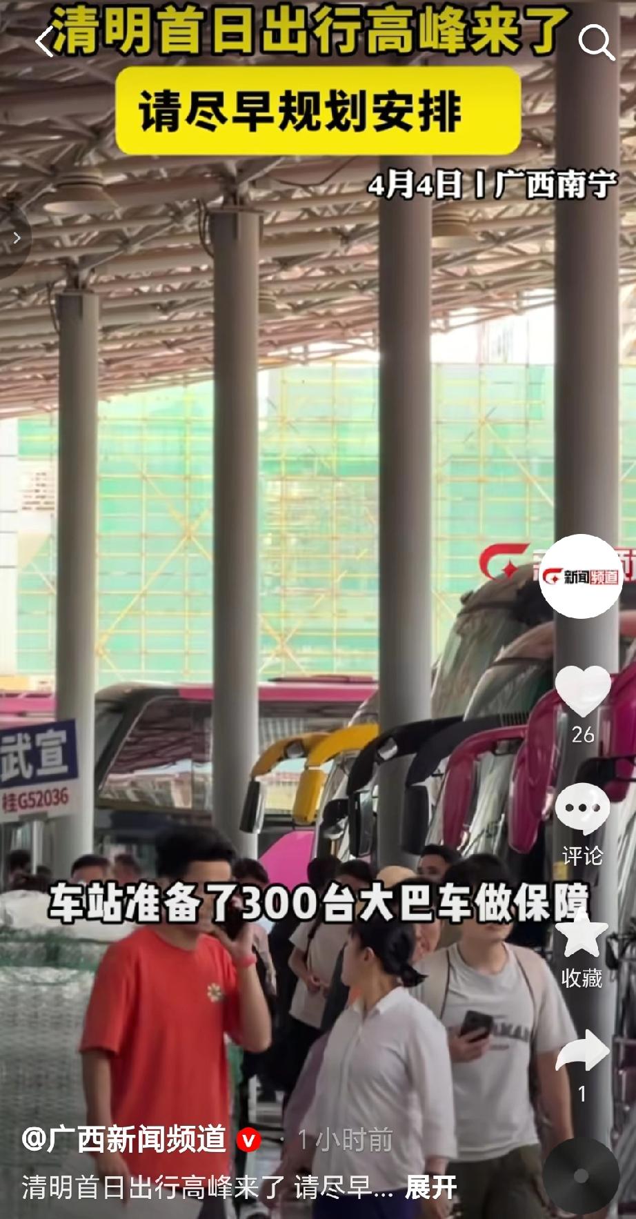 清明节假期第一天南宁出城人流情况, 汽车站客流,南宁琅东汽车站从8点到下午6点客流处于高位,预计2.5万到3万人次,是平时周末客流量(约8000人次)的3倍多,车站准备了300台大巴车保障运输。高速公路车流:截止4月4日下午15时,广西全区高速公路出入口总车辆为296.05万辆次,与2025年同比增长6.90%。 火车站客流:4月3日至4月4日,南宁车站发送旅客28.89万人,其中南宁站7.0万人,南宁东站20.5万人,同比增长21.9%。(来源于@广西新闻频道 )