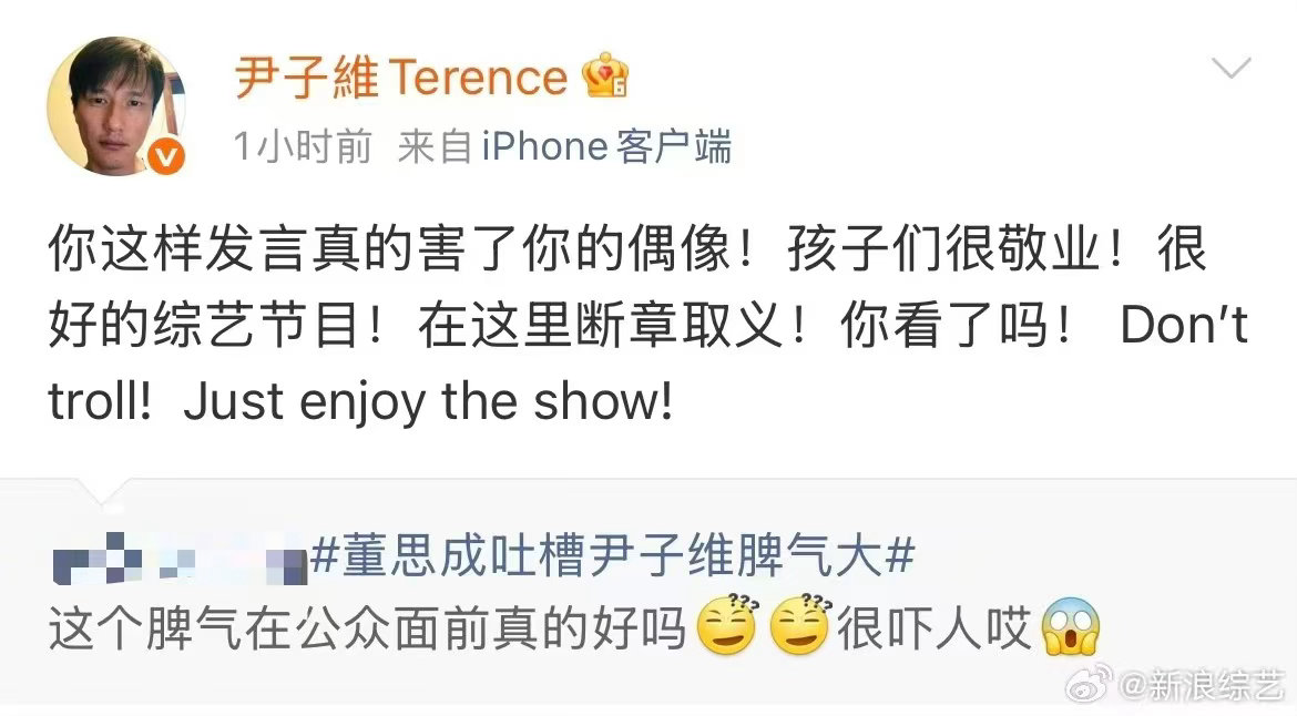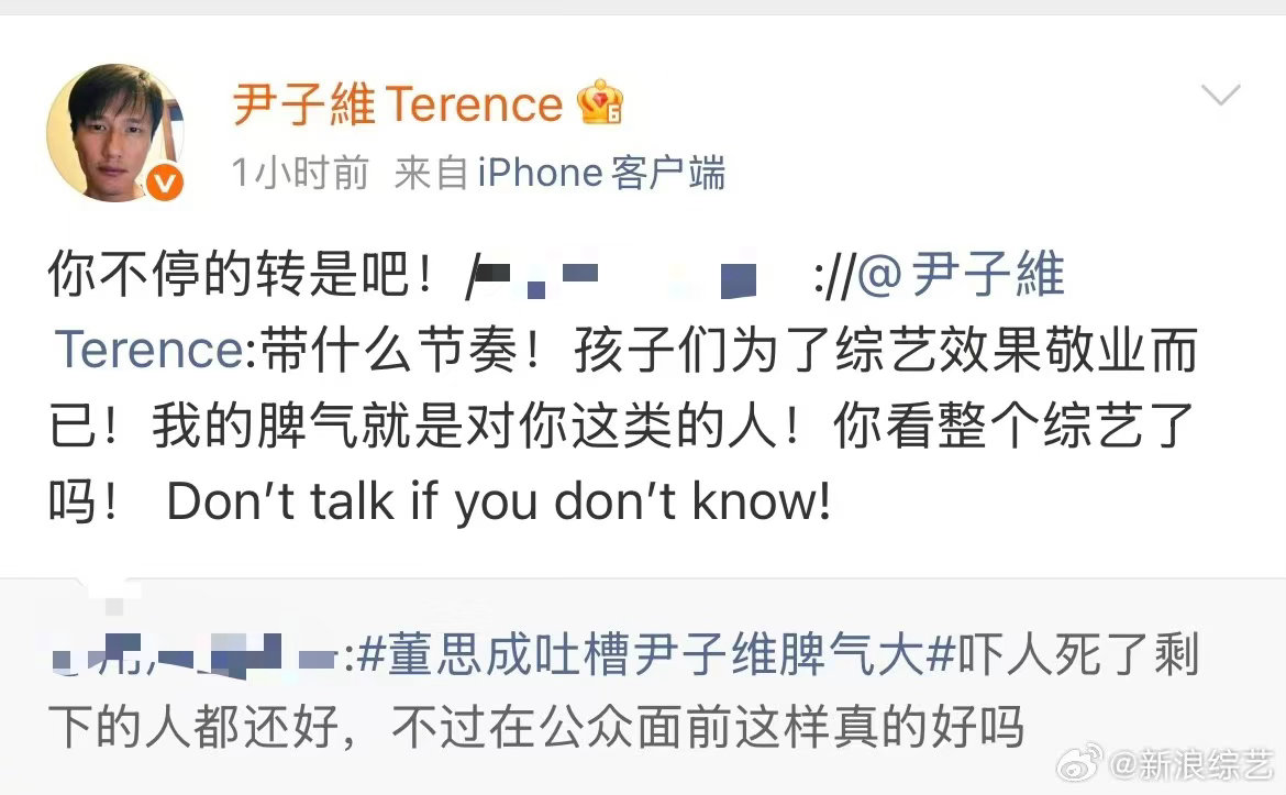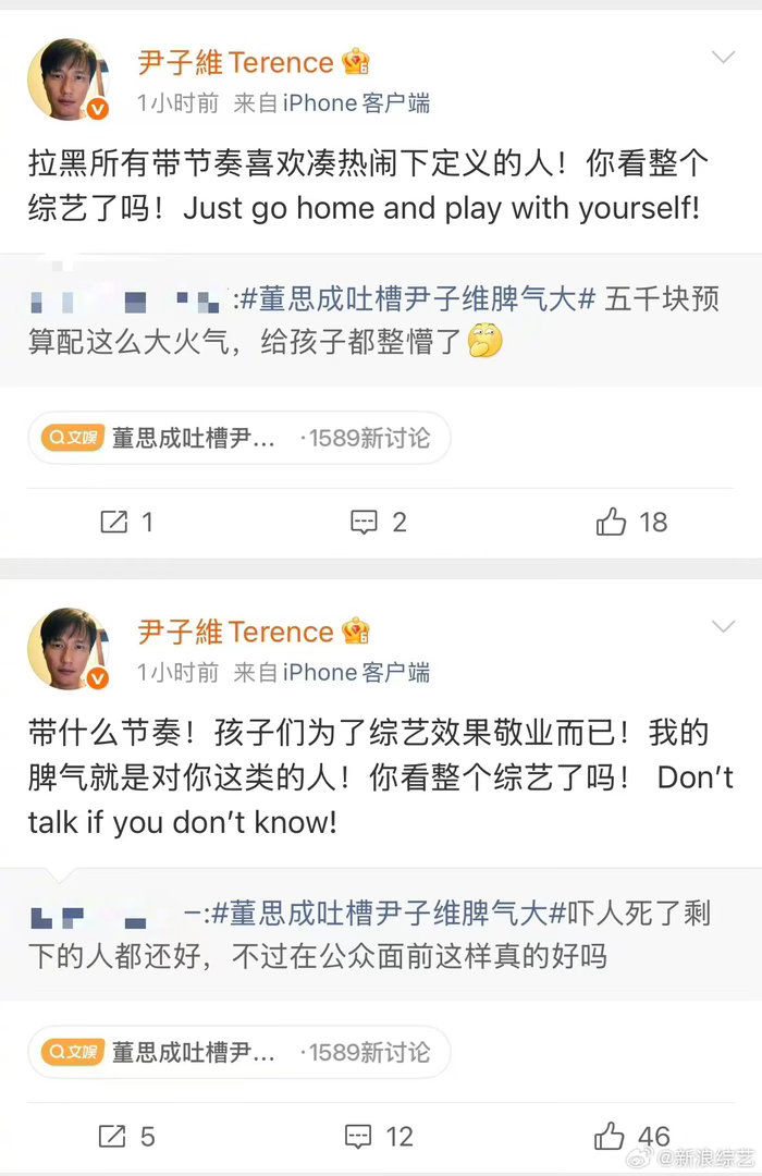 尹子维回应恶评称被带节奏尹子维怒发五条微博 针对网络上关于“董思成吐槽尹子维脾气大”的讨论,尹子维今日连发数条动态“带什么节奏!孩子们为了综艺效果敬业而已!我的脾气就是对你这类的人!”同时强调“Don't talk if you don't know!”,呼吁大家不要断章取义