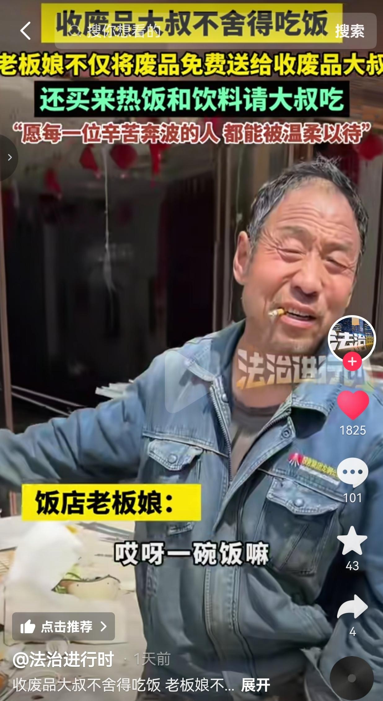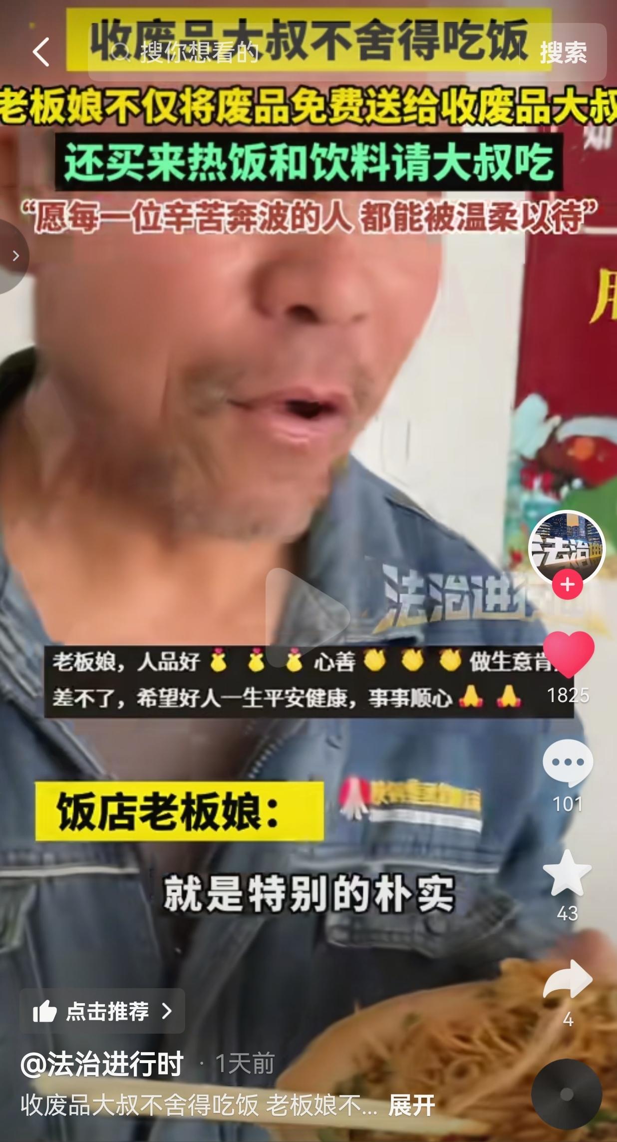 破防了!就这两天陕西这家饭店老板娘的操作,直接给我整得鼻子发酸,这才是咱们普通人最该追的“顶流”! 事情是这样的:这家饭店正在新店装修,清出来一大堆废纸箱、旧家具、拆下来的金属边角料,堆得门口都快放不下了。 中午的时候,门口过来一位收破烂的大叔,穿的工服洗得发白、磨起了毛,裤腿上还沾着干活的灰,一看就是天天在外面风吹日晒、靠力气吃饭的老实人。 老板娘当时就说了,这堆废品全给大叔,一分钱不要!大叔一开始还不敢信,反复确认了好几遍,才赶紧上手收拾,把废铁、纸箱一趟趟往自己的三轮车上搬,干得满头大汗。 大叔进去收拾废品的时候,店里的工人正好准备去隔壁饭馆吃饭,老板娘就顺嘴喊大叔:“叔,跟我们一起去吃点吧!” 结果大叔头摇得跟拨浪鼓似的,一个劲往后退,脸都涨红了,嘴里念叨着:“不去不去,嫌花钱呢,我不饿。” 老板娘又说:“我请客,你不用掏钱!”大叔还是不好意思,搓着手说啥都不肯去,就怕给别人添麻烦。 老板娘看着大叔那朴实又拘谨的样子,心里一下就酸了——她太懂了,大叔哪里是不饿,是舍不得花那十几块钱的饭钱! 为了多攒点钱,说不定一天就啃俩馒头对付,连一口热乎饭都舍不得给自己买。 老板娘没再多劝,转头就给大叔买了一份热乎的炒面,还带了一瓶冰饮料,直接端到大叔面前,催着他:“叔,快吃快吃,不要钱!” 大叔当时就愣住了,手里攥着皱巴巴的钱非要给,吃完了还追着老板娘要付饭钱、付废品钱,嘴里一个劲念叨“我掏钱呢”,老板娘全给挡回去了:“饭请你吃,废品也不要钱,我请你吃的,哎呀一碗饭嘛,多大点事!” 就看着大叔捧着那盘炒面,狼吞虎咽地吃着,脸上又不好意思又感动,眼角都红了,那模样,谁看了不心疼? 网友看到后评论说:就冲老板娘这人品,这饭店以后生意绝对火到爆!好人就该有好报! 也有的网友说:太懂这种舍不得吃饭的感觉了!在外打拼谁没为了省钱饿过肚子?老板娘这一下,直接暖到骨子里了! 还有的网友说:咱陕西人的实在就体现在这了!不玩虚的,用行动暖人,给老板娘点赞! 也有的网友说:看着大叔吃饭的样子,我眼泪都下来了。谁不是上有老下有小,拼尽全力在生活?愿每个辛苦的人都能被温柔以待! 我真的越看越心酸,越看越暖心!心酸的是,多少像大叔这样的底层劳动者,为了生活省吃俭用,连一顿热饭都舍不得吃;暖的是,总有人在你看不见的地方,用最朴素的善意,给你撑一把伞。 老板娘图啥?她一分钱没赚,倒贴了饭钱,还白送了能卖钱的废品。她就是见不得辛苦人受委屈,就是见不得老实人舍不得吃饭!这种善良,不是摆拍,不是作秀,是刻在骨子里的善良,是咱们中国人最珍贵的人情味! 现在网上全是炫富、撕逼、博眼球的烂事,可真正能戳中我们的,永远是这种普通人之间的双向奔赴。大叔的朴实,老板娘的善良,没有一句豪言壮语,却比任何鸡汤都有力量! 我就想说,别再追那些流量明星了,这种善良的老板娘、朴实的劳动者,才是咱们该捧的人! 最后我想说:生活或许有万般辛苦,但总有人用善意,给你点亮一束光。愿每一个为生活奔波的人,都能被世界温柔以待;愿每一份善良,都能被看见、被传递、被珍惜!