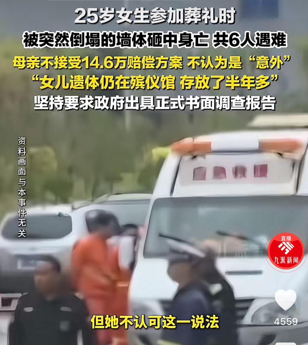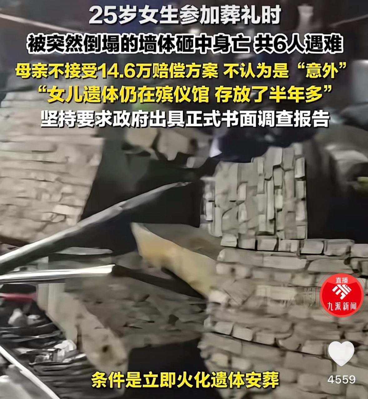 云南一女子,参加亲戚葬礼,不幸被倒塌的墙体砸中,当场死亡。同时,还有另外5人遇难。当地多个部门介入调查后口头表示,该事故纯属意外,并提出每户给予14.6万的补偿,其中Z府出资6.6万,主家出资8万,其他5户人家均同意,只有女子母亲拒绝接受赔偿,她表示,倒塌的墙体是人为搭建的,丧宴现场也是人为布置的,所以,她不认可事故被认定为意外的这一说法。 2025年9月10号,吕某前去参加亲戚刘某家举办的葬礼。 谁也没想到,这一去,竟让吕某的人生画上了句号。 刘某家当天摆了100多桌宴席,宴请前来吊唁的宾客,这排场,在十里八乡都是少见的。 由于宴席非常隆重,且声势浩大,他家的院落根本承载不了100多桌,于是就借用了堂兄弟家的院坝。 吕某当天正是在此院坝中坐席吃饭,突然,身旁的墙体倒塌,砸中了吕某这一桌宾客,吕某当场死亡,遇难的还有其他5位前来吊唁的亲朋好友。 原本沉痛的氛围,因这场事故,更加的沉痛。 事后,当地多个部门出动联合调查小组,给出的结论是,该起事故属于意外。 并提出给遇难者家属每户赔偿14.6万,Z府出资6.6万,主家出资8万,条件是立即火化遗体安葬。 其他5户人员均同意此解决方案,唯有吕某母亲陈某一人拒绝此赔偿。 陈某自始至终都不认可该事故被认定为意外这一说法,理由有二。 其一,她认为,院坝的墙体是人为搭建的,没有按照相关标准搭建,本身存在安全隐患。 陈某的这一说法,也不是空穴来风。 事发后不到一个月,当地应急管理部门给出了调查结论: “涉事墙体高3米,没有构造柱,属于独立式、屏风形照壁形围墙,两端没有刚性连接,本身存在安全隐患。” 陈某又针对此调查结果,进行了补充说明: “涉事砖墙长约10米,原本只有五六十公分高,是“后期加高”到了3米,倒塌的正是加建部分的墙体。” 而《工程建设规范》中,有明确规定:当墙长大于 4m 时,应在墙体中部设置芯柱或混凝土构造柱。 然而,事故院坝中的墙体,并没有做到此规范。 其二,陈某称,宴现场也是人为布置的。 在此院落墙体缺乏安全性的情况下,群众缺乏安全意识,私自拉接大面积篷布。受下雨和瞬时风力影响,独立围墙超过自身应力倒塌。 以上,是陈某拒绝将该事故认定为意外的原因。 为此,她一直没有接受14.6要的赔偿,而女儿吕某的尸体也一直停放在殡仪馆,已经半年之久。 这大半年,陈某一直在维权,坚持要相关Z府部门出具一份正式的调查报告。 依据:《生产安全事故报告和调查处理条例》(国务院493号令):造成3人以上死亡属较大事故,县级以上政府应当组织调查组、出具书面报告、认定责任。 口头“意外”无法律效力,不能作为定责/免责依据。 本案中,造成 6人死亡,属于较大伤亡事件,Z府部门不能仅口头定性。 家属有权要求书面调查结论、查明倒塌原因、区分责任。 当地部门与陈某对此事的看法,不同之处在于,当地部门认为是意外事故,而陈某认为是“建筑物倒塌致人死亡”的侵权纠纷。 所以,陈某坚持进行责任划分,和有关部门出具报告书。 毕竟,此事故一旦被认定为侵权责任,陈某拿到手的赔偿金,包括(死亡赔偿金、丧葬费、被扶养人生活费、精神损害抚慰金等)不止14.6万。 站在陈某的角度,很能理解她维权的坚定信念,毕竟女儿吕某才25岁,她不仅要承受白发人送黑发人的苦楚,未来的养老问题,也没有个着落。 对此,你怎么看!