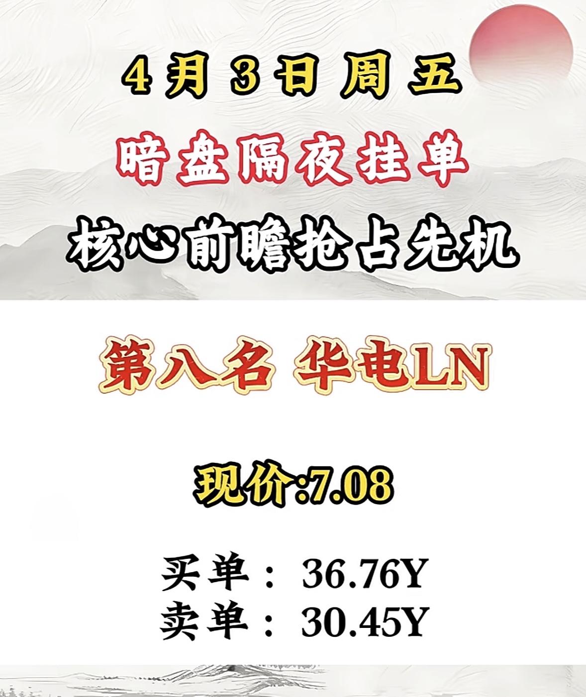 4月7日暗盘隔夜挂单,华电辽能这只股票可太有看头了。现价7.08,买/卖单分别达到36.76亿和30.45亿,这交易规模相当惊人啊。暗盘就像一场提前的较量,有人想借此抢占先机。这么大的买卖单,说明市场对它关注度超高。是有什么利好消息要来了,还是大资金在布局呢?说不定有人已经提前掌握了一些内幕。不过暗盘交易也有风险,这大笔资金的博弈,最后谁能笑到最后还真不好说。咱就拭目以待,看看后续它在正式交易中的表现吧。