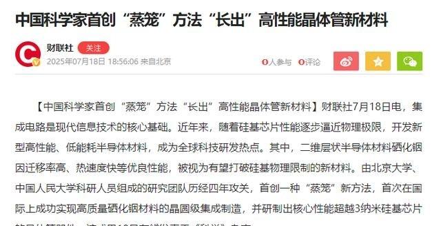 这下好了,美国人开始怀疑人生:“我们天天封锁、天天断供,结果你居然搞出个我们没封到的物种?” 美国从2018年起加强半导体出口管制,针对先进计算芯片、制造设备和相关技术设置限制,目的是维持自身在高端领域的优势,同时应对供应链安全和军事应用方面的考虑。这些措施覆盖了硅基晶体管相关的工具、材料和知识产权交易,很多设备需要许可证才能出口到特定地区。 中国团队没有硬碰硬继续深挖受限的硅基路径,而是选择二维材料中的硒化铟(InSe)。这种材料由铟和硒组成,电子迁移率理论值高,热速度也优于硅,在亚纳米节点有潜力。 2025年7月18日发表的成果核心是“固-液-固”生长策略。先通过磁控溅射在蓝宝石衬底上沉积非晶硒化铟薄膜,原子排列不规则。接着把薄膜放入圆形不锈钢容器中央凹槽,外围放置固态铟,盖上石英片密封。 加热时铟熔化成液态,在边缘形成密封圈,蒸汽态铟原子从边缘扩散到中央,与非晶薄膜接触,形成富铟液态界面。非晶薄膜在界面处溶解,原子重新排列成有序晶体,同时密封环境控制硒元素保留,维持接近1:1的化学计量比。 整个过程解决了传统开放加热中硒易挥发导致成分偏差的问题,实现了直径约5厘米的晶圆级制备,薄膜均匀性和结晶质量显著提升。 基于这些晶圆,邱晨光团队构建场效应晶体管阵列。通过优化栅极堆垛、接触材料和沟道参数,器件平均迁移率达到287平方厘米每伏秒,亚阈值摆幅接近67毫伏每十倍电流变化。 100个器件的统计显示峰值迁移率可达347平方厘米每伏秒。在10纳米以下沟道器件中,使用双栅结构和钇掺杂接触,工作电压低至0.5伏左右,电流密度高,漏致势垒降低(DIBL)值小,本征延迟和能量延迟积指标优于当时3纳米硅基技术水平。 弹道输运率达到78%,开关比和室温性能也表现出色。硅基技术在小尺寸下面临短沟道效应和功耗增加,而硒化铟路径利用原子级薄结构和材料本征优势,提供了不同解决方案。 美国限制主要落在硅基制造工具和供应链上,硒化铟依赖自主开发的生长工艺和不同材料体系,减少了对受限设备的直接依赖。团队四年攻关,从非晶薄膜转化到纯相晶圆,一步步迭代工艺参数,验证电学性能。 成果显示,持续的供应限制没有完全堵死所有技术方向,新材料开辟了空间。国际半导体技术路线图对未来节点有性能预测,而这项工作在部分指标上达到了更靠前的要求,说明材料创新能带来实际性能提升。