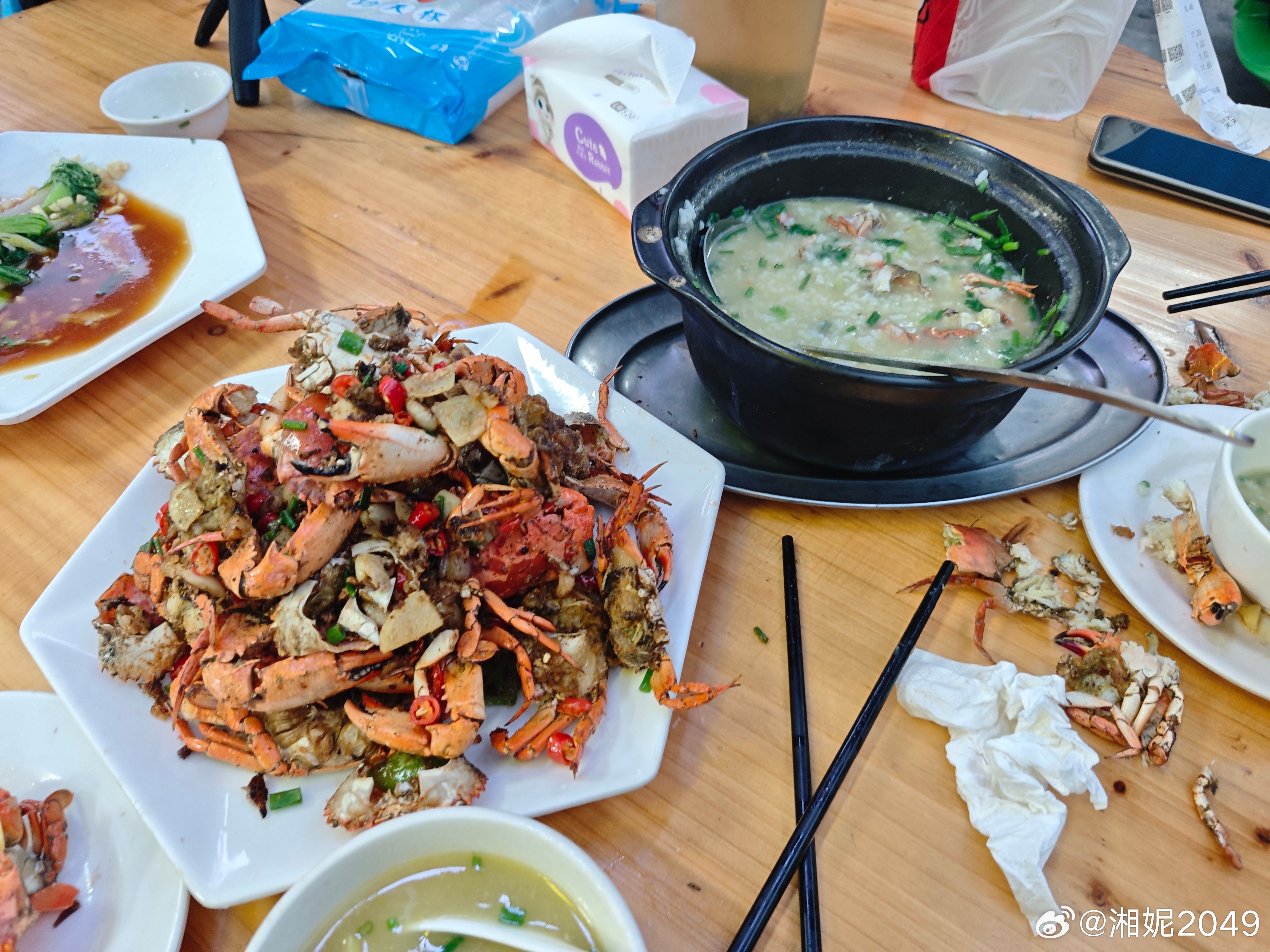 挖完我们就带着自己的大螃蟹去找饭店加工了,这里的价格还可以,煮粥10块钱一斤的加工费,外加38元的粥钱,椒盐做法就15块钱一斤的加工费,我们还额外加了个蔬菜,这顿一共是98~