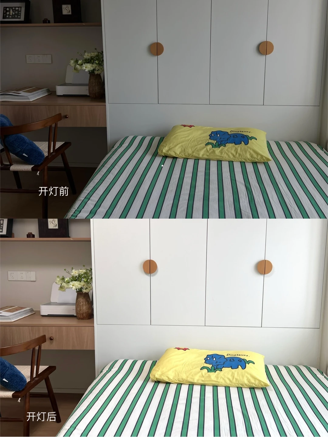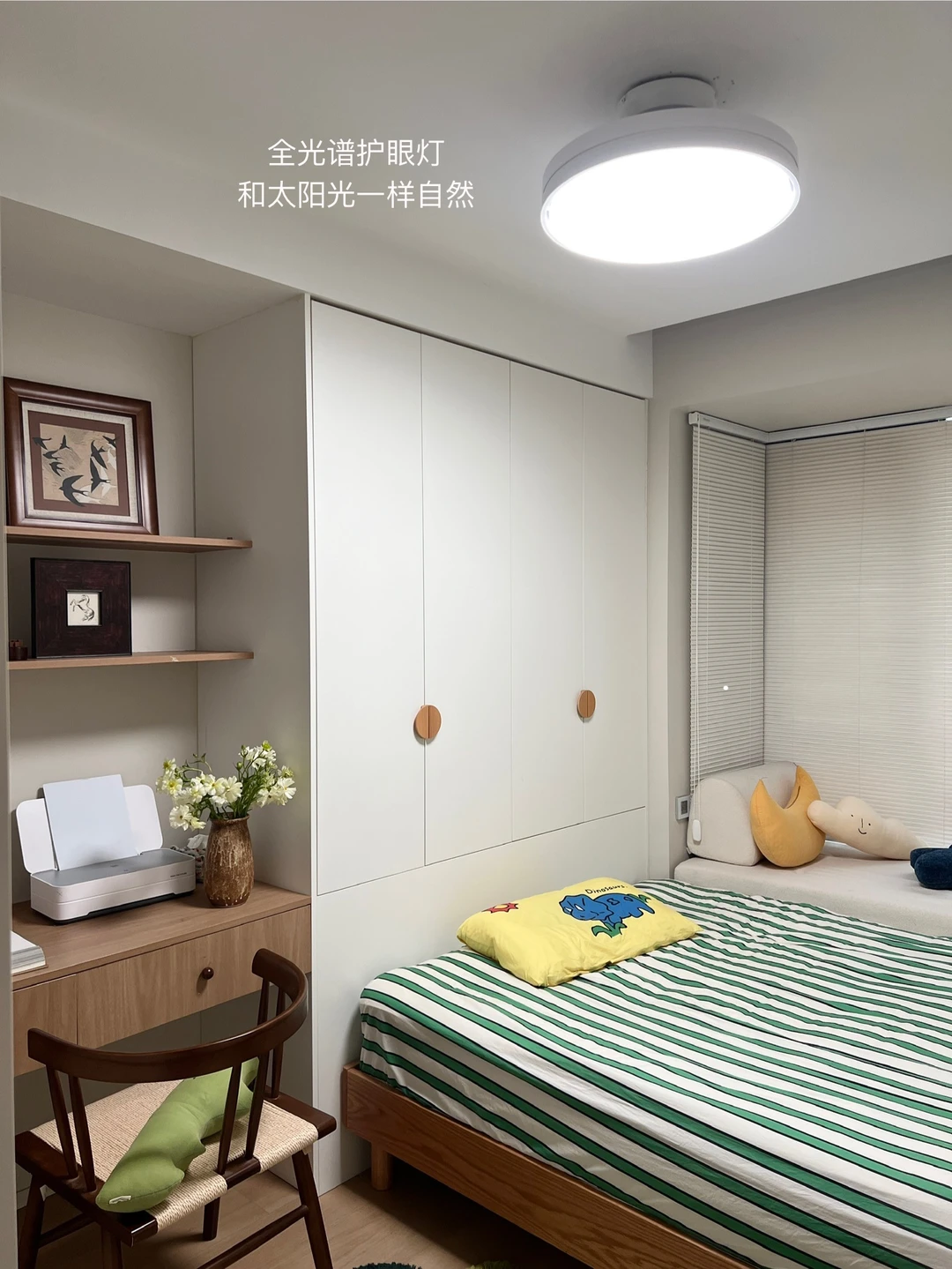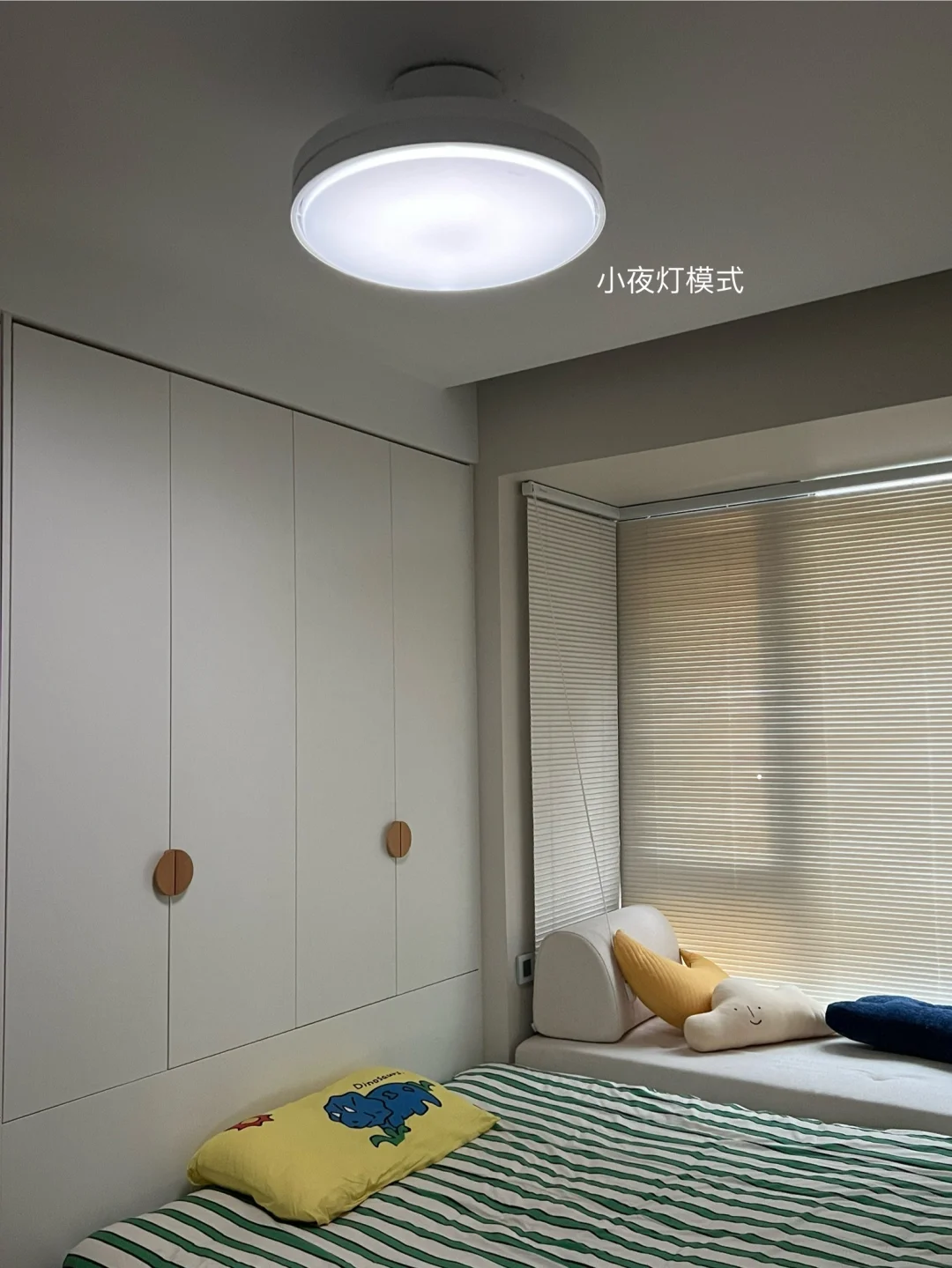 ▫灯光三色可调节,全光谱护眼灯,就像太阳光一样把房间照亮,孩子写作业也够用。 夜里起夜时可以打开夜灯模式,方便又有安全感