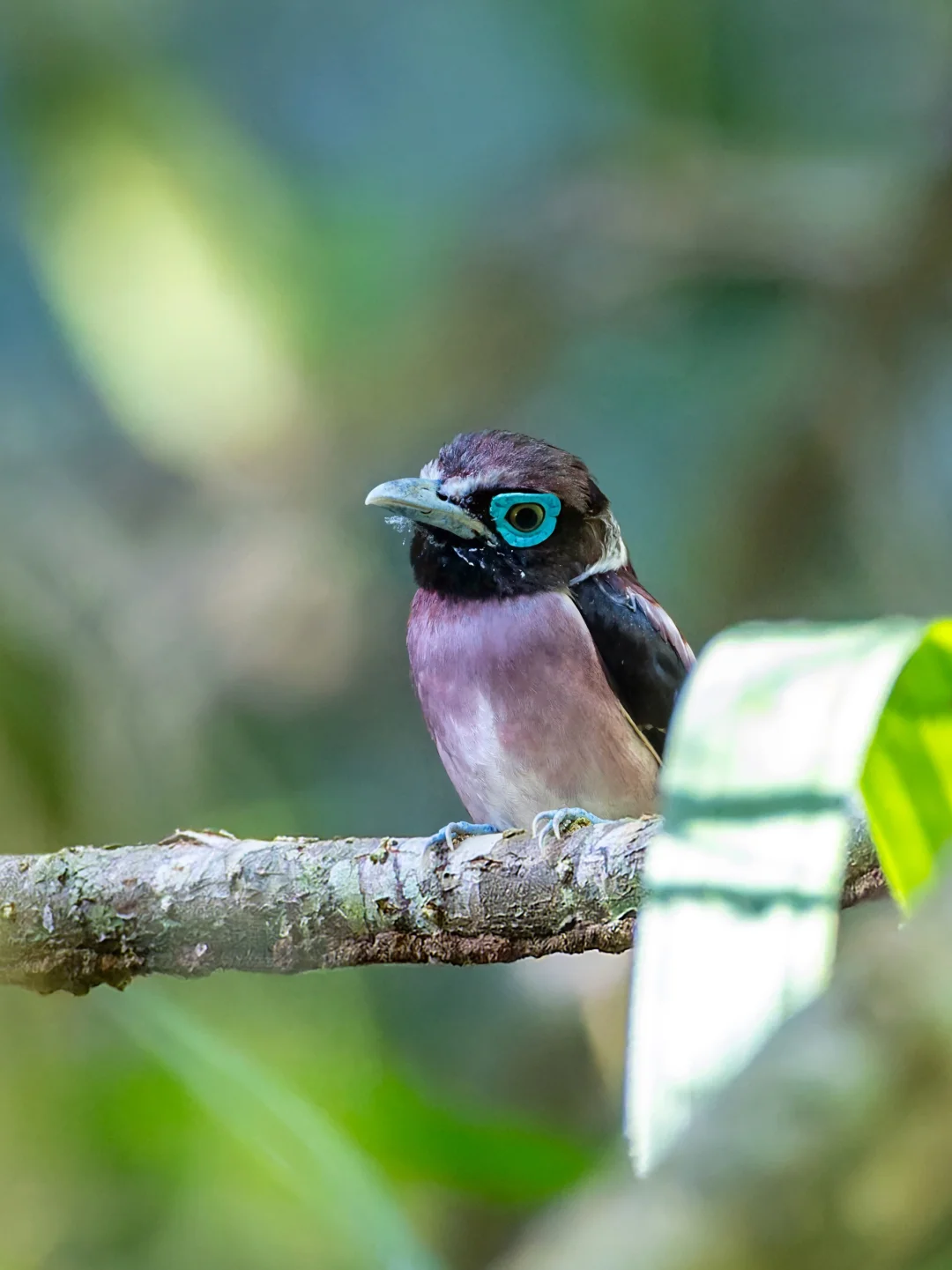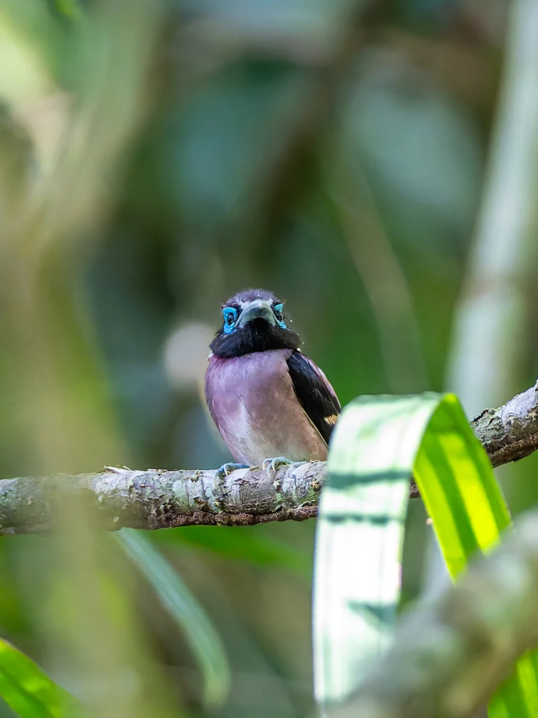 米岛阔嘴鸟这种肉垂阔嘴鸟,最显著的特征当然就是深蓝色肉垂状的眼眶。另外,红棕色的肩背,深紫色的翅膀,并带有白色翼带,雄鸟下体紫色,雌鸟下体纯白,整个小鸟粉紫粉紫的。
