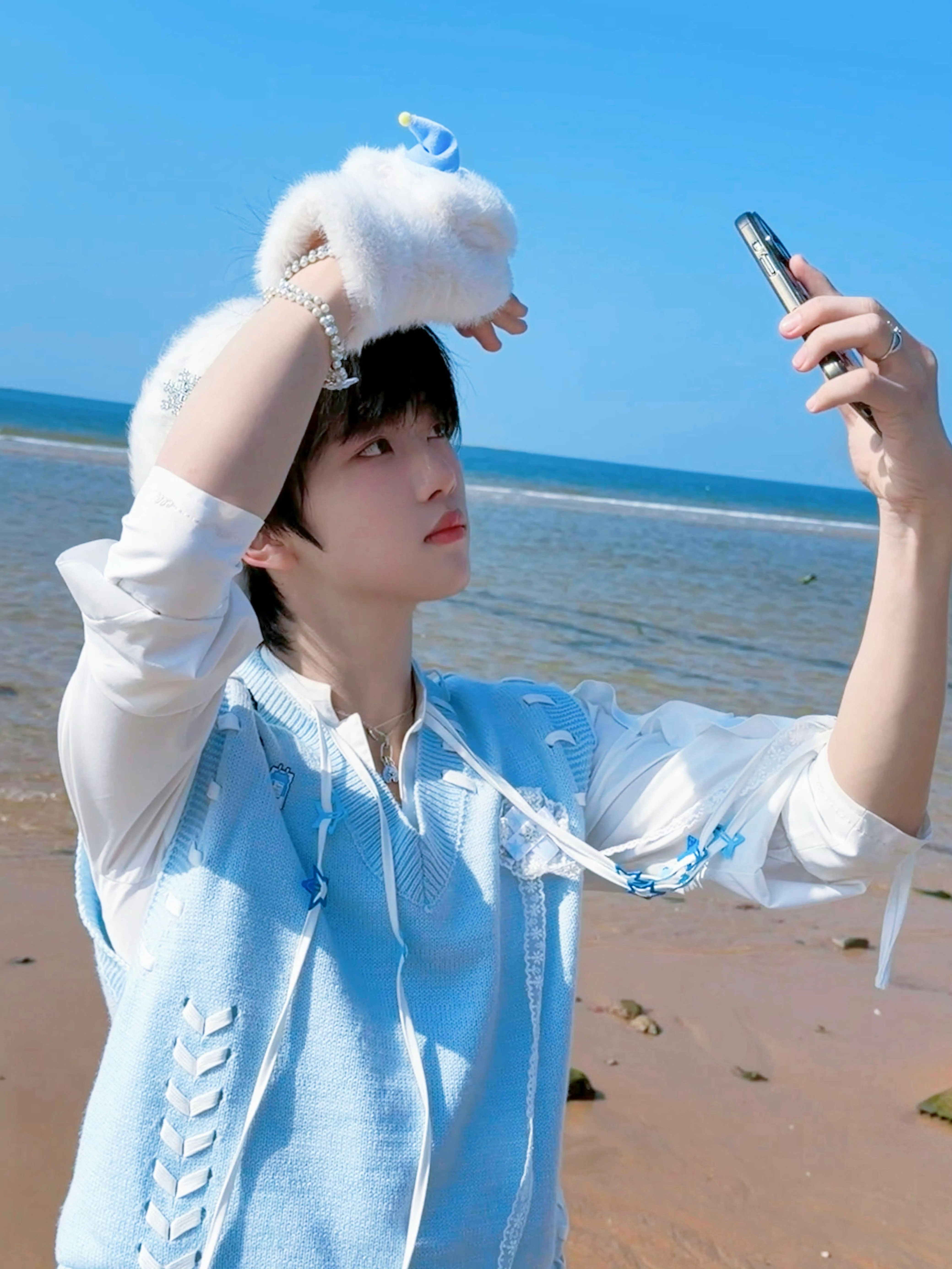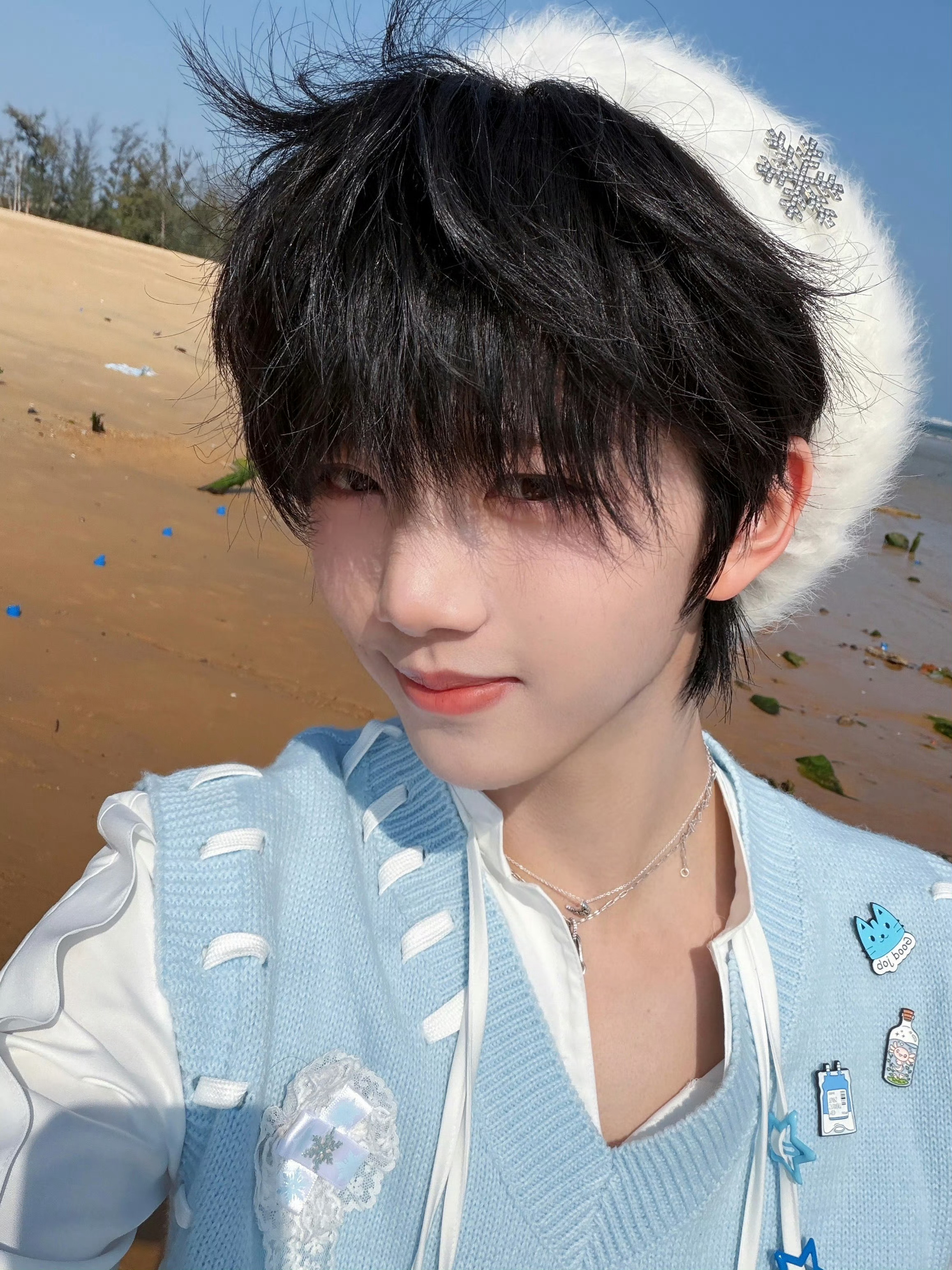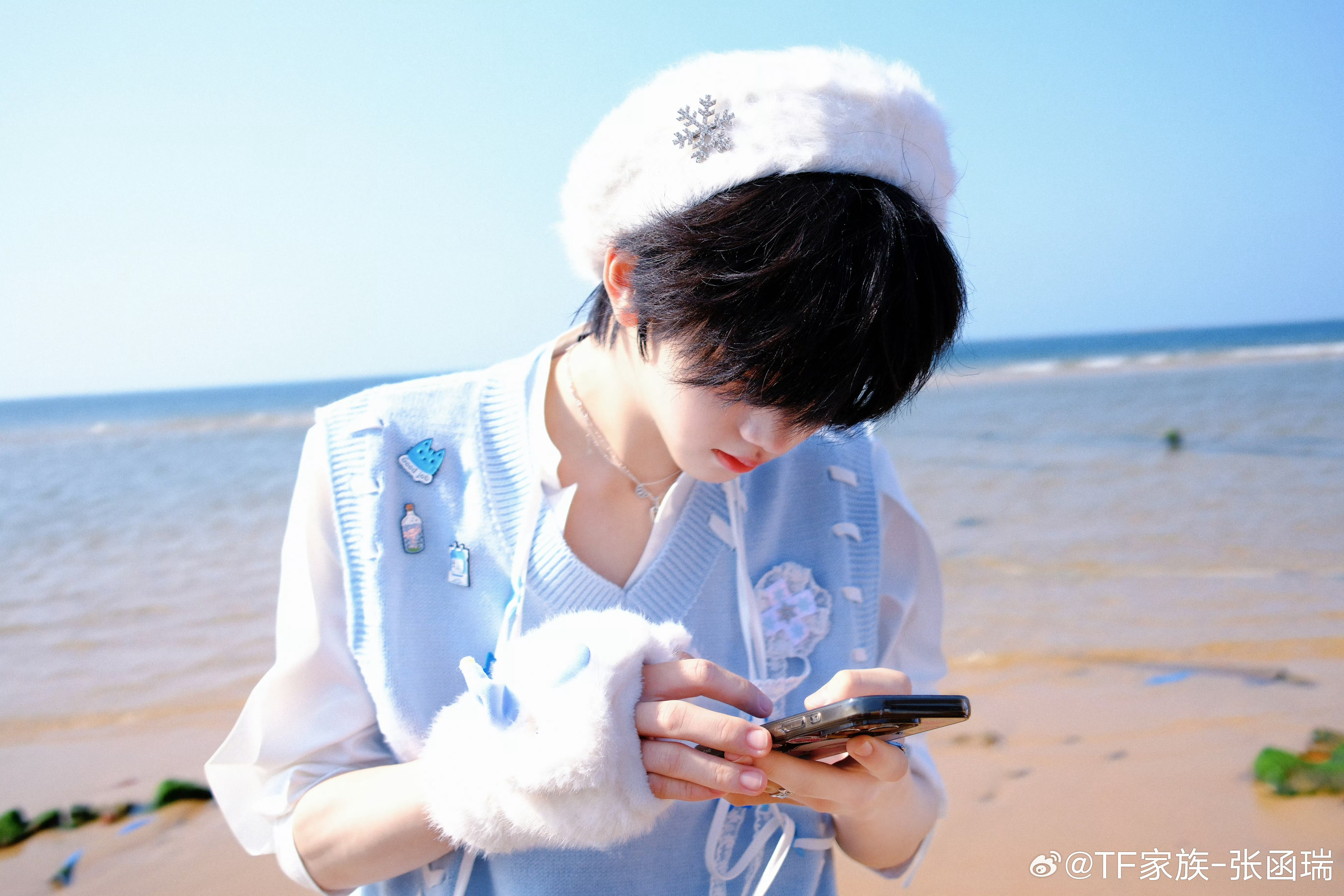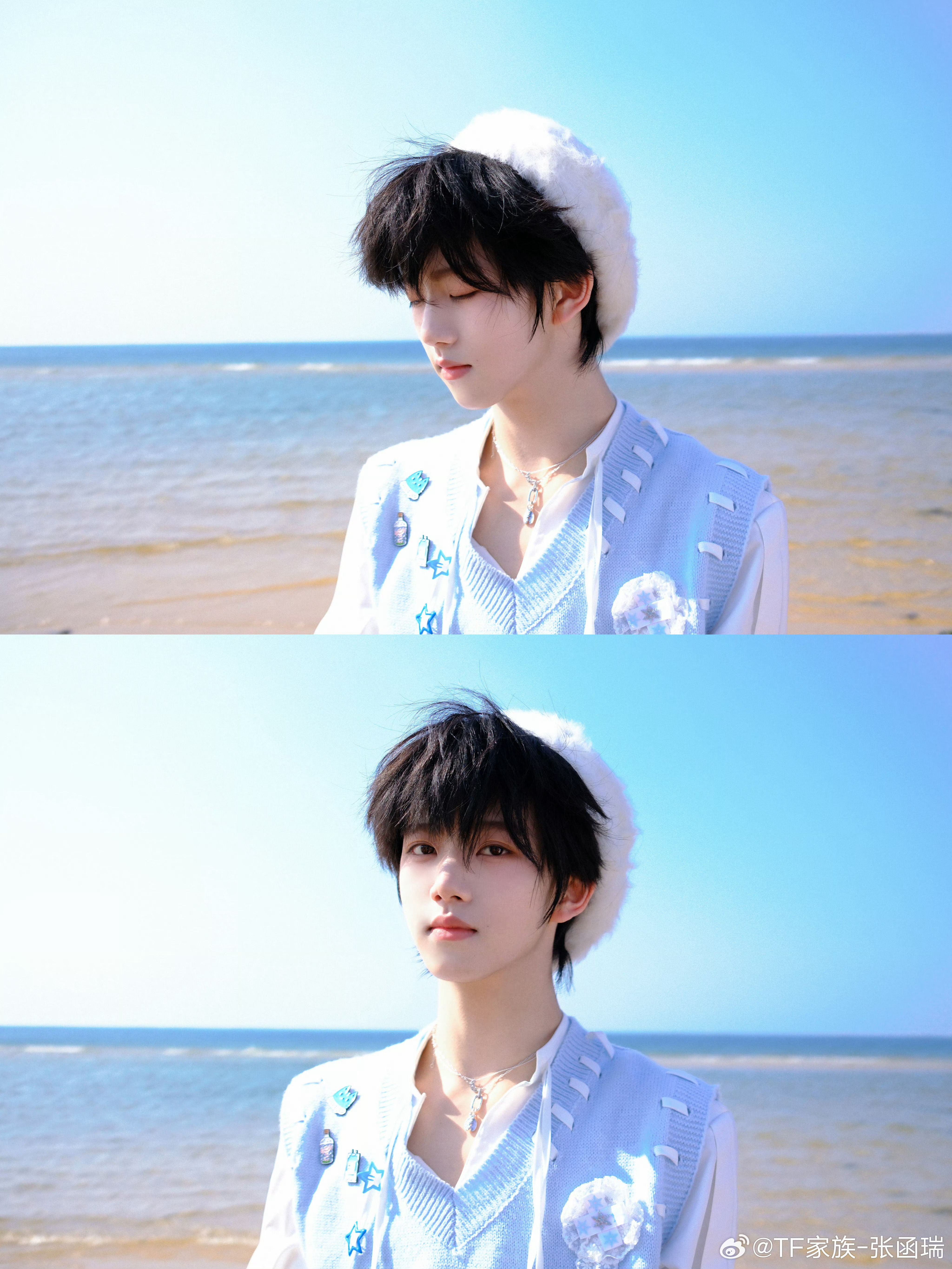 张函瑞海边贝雷帽自拍 被张函瑞的海边贝雷帽自拍直接甜晕了白色贝雷帽+蓝白穿搭灵动又温柔,是从海风里走出来的漫画少年吧🌊张函瑞贝雷帽自拍