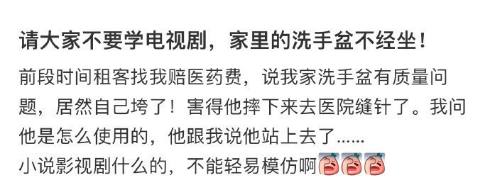 请大家不要学电视剧,家里的洗手盆不经坐!
