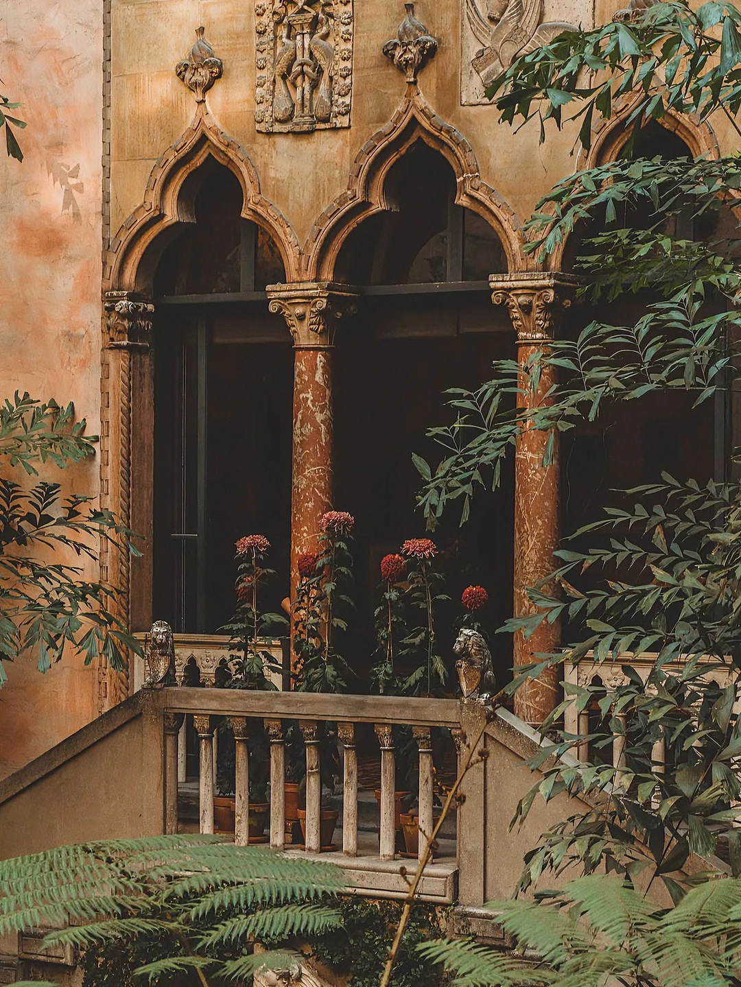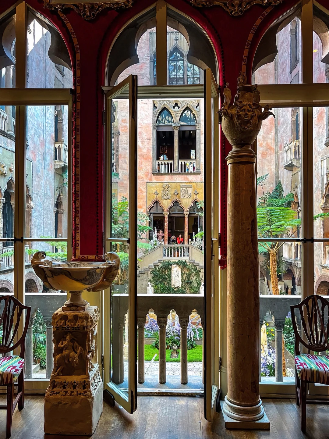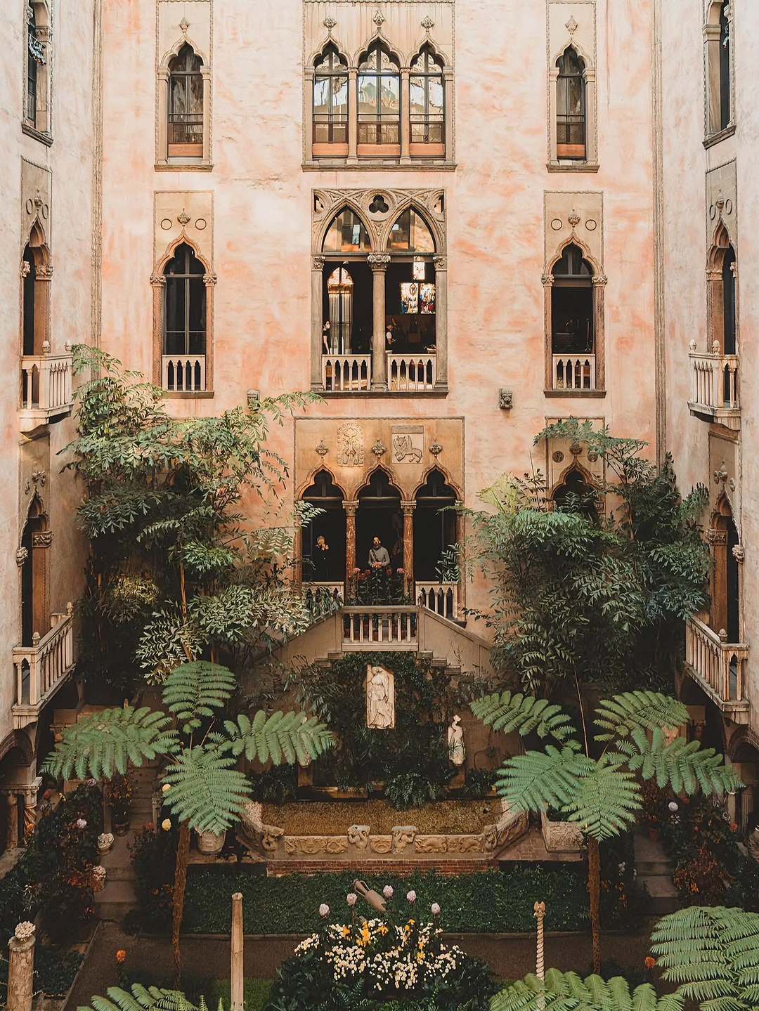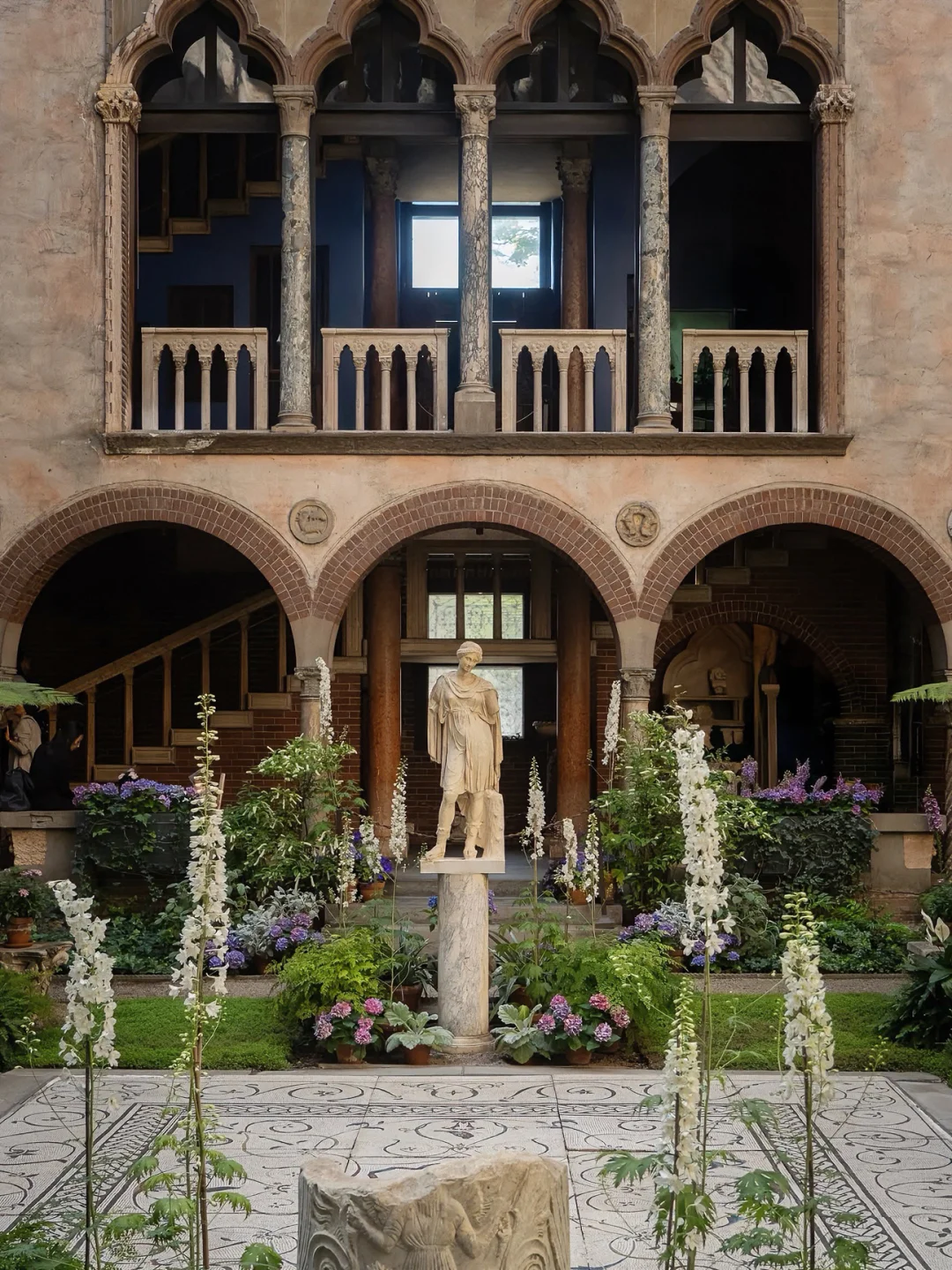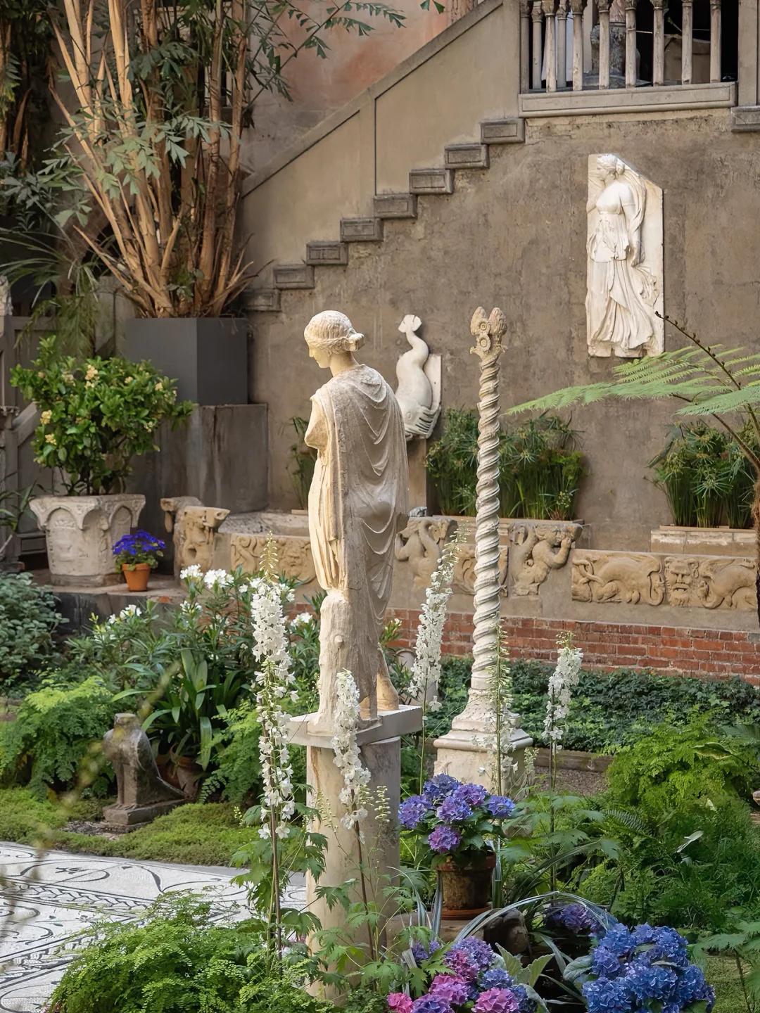 博物馆的外观是15世纪的威尼斯风格Palazzo,博物馆一进门就被中央花园美到失语!四季都有不同的花,阳光从玻璃天井洒下来,照在古老的雕塑和绿植上,真的超治愈。