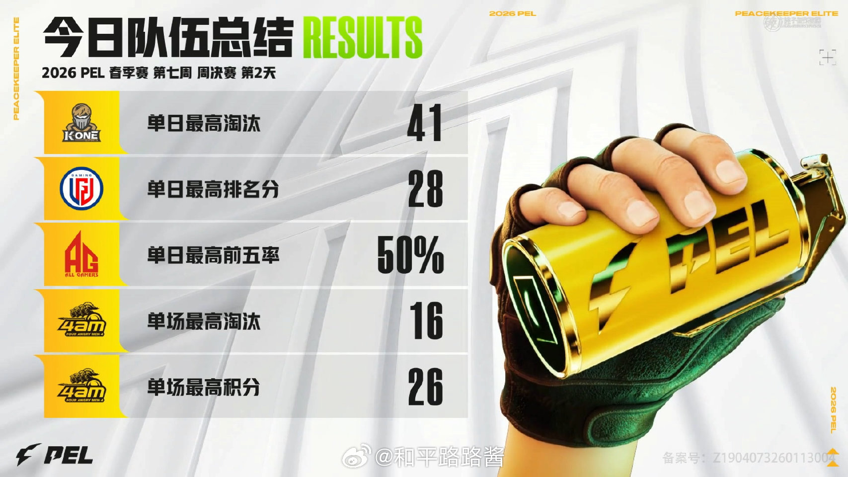 队伍数据:单日最高淘汰:41单日最高排名分:28单日最高前五率:50%单场最高淘汰:16单场最高积分:26