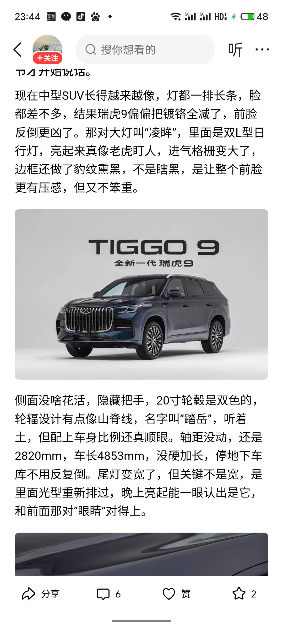 老款的瑞虎9本身配置就非常强了,全系2.0t的发动机,但是没想到新款的配置更让人眼前一亮。车身长度加长到了4853毫米,轴距保持了2820毫米,但这一次燃油车他给你上了智驾,猎鹰700的智驾,你再走进内饰看一看,双联大屏幕,感觉很完美哟!但他竟然不涨价,这你受得了吗?【来自懂车帝车友圈】