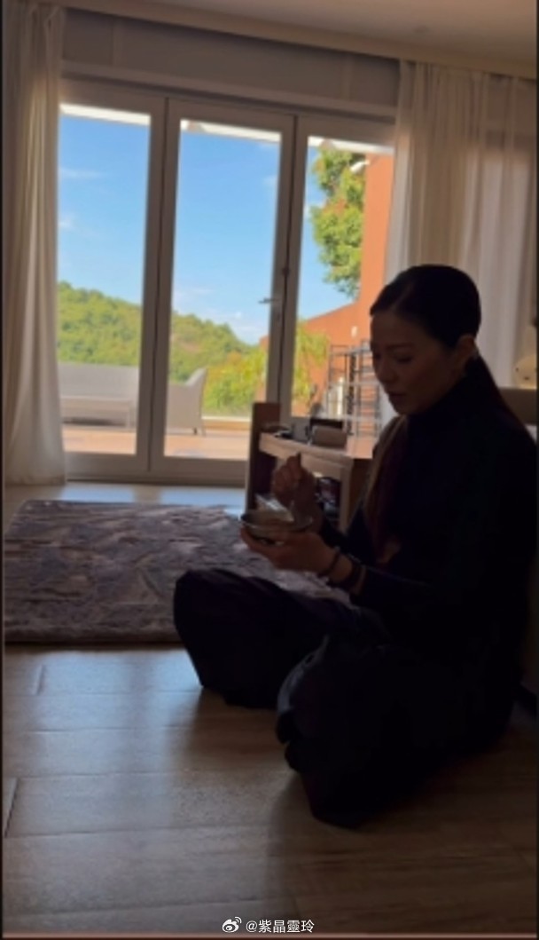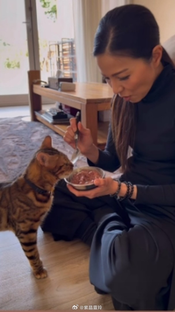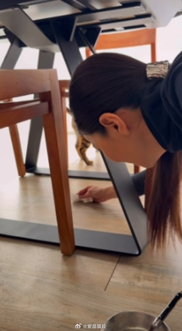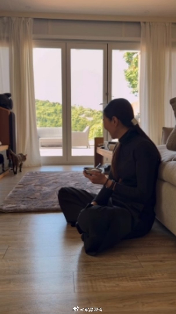 影片開頭,滕麗名抱着愛貓透露「主子最近食欲不振」,隨後便展開一場溫馨又有趣的「餵食攻防戰」。鏡頭首先展示了豪宅的客廳區域,只見她隨性地坐在地板上,耐心哄不願吃飯的貓咪。整個客廳空間感十足,鋪設了淺色木紋地板,配以一張舒適的淺灰色布藝梳化和深啡色地氈,營造出溫馨寧靜的氛圍。