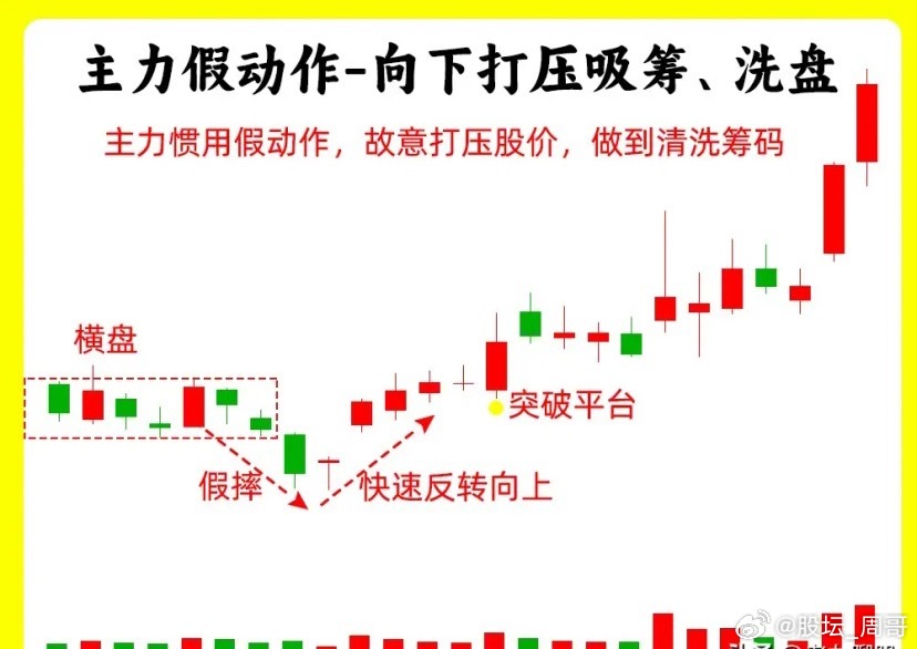 股价在低位形成一个平台,股价在横向移动,突然股价跌破了这个平台,可能出现连续几天的阴线,这样的走势很突兀,但是股价下跌的过程里,成交量并没有出现放量,股价跌破平台以后,又快速的重新回到平台内,就形成一个V形的反转的走势,这是主力故意打压股价,形成假摔