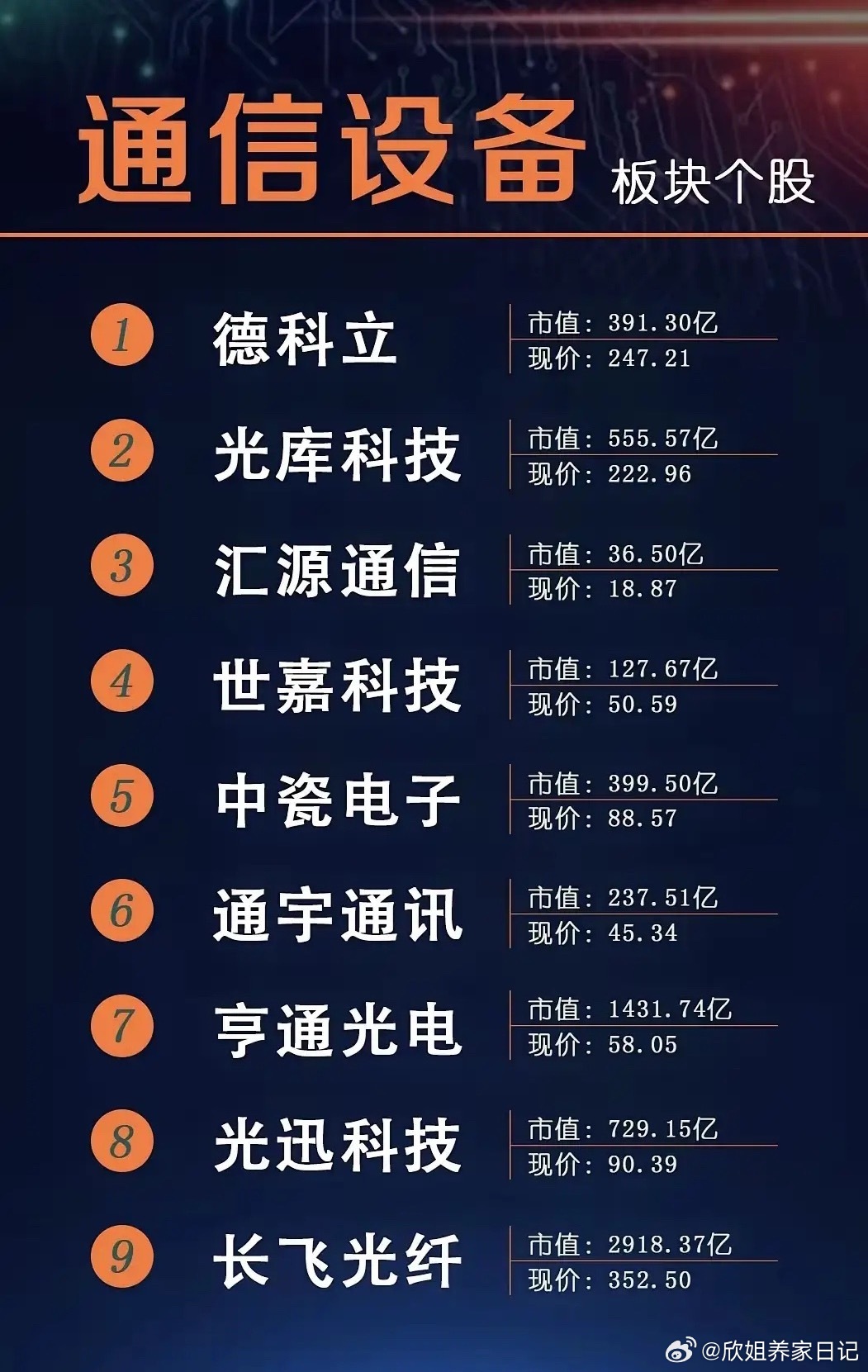 光通信概念股梳理光通信概念股一览表(按产业链分类)一、光模块(AI算力核心)中际旭创(300308):全球龙头,800G/1.6T市占第一,英伟达核心供应商新易盛(300502):高速光模块,800G批量,1.6T通过英伟达认证光迅科技(002281):全产业链,400G/800G/1.6T批量交付华工科技(000988):华为核心供应商,800G LPO海外交付剑桥科技(603083):CPO/硅光,800G量产,1.6T送样联特科技(301205):800G供谷歌,1.6T样品验证二、光芯片/器件(上游核心) 天孚通信(300394):CPO光引擎龙头,英伟达GB200核心供应商 源杰科技(688498):高速光芯片IDM,100G/200G EML突破仕佳光子(688313):AWG芯片全球市占30%+,CPO核心长光华芯(688048):高功率激光芯片,800G/1.6T CW激光出货 福晶科技(002222):光学元件,CPO信号传输关键三、光纤光缆(传输底座)长飞光纤(601869):全球龙头,份额连续9年第一 亨通光电(600487):光纤+海缆+光模块全布局 中天科技(600522):特种光纤市占30%-40% 烽火通信(600498):中国信科旗下,光棒自给率超80%四、设备/系统(通信基建) 中兴通讯(000063):全球通信设备龙头,光通信全栈 海康威视(002415):安防+光通信,光模块/器件布局
