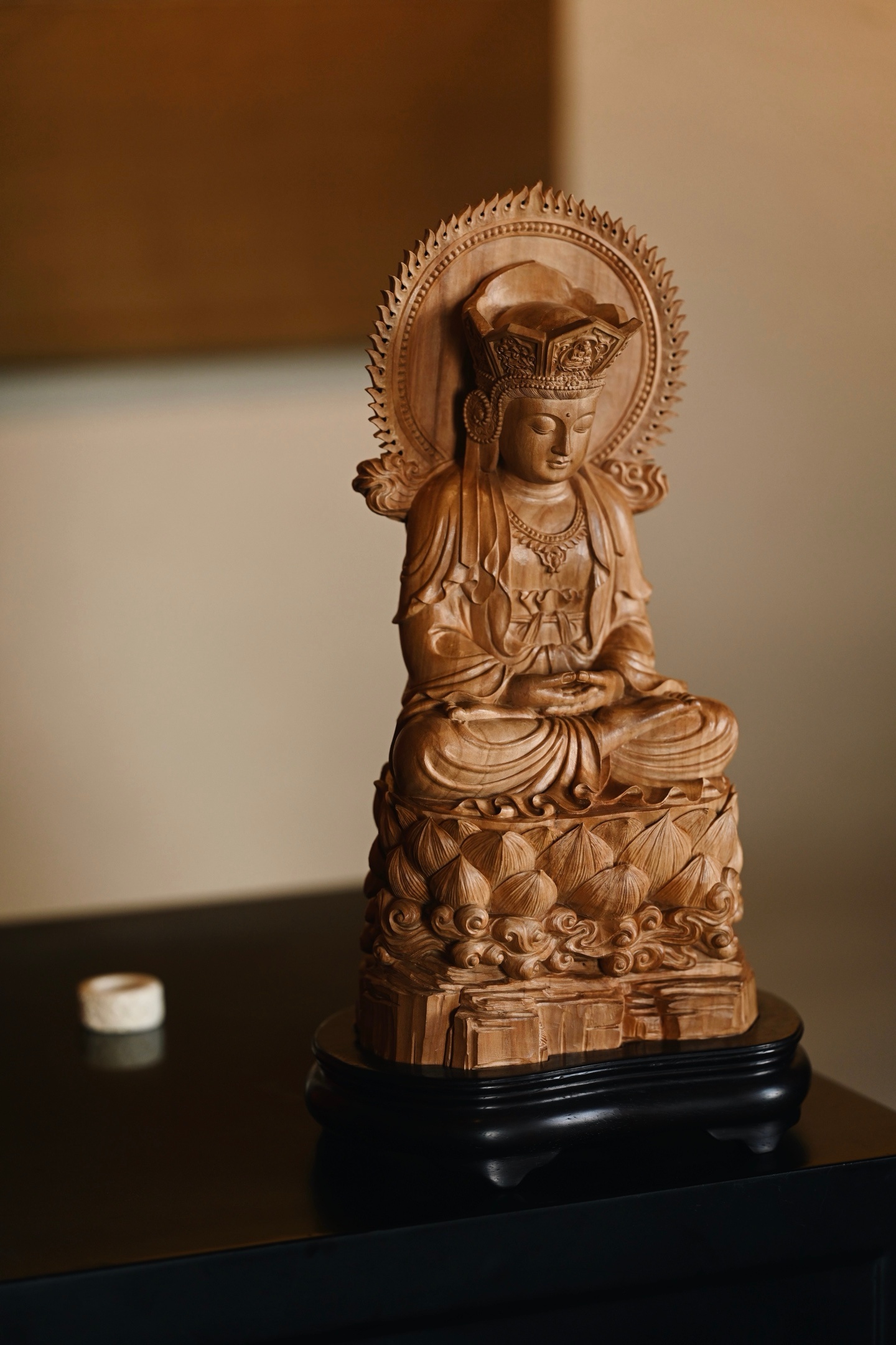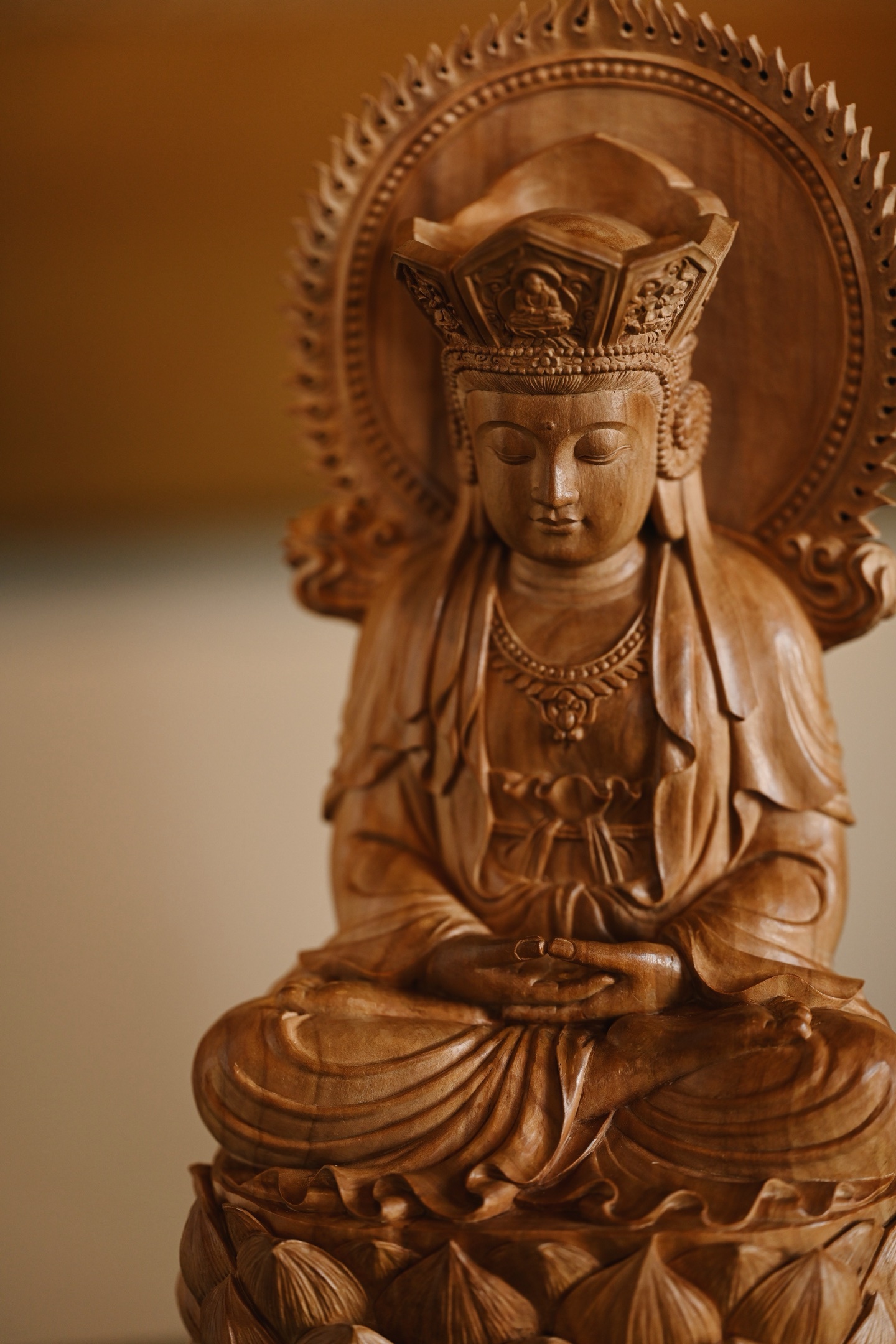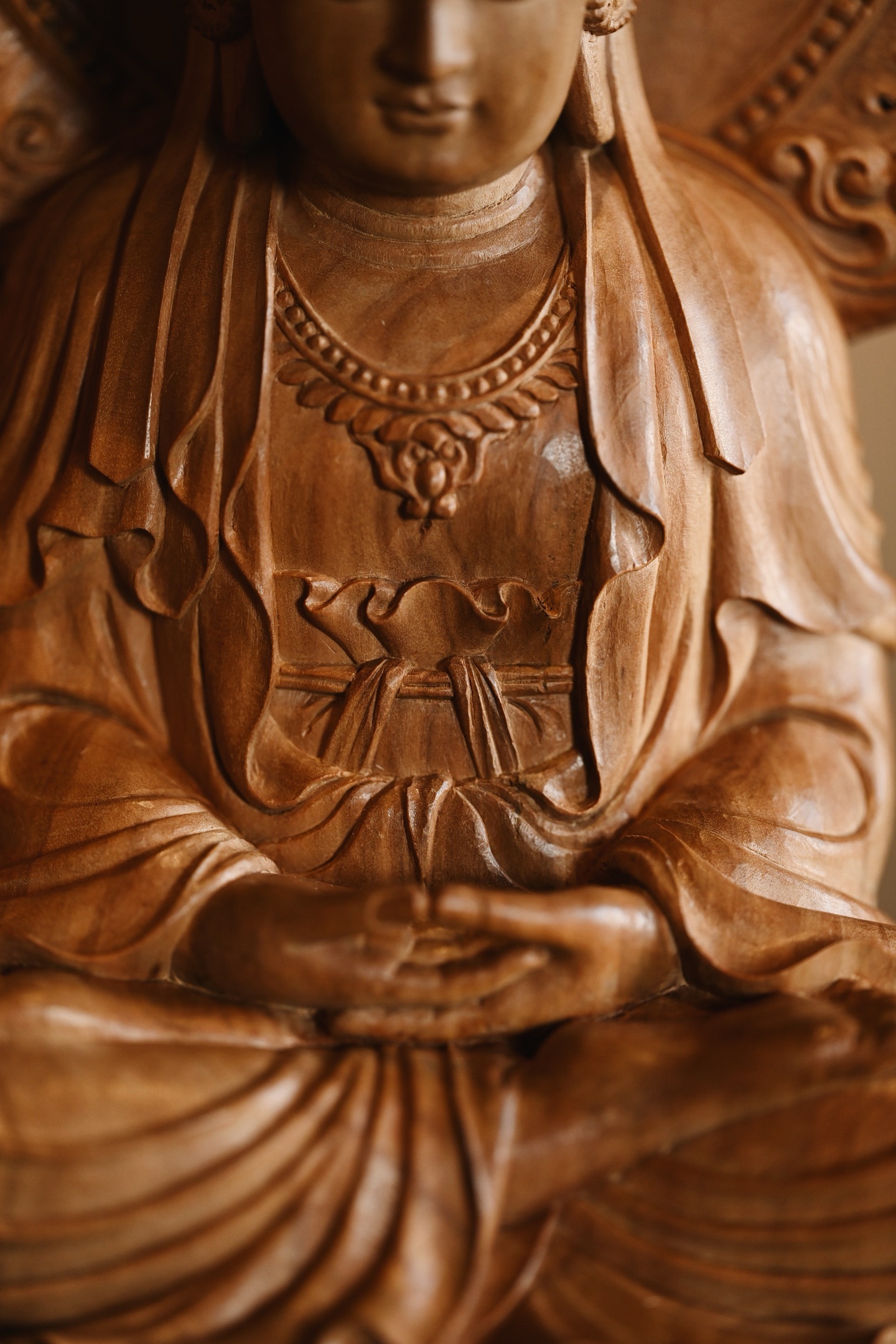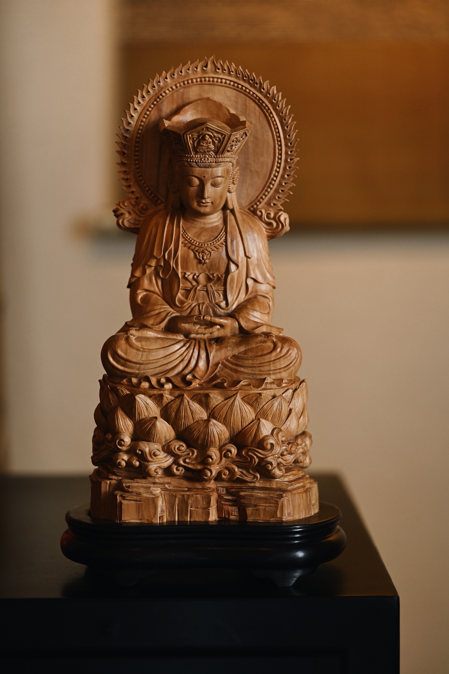 作品依经典「毗卢观音」之仪轨雕成,造型端庄大气,法相庄严。观音头戴五叶宝冠,面相温婉慈和,双目微垂,似在俯视众生,身披璎珞珠宝,衣褶线条流畅自然,双手结定印,端坐于莲花宝座之上,底承祥云岩石,寓意智慧如海、慈悲济世。