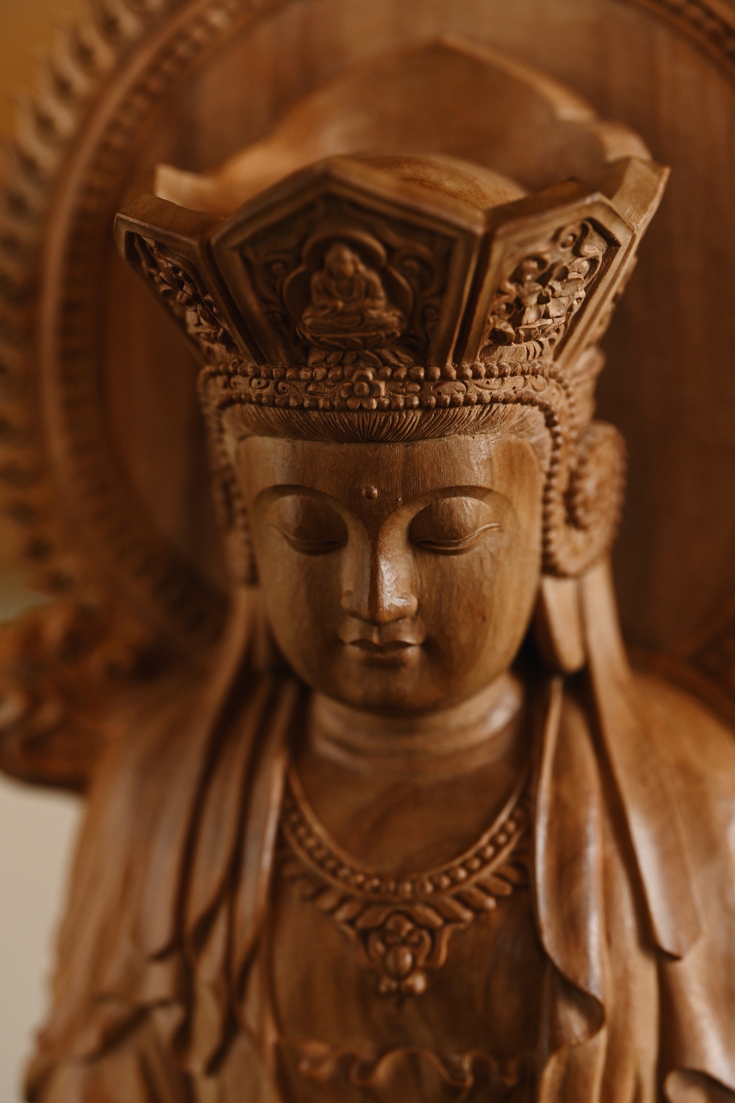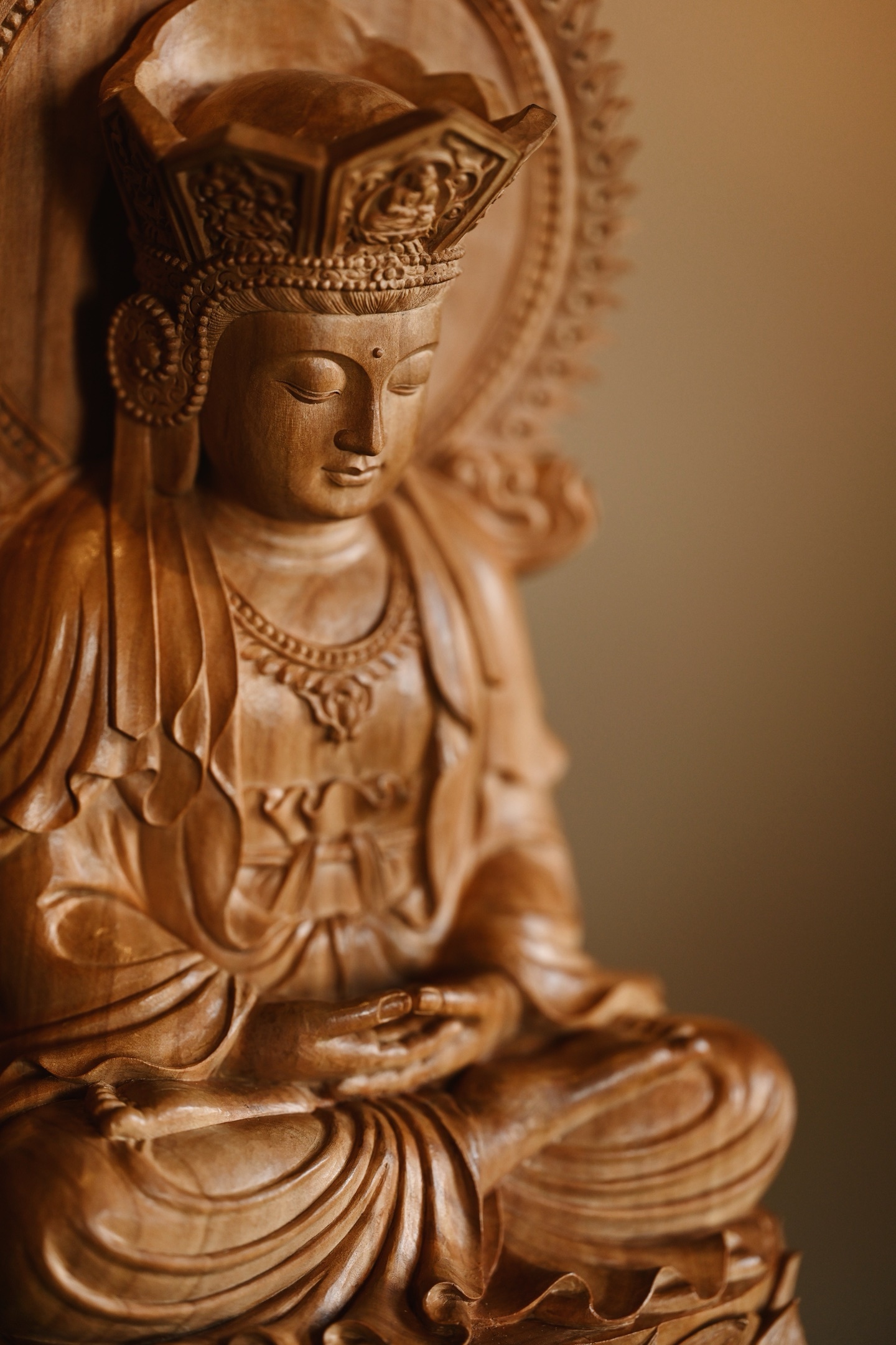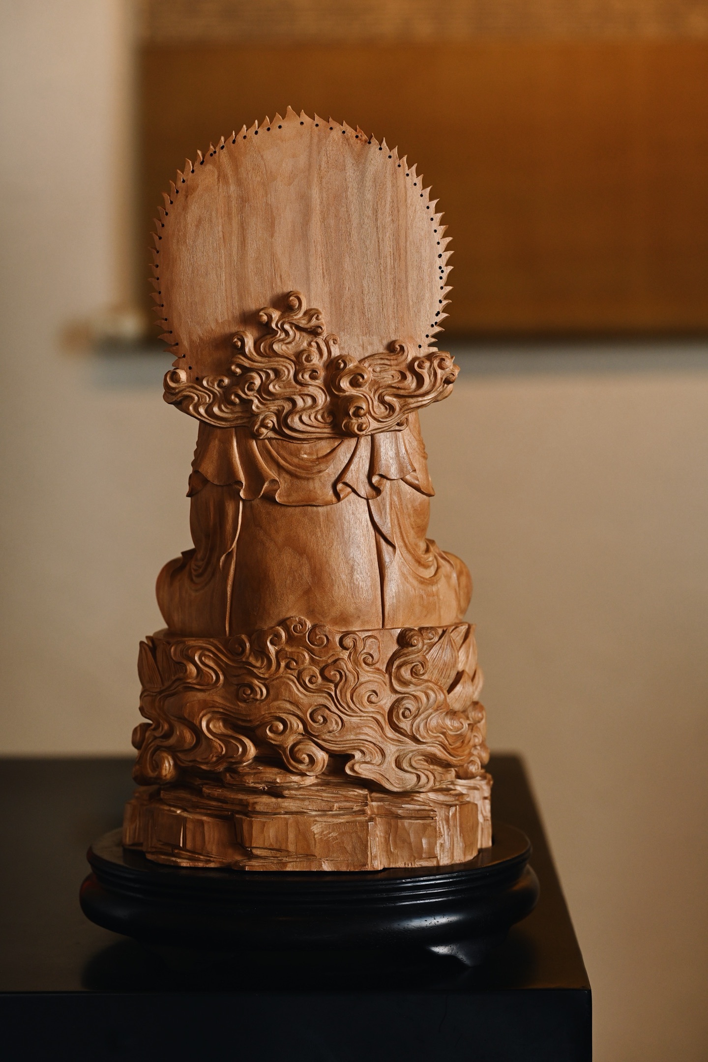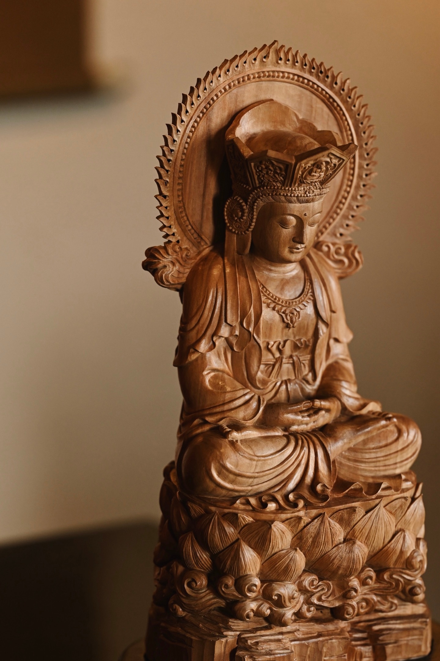 作品依经典「毗卢观音」之仪轨雕成,造型端庄大气,法相庄严。观音头戴五叶宝冠,面相温婉慈和,双目微垂,似在俯视众生,身披璎珞珠宝,衣褶线条流畅自然,双手结定印,端坐于莲花宝座之上,底承祥云岩石,寓意智慧如海、慈悲济世。