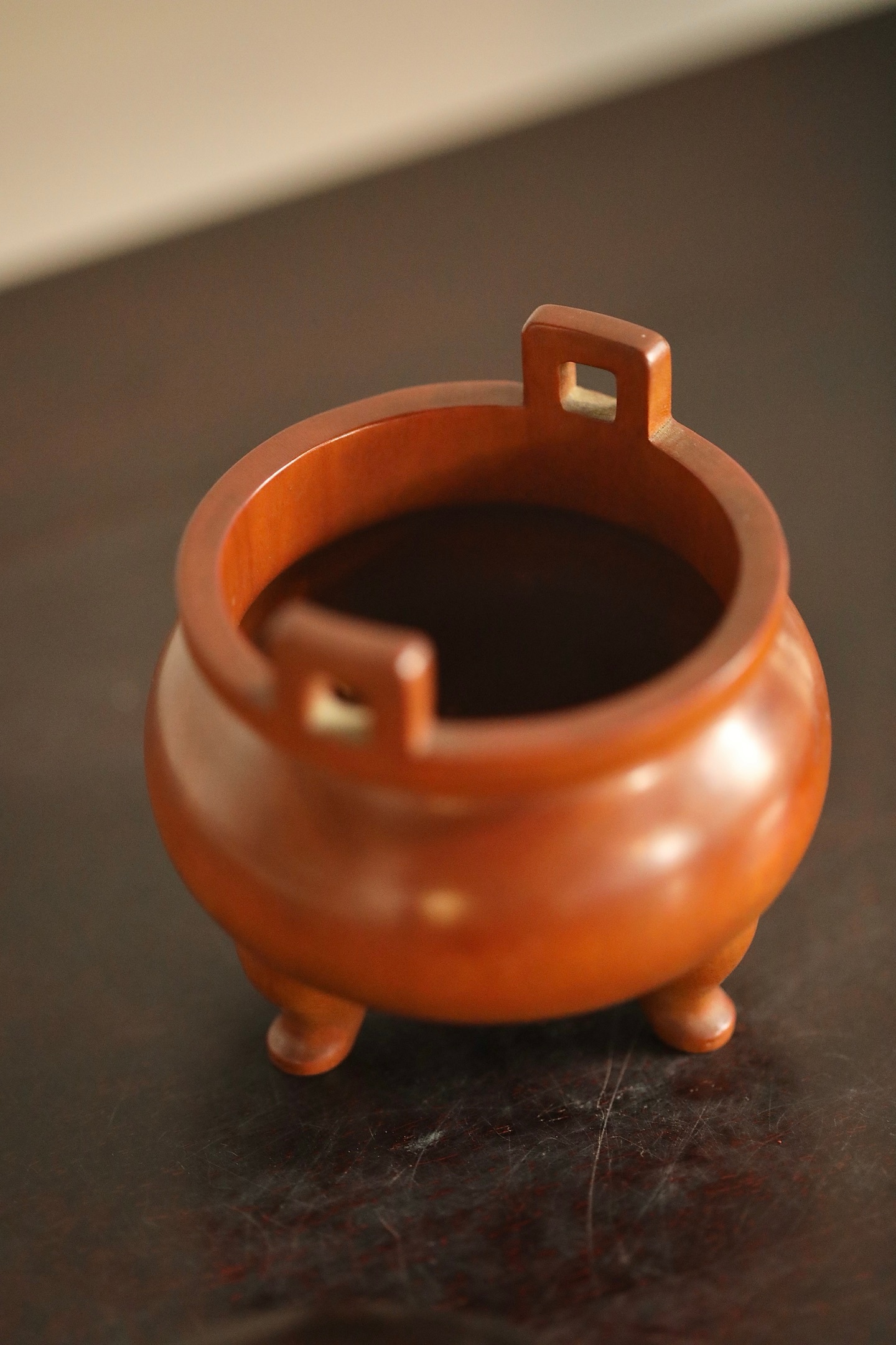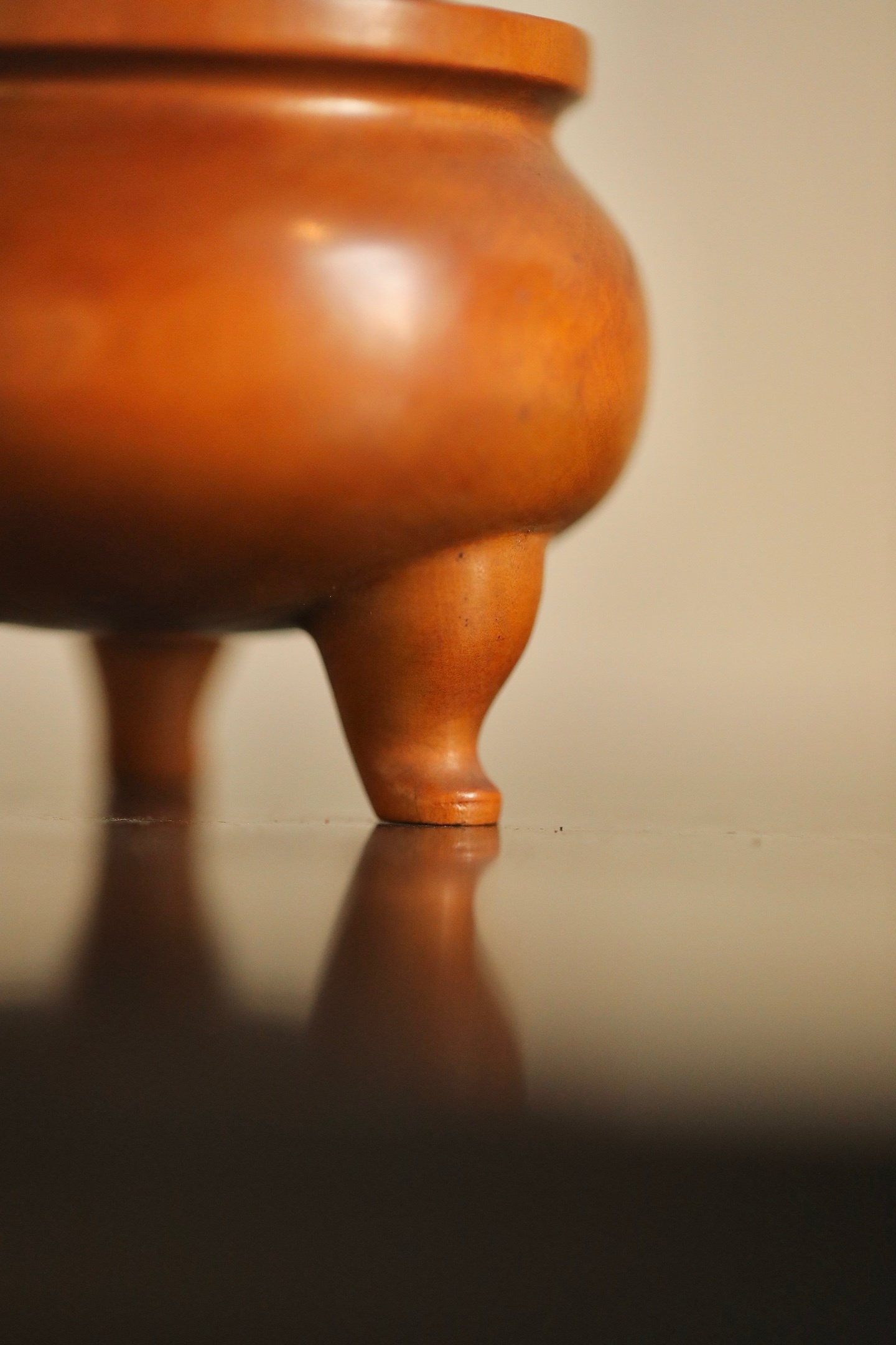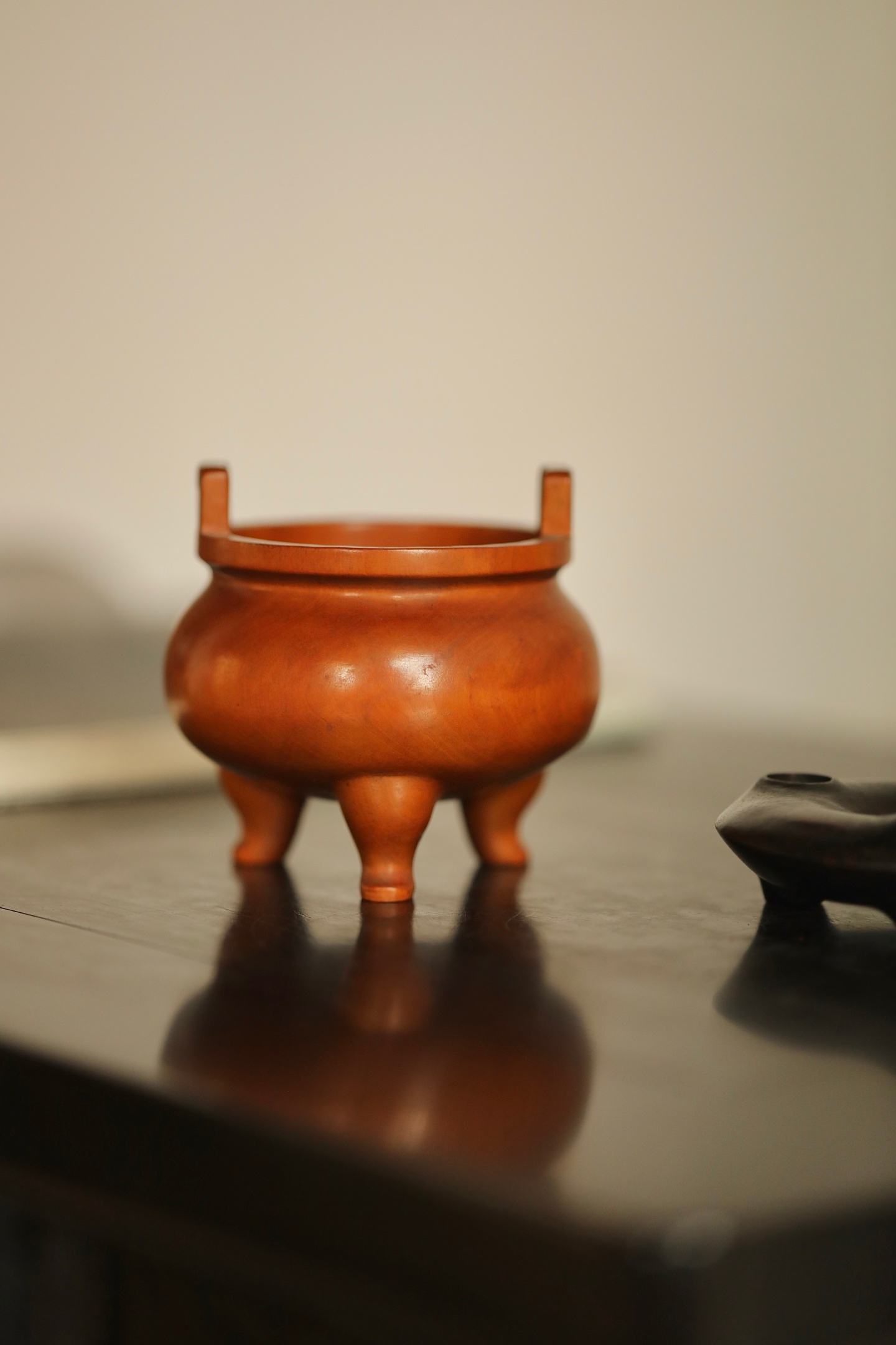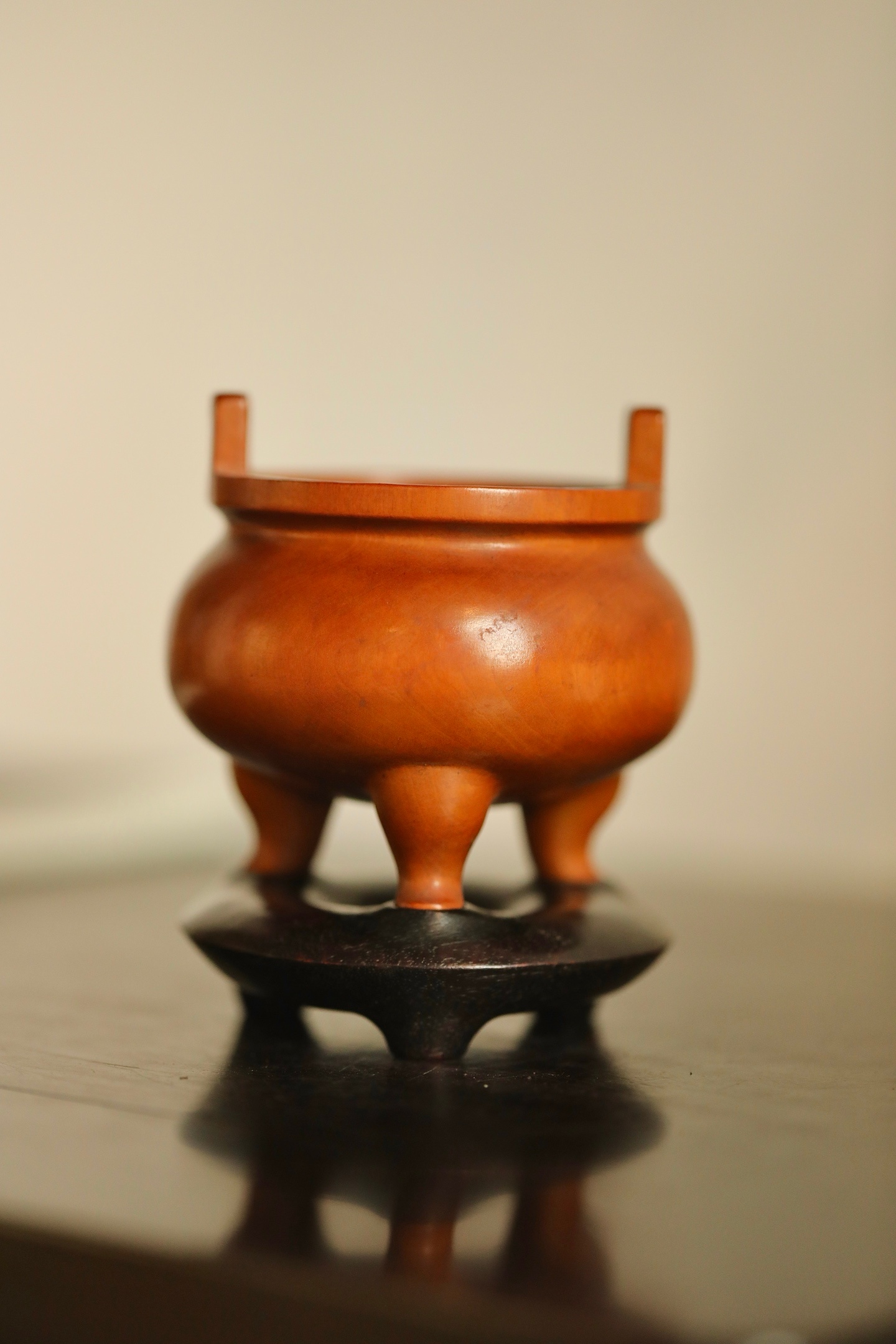 黄杨木 | 三足香炉炉身作鼓腹造型,线条圆润流畅,上置双冲耳,下承三乳足,形制端
