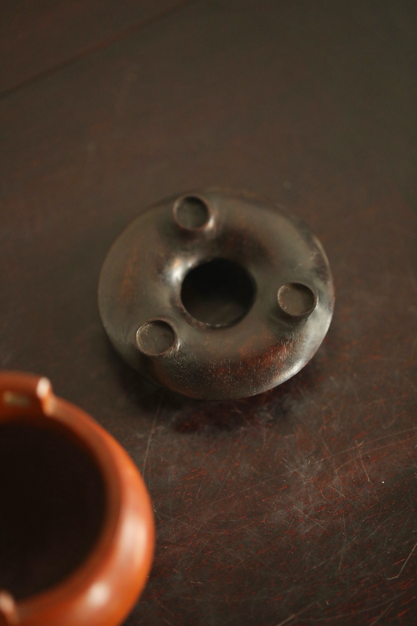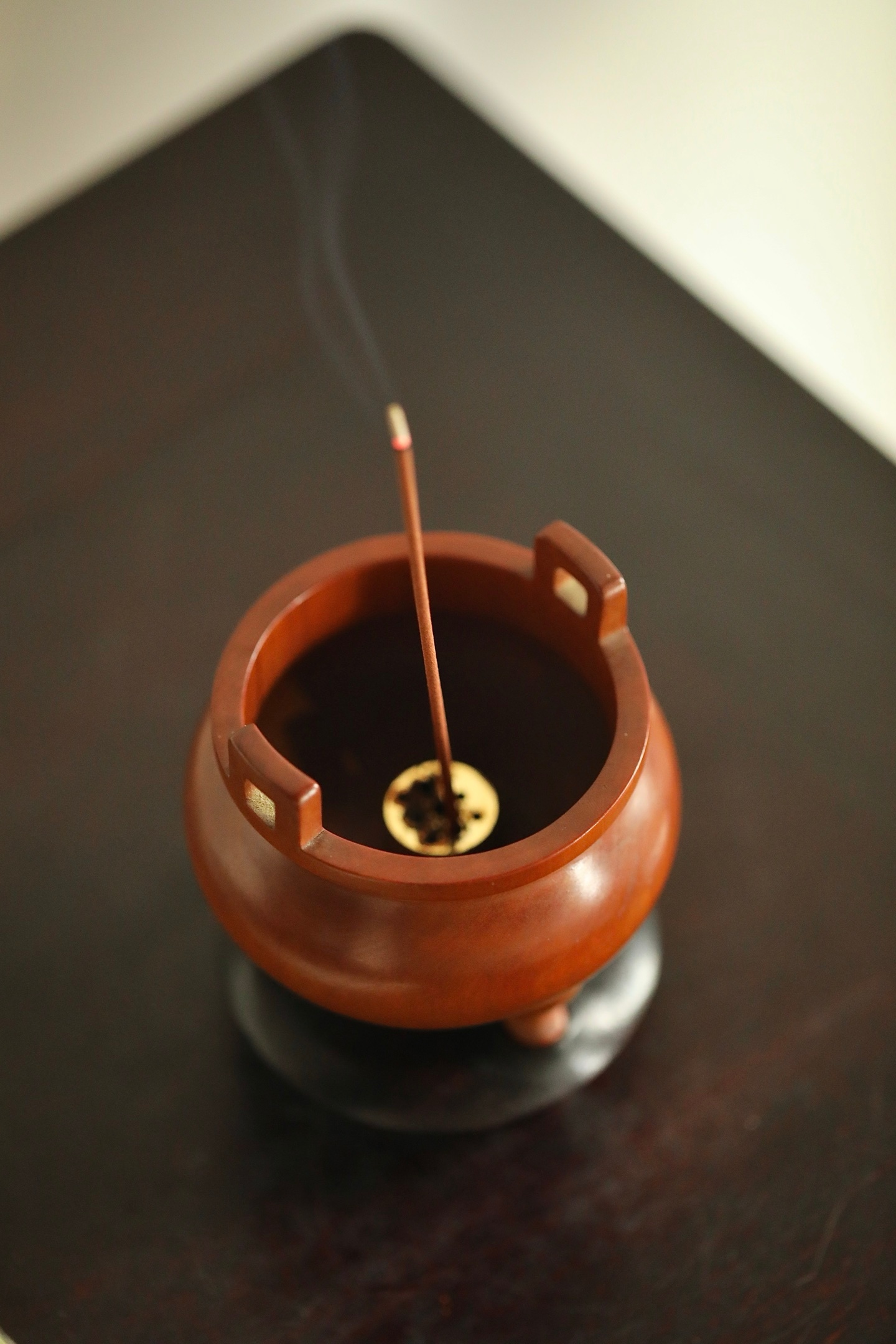 炉身作鼓腹造型,线条圆润流畅,上置双冲耳,下承三乳足,形制端庄规整,气韵古朴典雅。炉内打磨光洁,可置香焚篆。