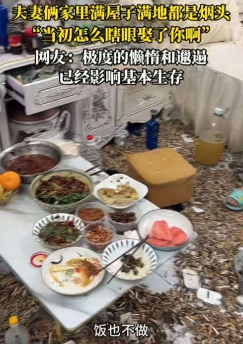 不是一家人不进一家门,建议锁死! 一夫妻俩家里满地都是烟头,无处下脚。男子张口就指责妻子,“我当初怎么瞎眼娶了你啊,衣服不洗,饭也不做,我的天呐!” “我还瞎眼了嘞。”妻子坐在床上反驳道。 满地的烟头,一桌的剩菜,泛黄的枕头,还有半桶矿泉水装的黄色液体。无法想象这房间里的味道有多臭、刺鼻。这环境简直不是人待的地方,极其脏乱差。 都成这样,俩人不收拾就算了,还在那相互指责,推卸责任。卫生从来不是一个人的事情,但凡有一个人勤劳一点,都不至于家里成“垃圾场”。 懒汉配懒女,半斤八两,只能说般配到极致,谁也别嫌谁,锁死最合适,别出来祸害别人!