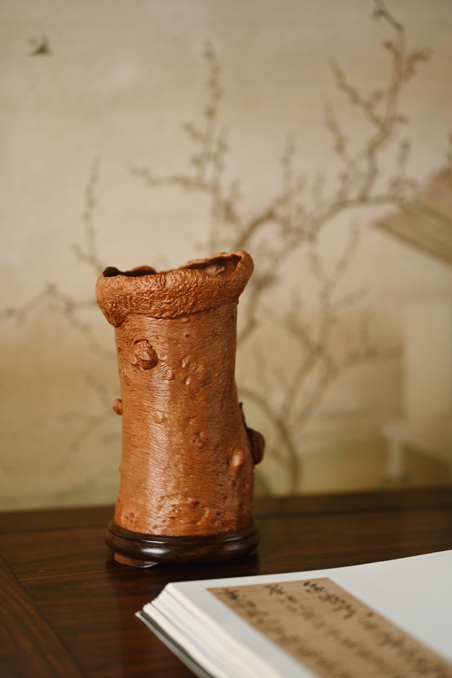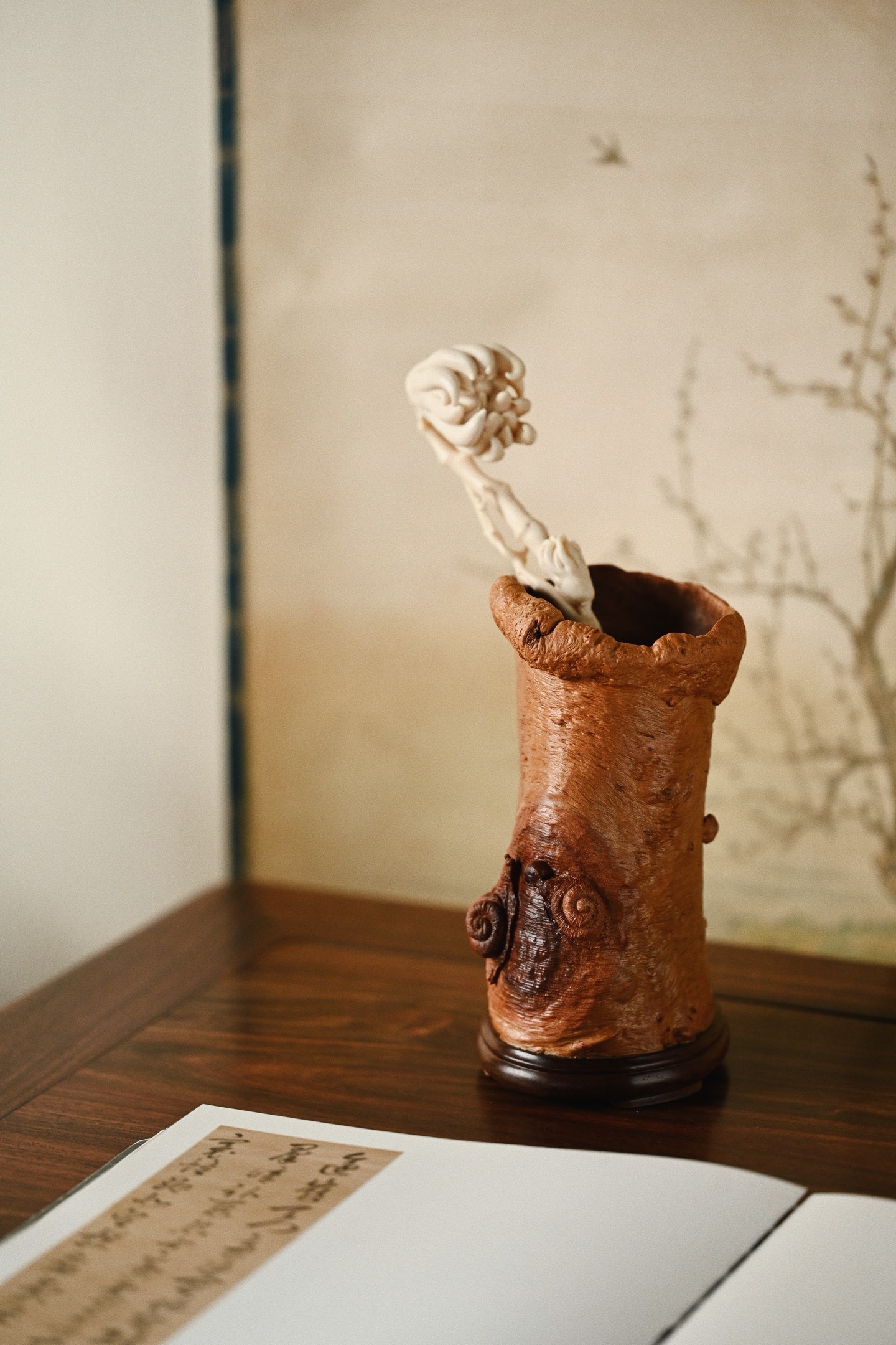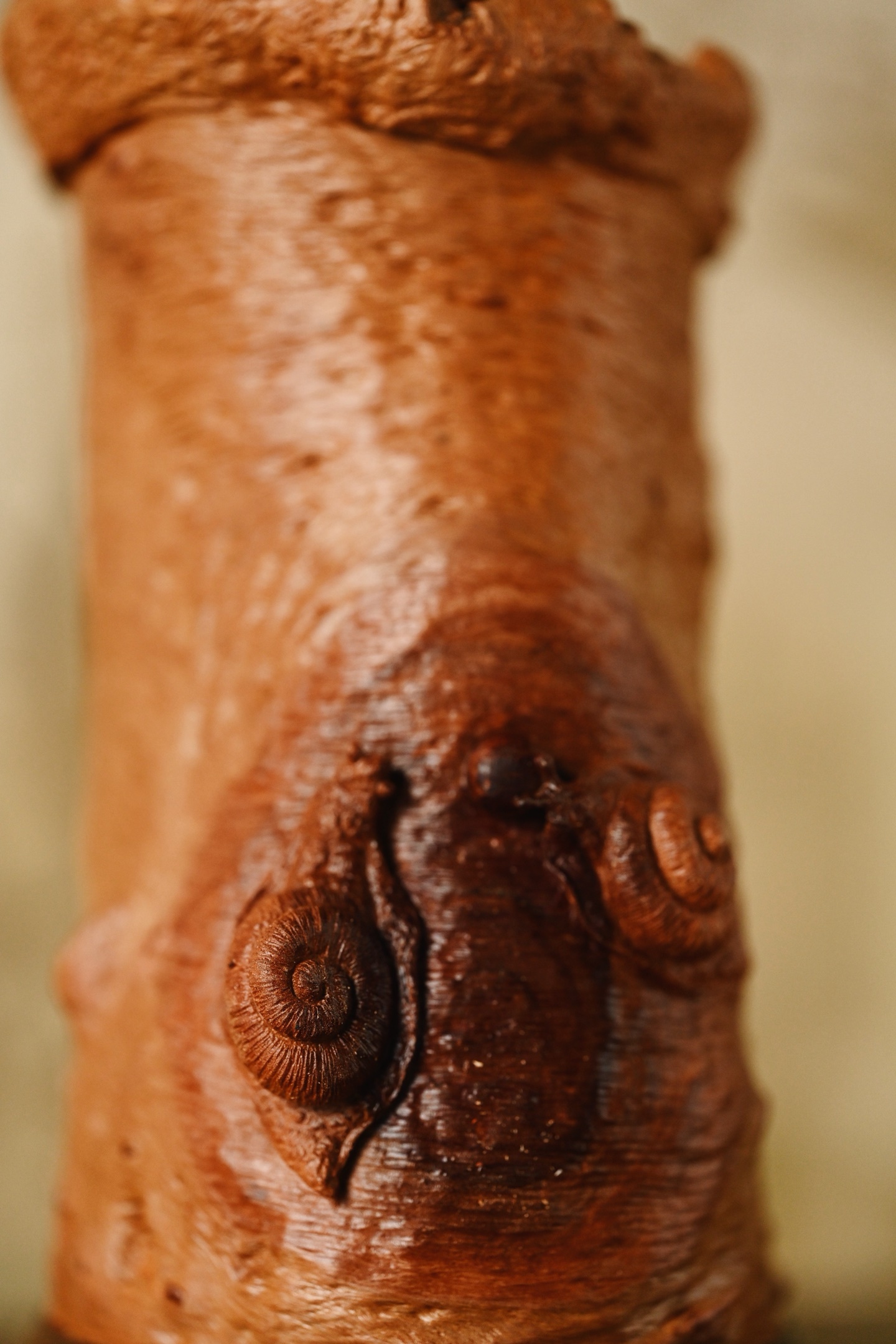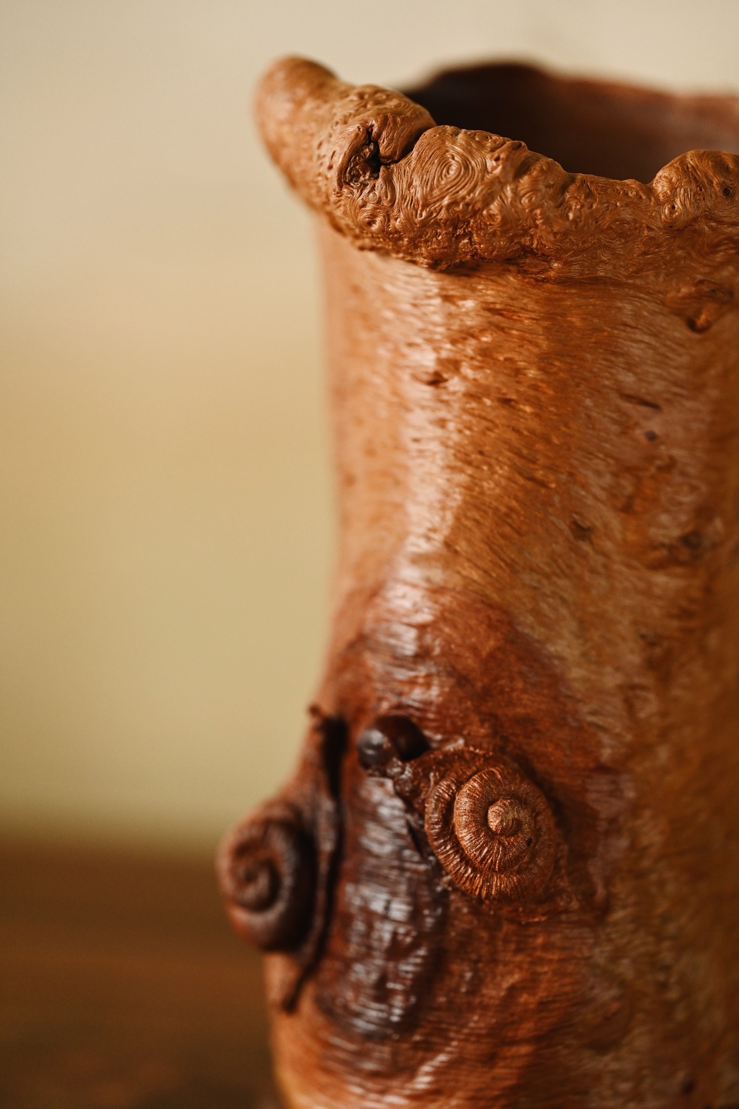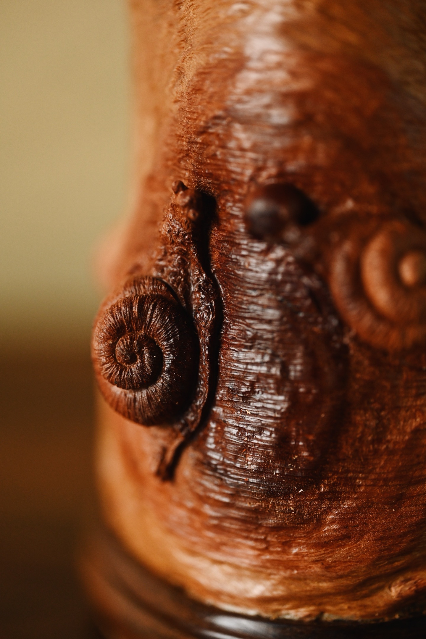 随形雕琢而成,保留天然纹理,富含野趣与岁月之沧桑。筒壁雕两只蜗牛,蜷曲逼真,触须灵动细腻,为整件器物点睛之笔。蜗牛虽慢,却寓意“稳扎稳打、步步为赢、安居乐业”。