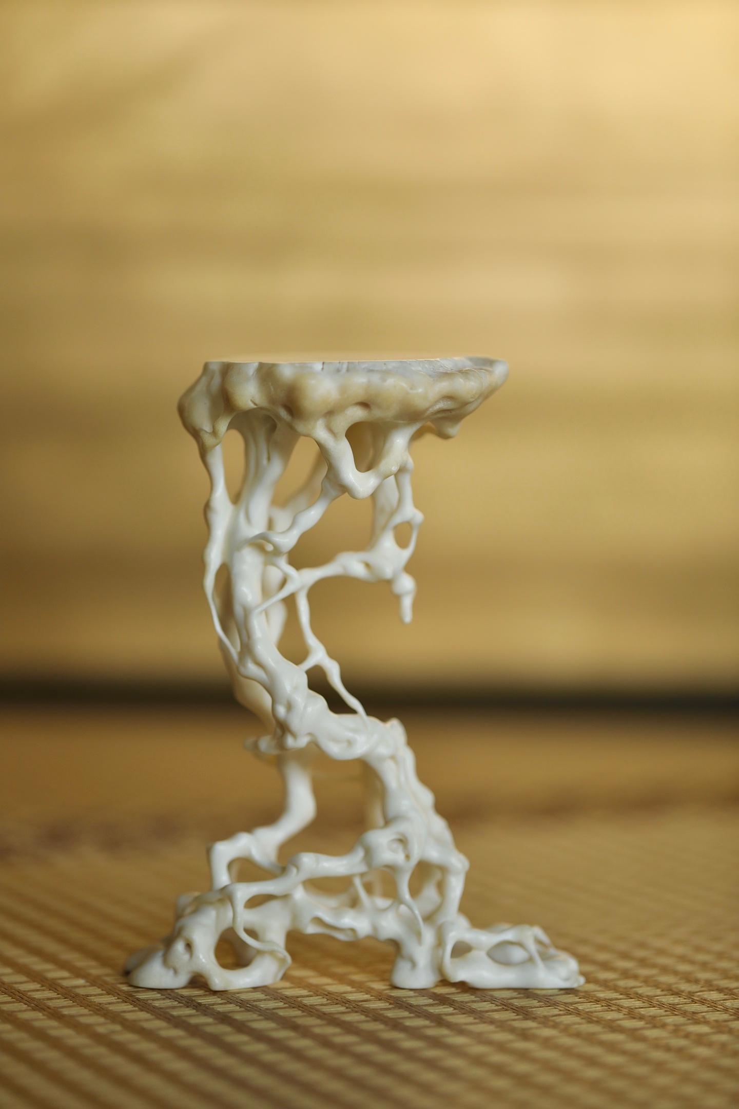 仿天然盘根错节之貌,枝蔓缠绕,孔洞玲珑,线条婉转流畅,虚实相生。几面随形打磨,承托平稳,形制端庄,气韵天成。置于案头承托香炉、摆件,尽显文人雅致。