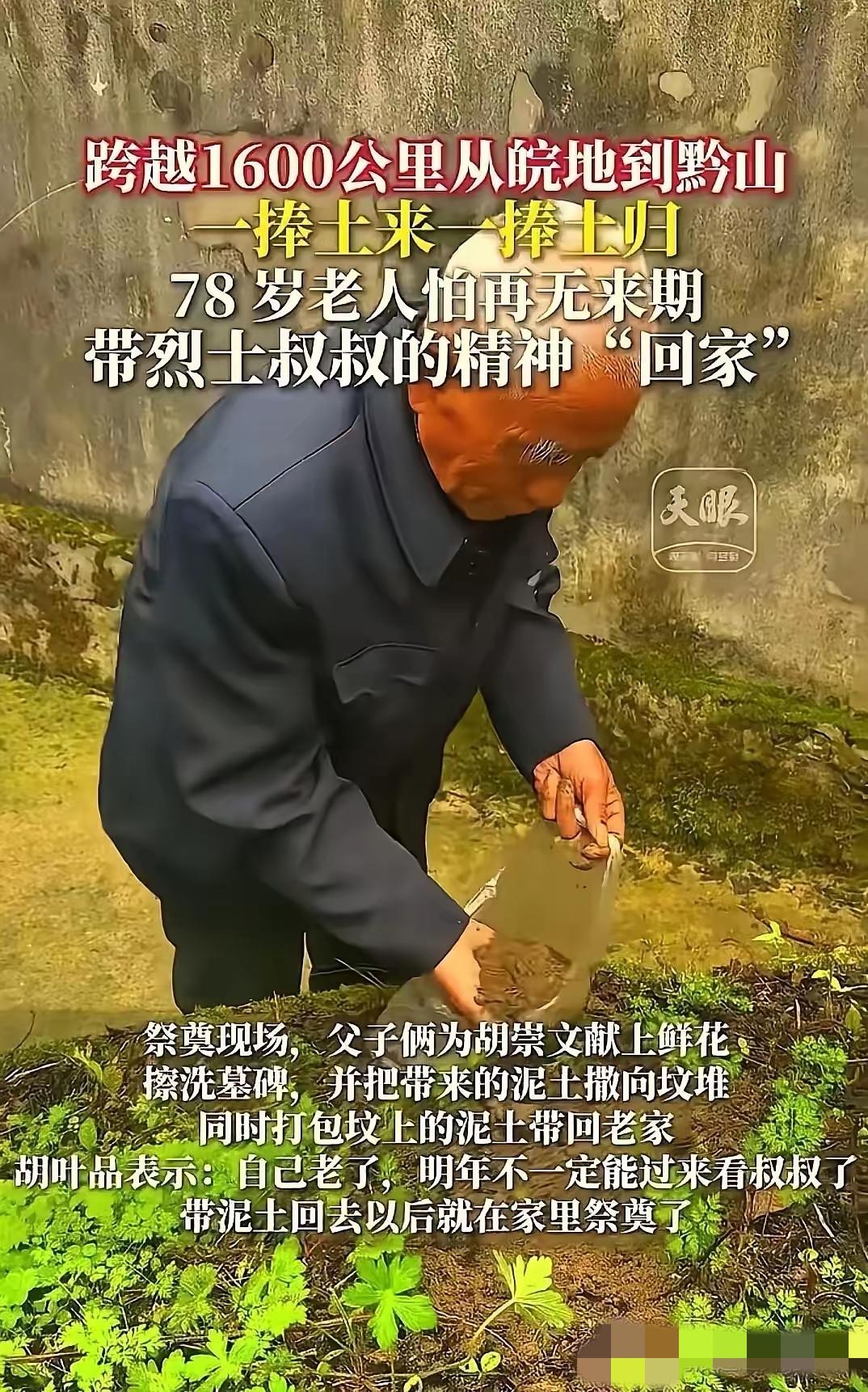 “看哭了!”贵州独山,78岁老人跨越1600公里祭拜烈士二叔,本以为老人擦了墓碑,放了鲜花就会离开,没想到老人竟然拿出一个塑料袋,里面还装满了土,接下来的举动,让一旁的儿子看的眼眶发酸。 这位老人叫胡叶品,今年78岁,从安徽灵璧县一路颠簸赶到贵州独山。他祭拜的二叔名叫胡崇文,生前隶属解放军51师151团。1950年3月,贵州解放初期,独山一带匪患猖獗,22岁的胡崇文随部队前往上司镇剿匪。在掩护村民转移的战斗中,他身中数弹,壮烈牺牲,生命永远定格在了22岁。他未婚无后,连一张照片都没留下,只有一方墓碑孤零零地立在异乡的山坡上,一守就是75年。 胡叶品出生那年,二叔已经牺牲了。家里老辈人反复讲二叔的事:他是个多精神的年轻人,当年跟着刘邓大军一路南下,临走时给家里人磕了三个头,说打完仗就回来。可他再也没回来。这么多年,胡叶品全家只知道二叔牺牲在贵州,具体葬在哪里,没人说得清。他们试着找过,可那个年代信息不通,跑断腿也没个头绪。 转机出现在几年前。胡叶品抱着试试看的心态,向安徽当地的退役军人事务部门提交了寻亲求助。没想到,安徽和贵州两地迅速联动起来,一个部门接一个部门核对烈士档案,一页一页翻找部队服役记录和牺牲经过的描述。最终,在独山县上司镇墨寨村的琴阳烈士陵园里,找到了胡崇文烈士的墓。那座陵园建在半山坡上,背后是层层叠叠的山峦,周围是老百姓种的庄稼地。75年了,胡崇文就静静地躺在那里,守护着他当年用生命换来的这片土地。 确认消息传来的那天,胡叶品老泪纵横。他对着家里的老辈牌位磕了三个响头,嘴里念叨着:“找到了,终于找到了。”2024年,他第一次带着家人去了独山。今年3月25日,78岁的他带着侄孙胡茂义再次出发,开车跨越1600多公里,一路颠簸了十几个小时。出发前,老人特意在家乡的地里挖了一塑料袋土。这些土里掺着他从小走过的路、闻过的庄稼味,还有几十年来没断过的念想。 到了墓前,胡叶品颤巍巍地蹲下来,把家乡的土一捧一捧撒在二叔的坟头。他摸着墓碑上“胡崇文”三个字,声音都在发抖:“二叔,家里人都想你啊,我给你带家乡的土来了,你看看,这是咱们老家的土啊。”撒完土,他又小心翼翼地从烈士陵园里捧起一抔土,仔仔细细装进塑料袋里,准备带回安徽老家。儿子站在一旁,看着父亲布满老年斑的手一点一点捧起异乡的泥土,鼻头一酸,眼泪一下子就涌了上来。 这叫什么?这叫“以土换土”。胡叶品说,家族早就在安徽老家为二叔立了一座空墓,这回把陵园里的土带回去,就是让二叔的英魂真正落叶归根。“两个地方都是您的家。”老人这句话,把千里之外的两片土地连在了一起。 事情传开后,当地退役军人事务部门及时提供了异地祭扫服务保障。根据相关政策,烈士亲属异地祭扫已从“每三年一次”调整为“每年一次”,同行人员可安排1名身体健康亲属陪同祭扫。放眼全国,近年来“为烈士寻亲”工作力度空前。2025年,退役军人事务部成功为28位在韩志愿军烈士确认身份、找到亲人。贵州省利用大数据技术上线了烈士英名录数字化系统,已为1.2万余名烈士建立数字化档案,近年来累计为60名烈士找到亲人。从系统排查到DNA比对,从跨省联动到志愿者接力,越来越多像胡崇文一样的英烈,在牺牲几十年后,等来了家族的祭拜。 胡叶品今年78岁了,身体一年不如一年。祭拜时他反复对二叔念叨:“我年纪大了,明年不一定能来了。”说完又补了一句:“但没关系,我儿子会来,我孙子也会来,胡家世世代代都会来看你。”二叔无后,可他这个侄子,还有侄孙,就是二叔的后人。所谓血脉传承,不就是这样吗?你为国尽忠,我替你尽孝。有些思念,比墓碑立得更久;有些铭记,比岁月走得更远。 各位读者你们怎么看?欢迎在评论区讨论。