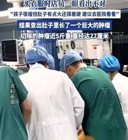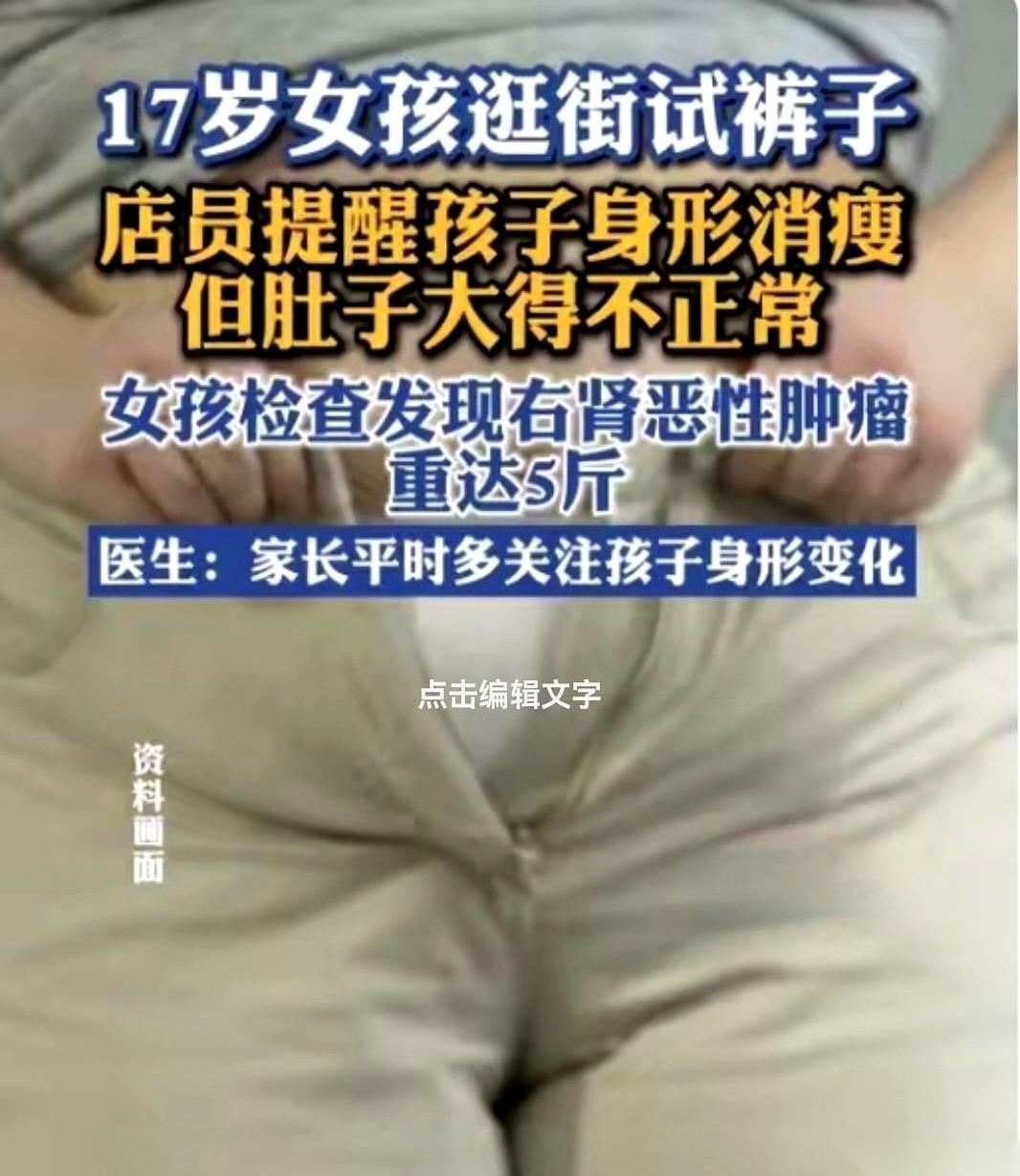 17岁的婷婷,一米六几的个子,体重只有80多斤,瘦得像根竹竿。 她就去服装店试了条牛仔裤,结果拉链卡在肚子那儿,怎么都提不上去。 老板娘多看了她一眼,伸手往她肚子上按了一下,脸色刷地就变了,直接扭头对她妈喊:“姐,别试了,赶紧带孩子上医院!” 她妈第一反应是脸一沉,下意识扫了眼女儿的肚子。可看着闺女那张还挂着奶膘的脸,话到嘴边又咽了回去,二话不说,拉着婷婷就往外冲。 几个小时后,CT片子出来了。医生没多说话,只把片子往灯下一放,指着右腹腔里那团巨大的阴影,蹦出两个数字:“直径27厘米,重2.43公斤。” 肝脏被它挤到了肚脐眼下面,肠子血管全都缩在角落里瑟瑟发抖。更要命的是,给这个大家伙供血的,不是一根血管,是三根,像三条毒蛇的信子,死死缠在上面。 当地医院的医生把片子放下,摆了摆手:“我们不敢动,这刀一下去,血能溅到天花板上。去深圳,连夜去。” 车开到深圳市第三人民医院,胡红星团队的医生一上手,全都沉默了。那肚子硬得像块石头,胀得像个皮球。 手术台上,医生划开一道巨大的反L型切口。手术灯下,主刀医生手里的刀片,就像在拆一个缠满了毛线的炸弹,他得先小心翼翼地剪断那三根异常供血的动脉,再一点一点把它从粘连的脏器上剥离下来,整个过程,汗顺着额角往下淌,旁边的人连大气都不敢喘。 三个小时后,一个快5斤重、篮球大小的玩意儿,被完整地请了出来。婷婷的肚子,瞬间瘪了下去。 手术室外,她妈瘫在长椅上,翻来覆去就一句:“天天在一块儿,我怎么就没看出来……” 其实也怪不了她。校服又宽又大,孩子四肢纤细,不疼不痒,自己都以为是消化不好。谁能想到,肾脏肿瘤就爱这么装死,不出声,却要命。 全家人在“良性”还是“恶性”的铡刀下等了三天。直到医生拎着病理报告,笑着推开门:“良性的,嗜酸细胞瘤!万幸!养好了照样逛街吃火锅。” 有时候救你一命的,不是警笛长鸣的救护车,也不是手术台上的无影灯。 就是那个服装店里,多嘴多舌、多伸了一次手的老板娘。