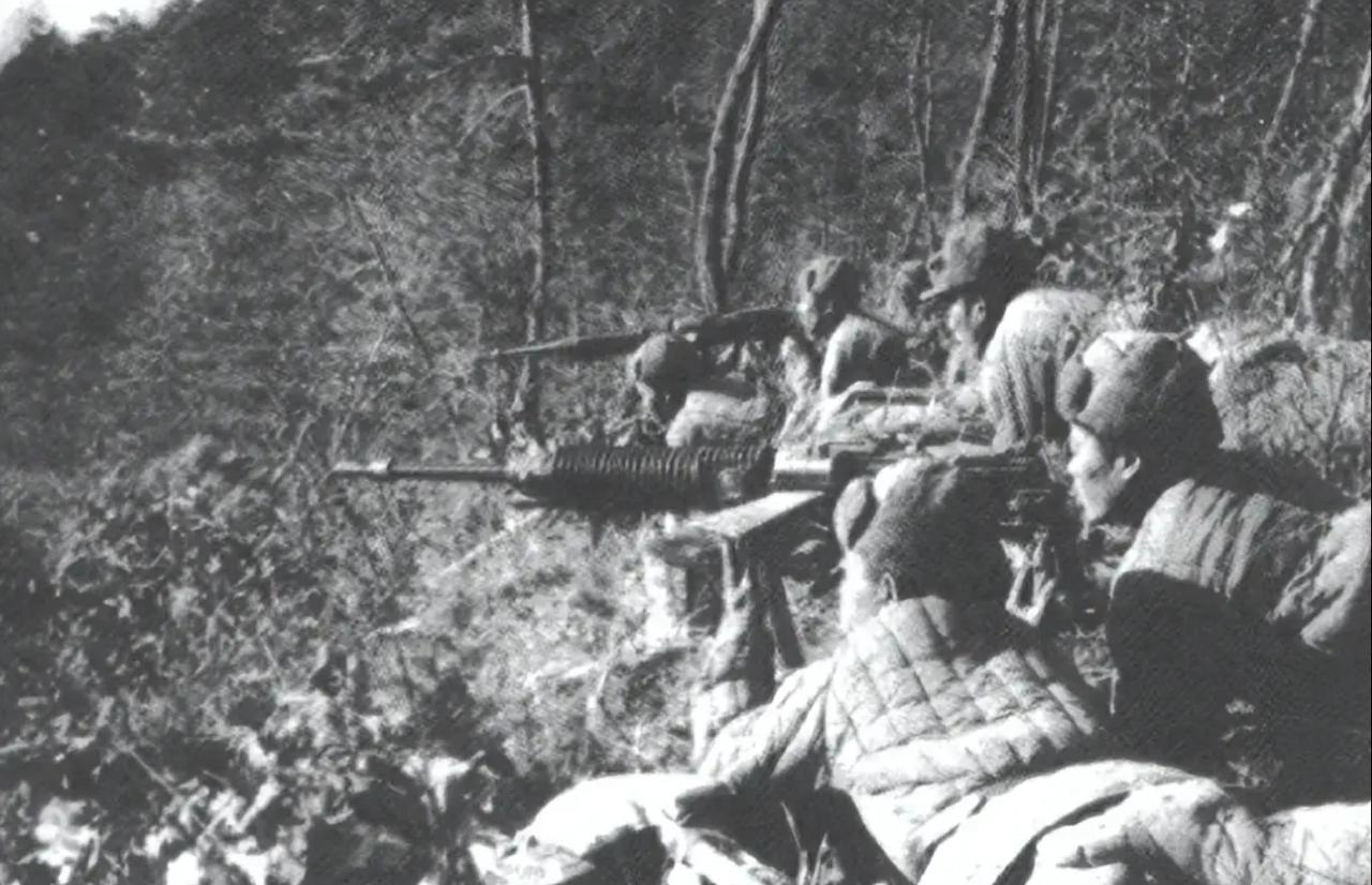 这张黑白照片记录了抗美援朝战争中,中国人民志愿军使用日式九二式重机枪作战的历史瞬间,场景大概率发生在飞虎山防御战中。 这是一款日本在二战期间装备的重机枪,志愿军因装备来源复杂,在战争初期大量使用了这类缴获武器。它的标志性特征是带散热片的枪管和上方的弹板供弹结构,在当时是志愿军重要的阵地压制火力。 画面中战士们身着厚实的棉衣棉帽,依托山地林间阵地构筑火力点,符合朝鲜战场寒冷多山的作战环境。1950年11月,志愿军第38军112师在此顽强阻击美军,这张照片正是当时部队山地防御作战的缩影。 这张照片直观展现了志愿军“万国牌”装备的特点:以缴获武器对抗装备优势的敌军,也印证了当时作战条件的艰苦。九二式重机枪虽然射速较慢、技术老旧,但凭借可靠的性能,成为志愿军在阵地战中迟滞敌军进攻的重要武器。