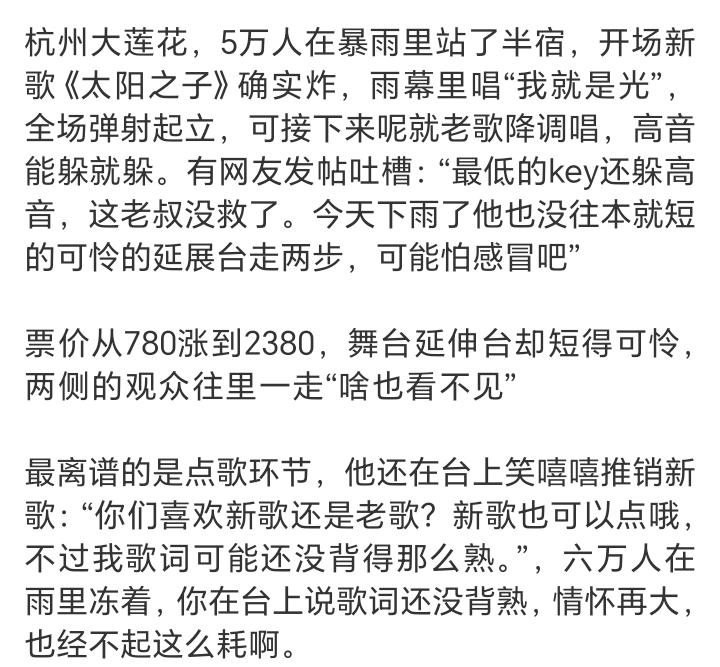周杰伦,冲上热搜。 4月5日,歌手周杰伦冲上热搜,这次不是因为新专辑,而是演唱会被吐槽严重划水,这对于一个乐坛重量级的歌手来讲,无疑是对实力的质疑。 对于周杰伦划水这件事,有人说,周杰伦演唱会上聊天就聊了半小时,而且遇到高音就跳,他建议杰伦喜欢聊天就回家聊,高音唱不了,就别选此类的歌曲。 而且遇高音就跳的事情,还不止一个人吐槽,还有人爆料,杰伦在点歌环节,推销自己的新歌,新歌也在点歌范围,结果他告诉歌迷歌词没背熟,且当时几万人是在淋雨的状态。 有一说一,演唱会划水,其实大部分歌手都做过,唱几句,就把话筒递给歌迷,说杰伦划水,当然也有成份,毕竟杰伦年纪也不小了,有时候是真唱不上去。 再说周杰伦唱高音确实有难度,有时候做不到的事情,真不能逼着去做,但话又说回来,歌迷花钱去看演唱会,希望歌手们都全力以赴,如果要划水,票可以卖便宜一点。