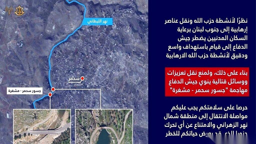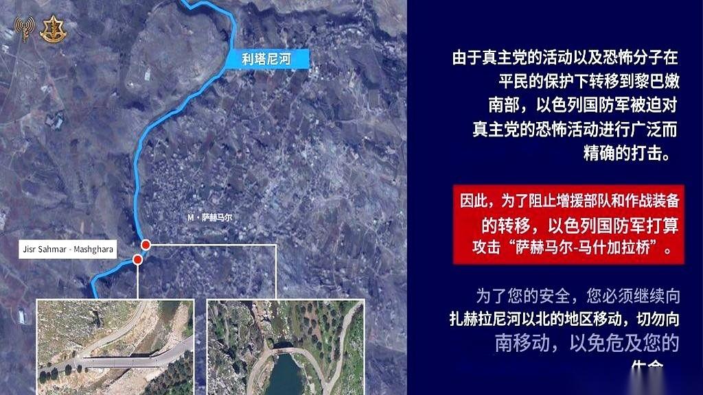 以色列国防军的一则警告,直接传到了黎巴嫩南部每一部手机上。 内容很短:我们要炸掉利塔尼河上的两座桥。 通知发出,倒计时就已经开始。 给出的理由是,真主党正在利用这些桥梁,混在平民里,往南部运送人员和武器。所以,必须切断。 其中一座叫“萨赫马尔-马什加拉桥”。可能几分钟前,上面还有孩子跑过,还有小贩在桥头叫卖,但从这条消息抵达开始,它就不再是通道,而是一个巨大的、画着红叉的靶心。 警告里最后一段话,像机器一样冰冷: “为了您的安全,立即向扎赫拉尼河以北移动。” “切勿向南,否则危及生命。” 一张提前发出的“空袭通知单”,到底是保护平民的最后一道防线,还是把平民推向另一场迁徙的号角?