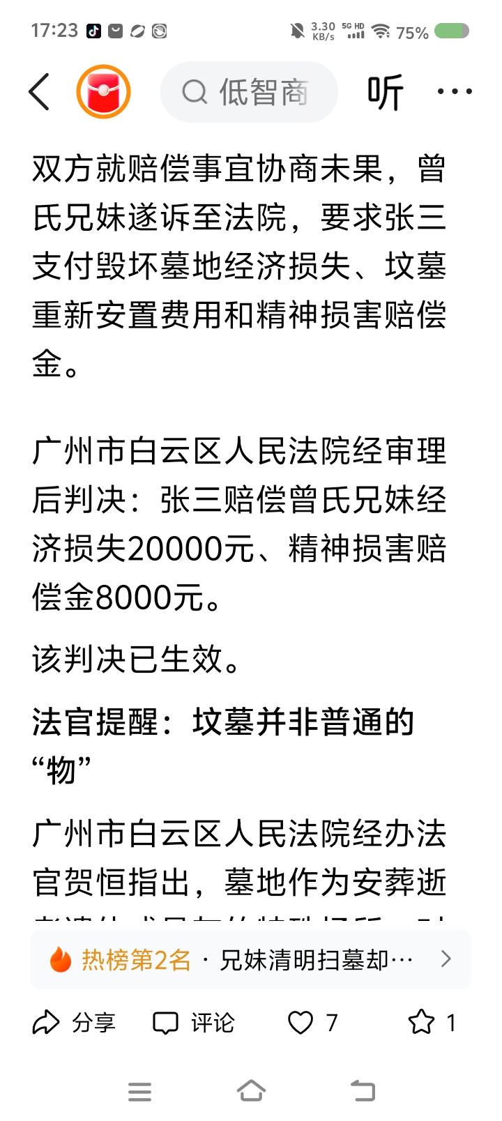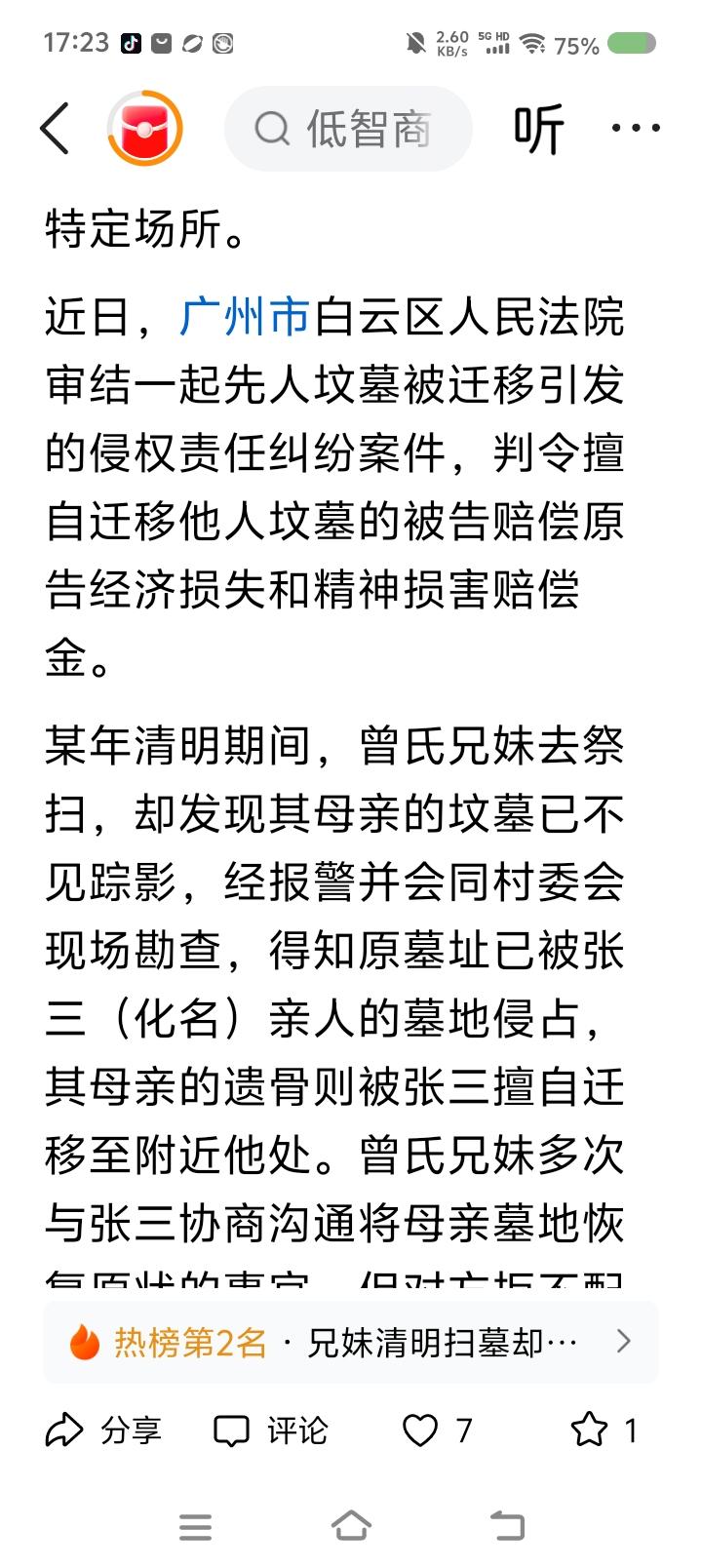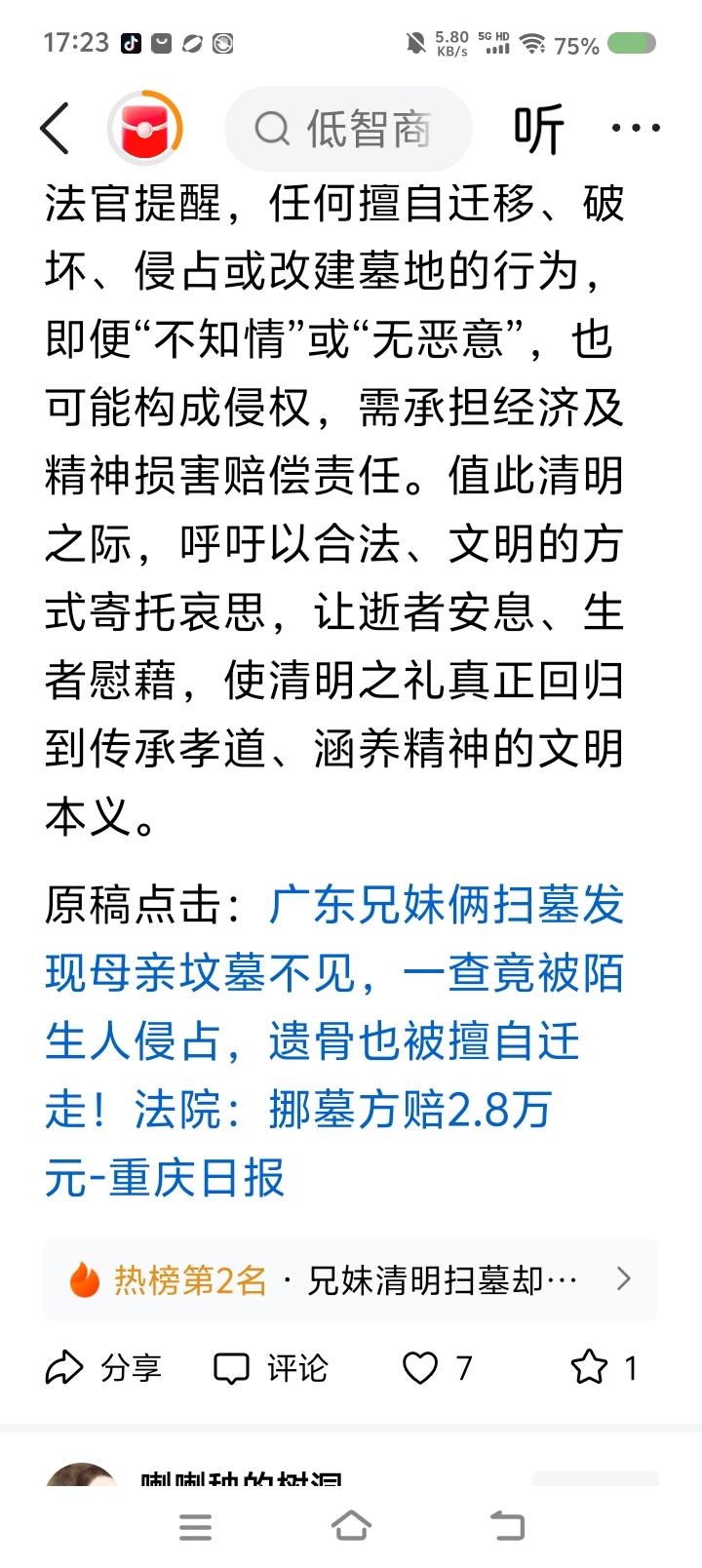 有人扫墓,发现坟“丢”了—— 据报道,有人扫墓,发现坟不见了,报警。经调查,墓址被侵占,原坟中遗骨被挪走。涉案人解释:“修缮母亲坟时,发现旁边坟墓,询问当地村里人,无人知晓,所以把它挪了。骨灰盒妥善移置。” 法院判决被告赔偿相关损失。 点评: 一、他为什么移别人的坟?人家的坟碍他家的坟什么事了? 二、涉案人能问当地居民,为什么不问居委会?坟墓用地归根结底也是国家、集体的,人们都只是借用。得依法依规办事。