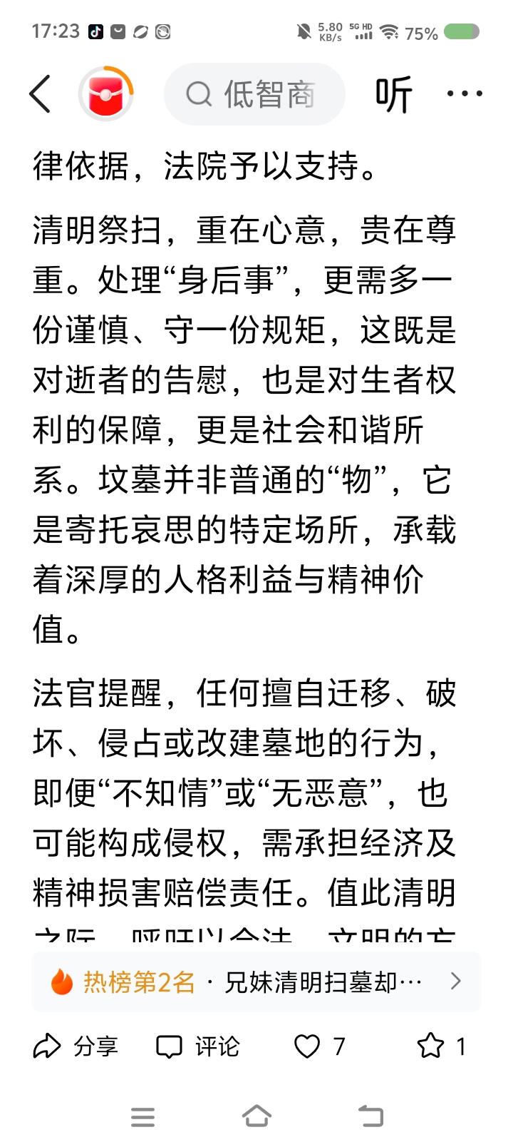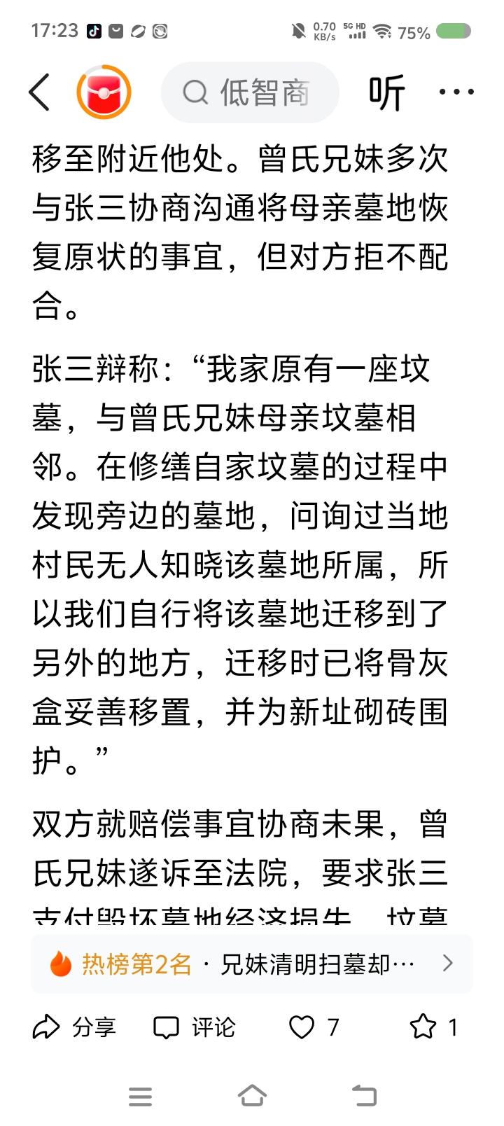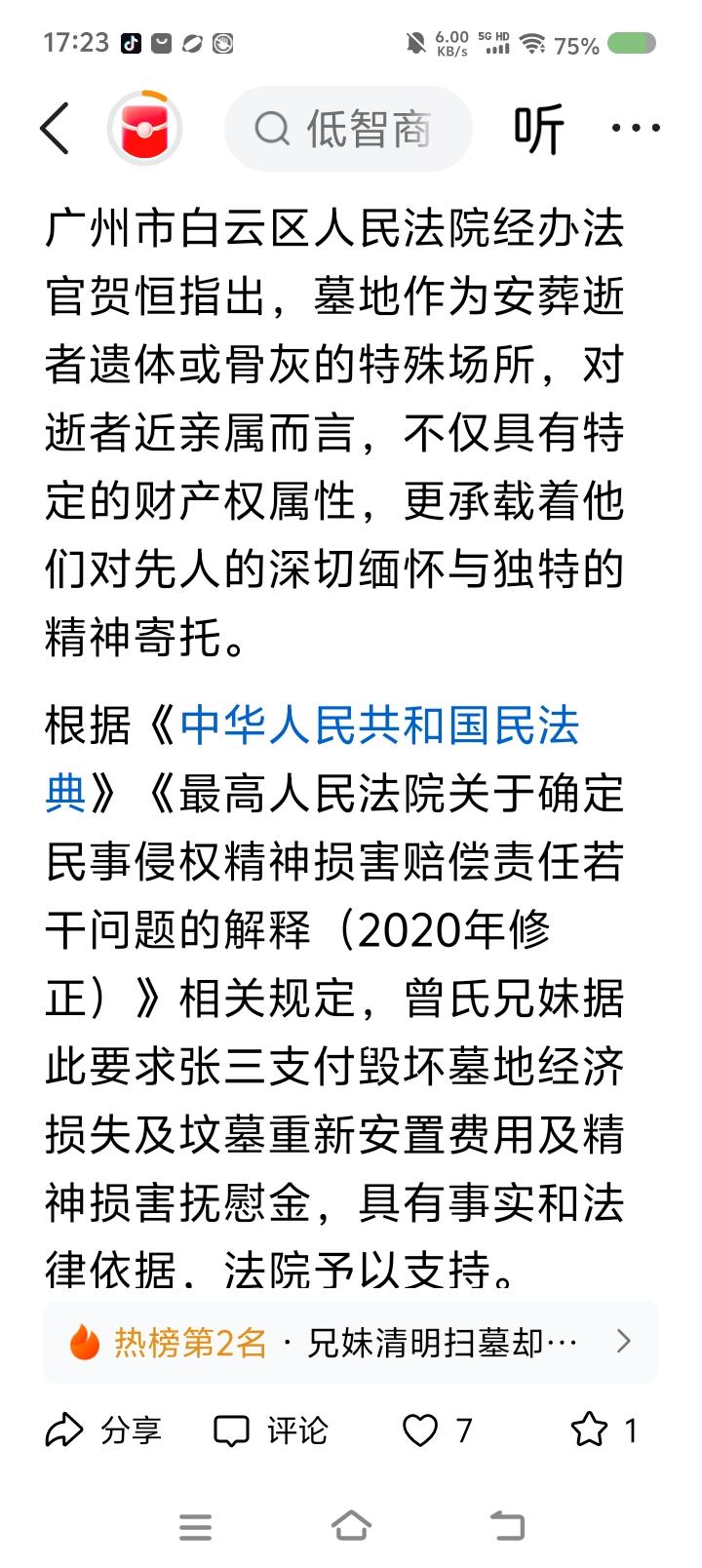 有人扫墓,发现坟“丢”了—— 据报道,有人扫墓,发现坟不见了,报警。经调查,墓址被侵占,原坟中遗骨被挪走。涉案人解释:“修缮母亲坟时,发现旁边坟墓,询问当地村里人,无人知晓,所以把它挪了。骨灰盒妥善移置。” 法院判决被告赔偿相关损失。 点评: 一、他为什么移别人的坟?人家的坟碍他家的坟什么事了? 二、涉案人能问当地居民,为什么不问居委会?坟墓用地归根结底也是国家、集体的,人们都只是借用。得依法依规办事。