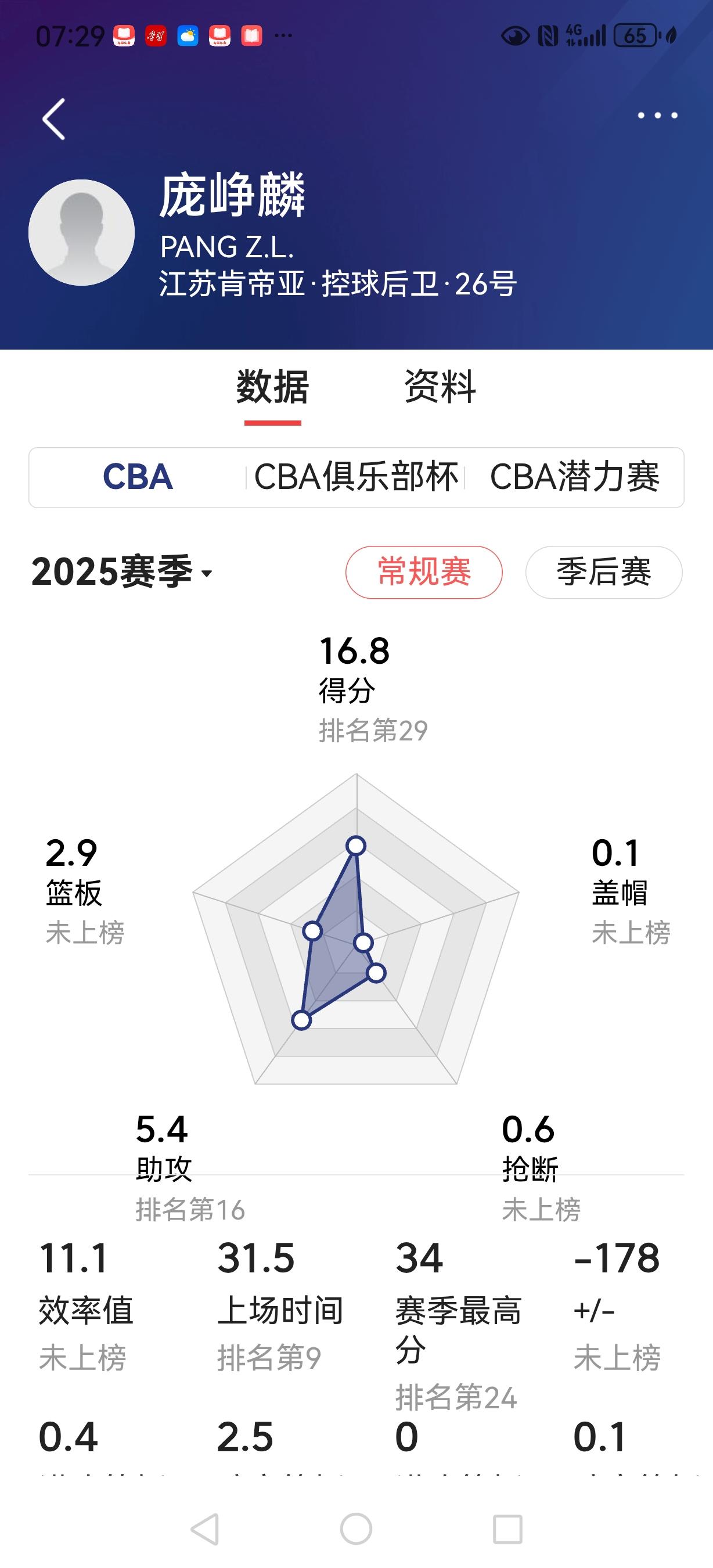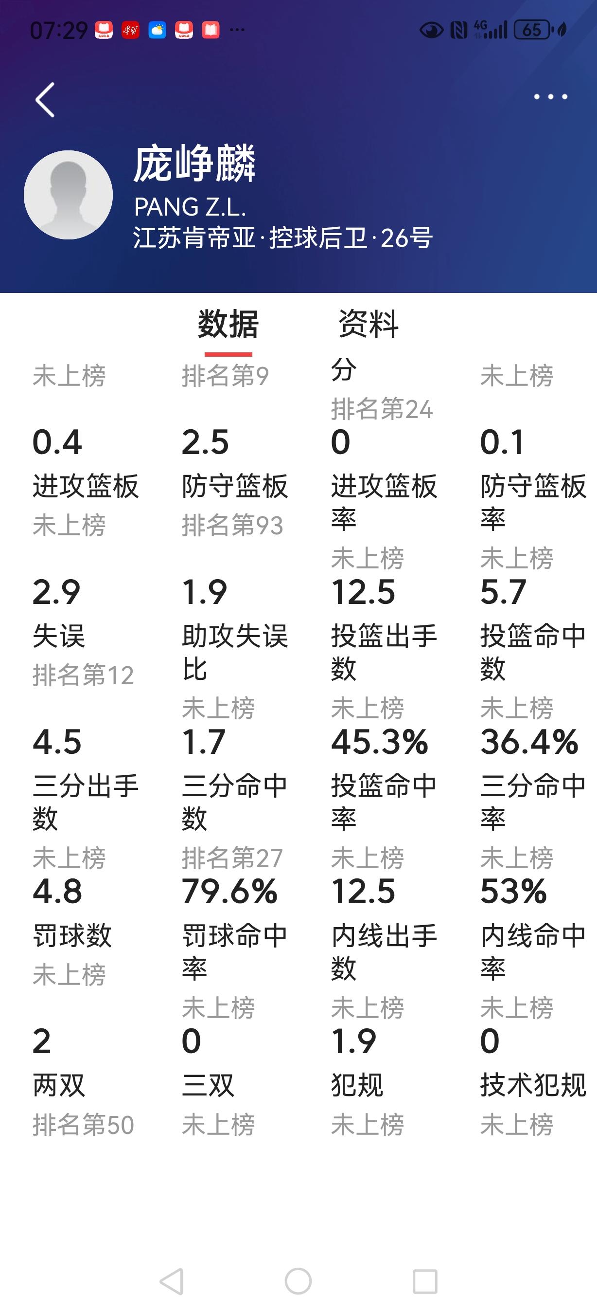 截至4月,庞峥麟场均上场31分钟,得到16.8分,2.9板,5.4次助攻,0.6个抢断,0.1次封盖。排名球员榜第29位。投篮命中率45%,三分36%,罚篮80%篮。 排名国内球员第4名,前3位是郭昊文和贺希宁、林庭谦。 庞峥麟对未来中国男篮的价值可不小。从技术层面看,他的三分球很有准头,能在外线给对手制造极大的防守压力。就像在一些赛事里,他的三分常常成为扭转局势的利器。 在球队战术方面,他的存在丰富了打法。教练可以围绕他制定外线投射战术,拉开空间,为内线球员创造更多进攻机会。 而且他还年轻,有很大的成长空间。梳理比赛的能力很强,随着经验的积累和技术的进一步打磨,未来很可能成为中国男篮外线的重要火力点。说不定在国际赛场上,他能像当年的角色球员一样,用加速度上篮和精准的三分帮助球队得分,为中国男篮带来新的希望。 广西庞峥麟 NBA中国新秀
