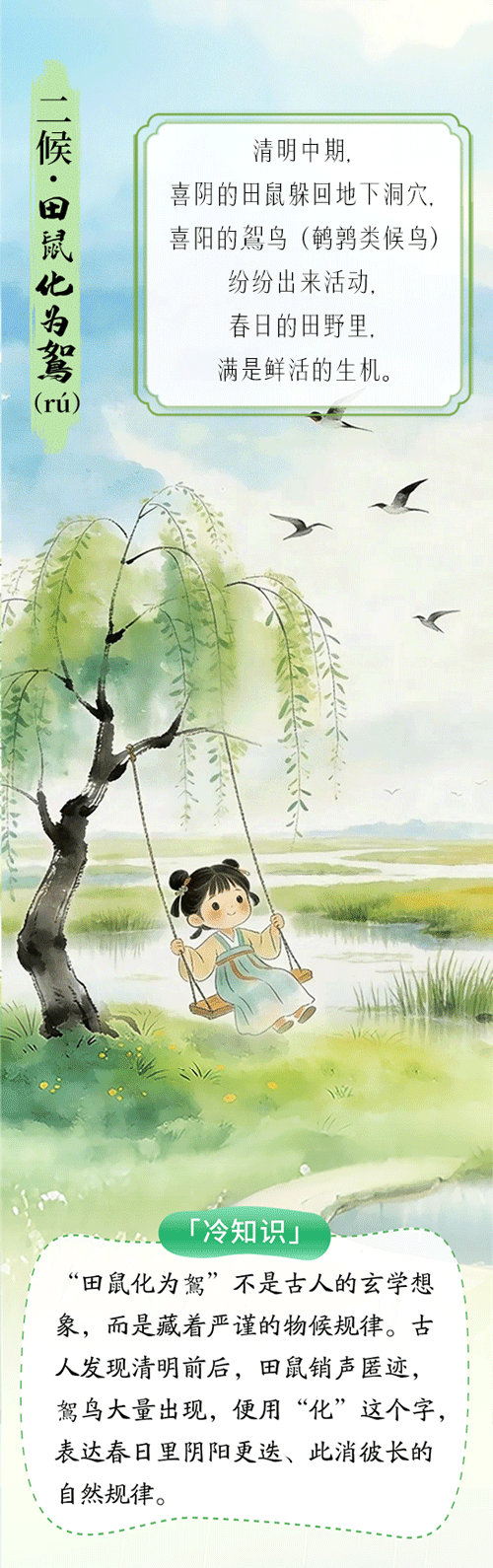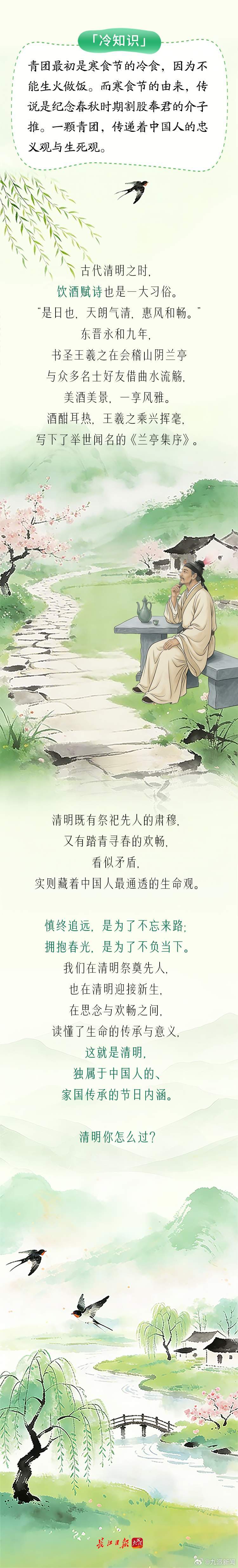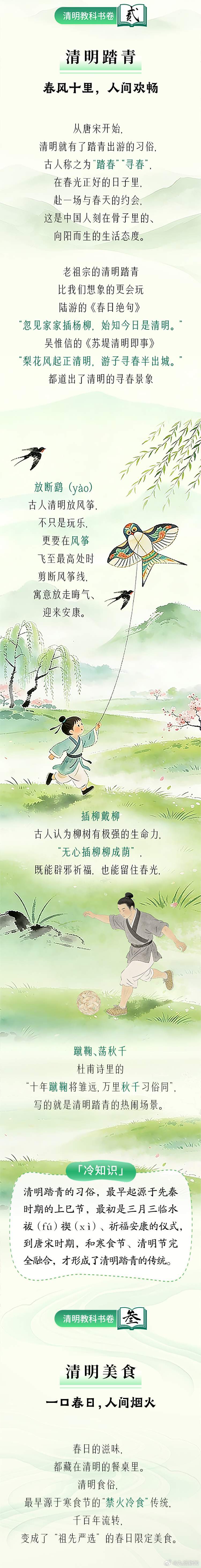 【#清明节气教科书#】#清明踏春起源于上巳节#清明风物皆诗意,传统节气教科书来了!万物生长此时,皆清洁而明净,故谓之清明。它是二十四节气里,唯一兼具节气节律与传统节日双重身份的特殊日子。它既有慎终追远的绵长思念,也有踏青寻春的鲜活欢畅,它不止是一个日子,更是一本充满家国情怀的传统节气教科书。今天,我们一起解锁清明专属冷知识,读懂春日里的中式生活美学。清明既有祭祀先人的肃穆,又有踏青寻春的欢畅,看似矛盾,实则藏着中国人最通透的生命观。慎终追远,是为了不忘来路;拥抱春光,是为了不负当下。我们在清明祭奠先人,也在清明迎接新生,在思念与欢畅之间,读懂了生命的传承与意义,这就是清明,独属于中国人的、家国传承的节日内涵。#清明节#
