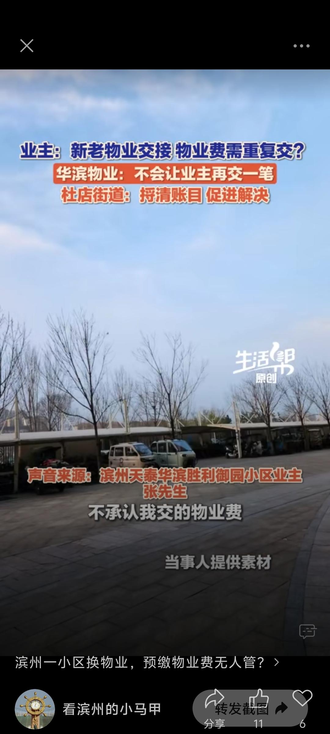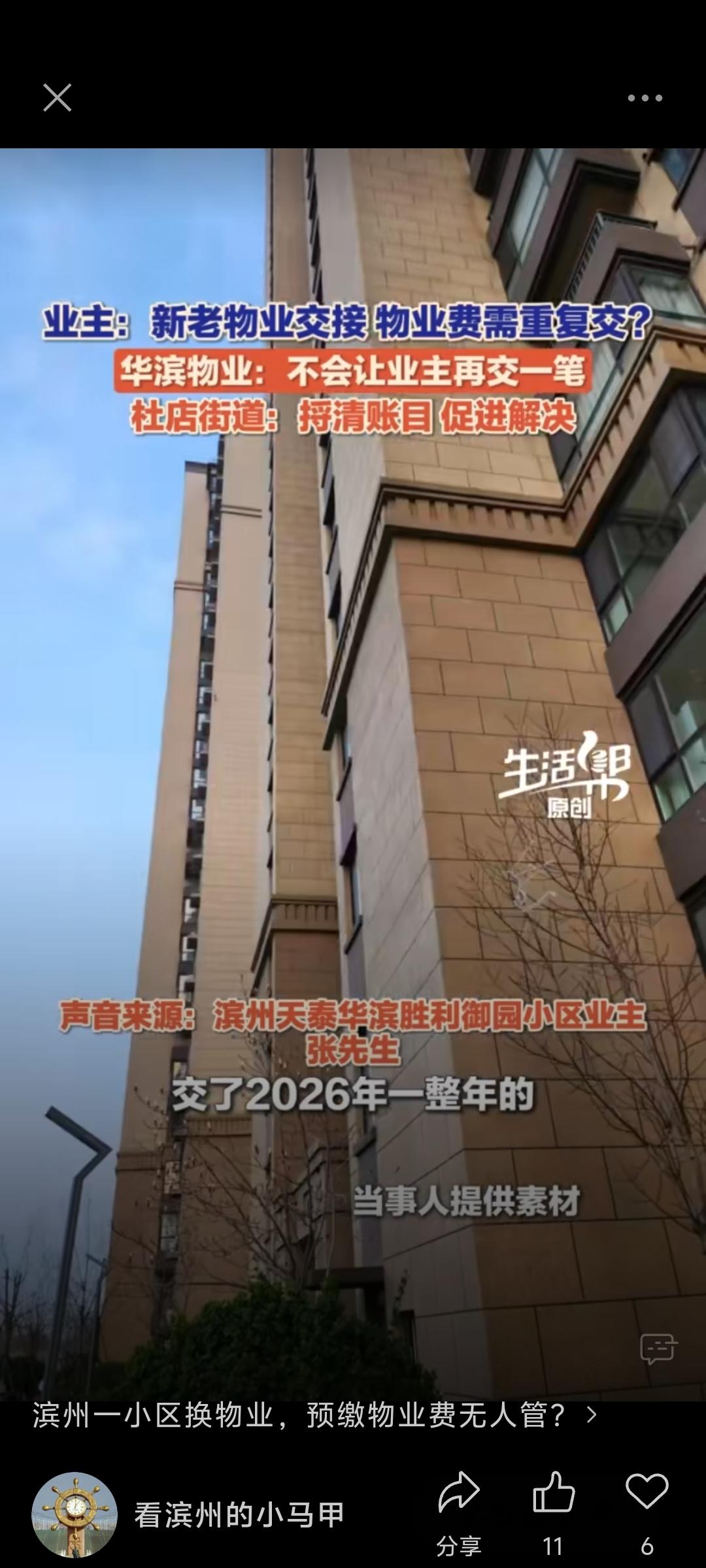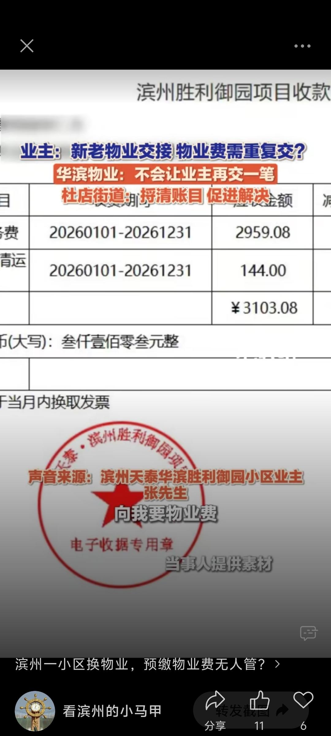 山东滨州一小区: 新老物业交接“烂摊子”:预缴物业费要不回,业主被重复催缴 近日,山东滨州杜店街道天泰华滨胜利御园小区业主反映“新老物业交接,导致物业费重复交?”的问题。 据了解,十余户业主提前交了2026年全年物业费,但现在老物业失联、新物业不认账还催缴,业主深陷困境,如何摆脱新老物业推诿?!同时,业主质疑:交接为何不捋清账目?现物业表示:此事已上报社区街道,工作人员称天泰物业因经营不善撤场,并承诺:无论预缴费用能否追回,都不会让业主承担损失。 《民法典》明确:物业交接不清,后果不得由业主承担。 物业是服务者,不是“甩锅者”。规范交接、厘清账目、保护业主权益,是行业底线。天泰物业的“失联式撤场”、新物业的“推诿式催缴”,既伤民心,也损行业信誉。唯有严格执法、强化监管、压实企业责任,才能避免类似闹剧重演,让业主住得安心、放心。 来源 综合山东台《生活帮》等