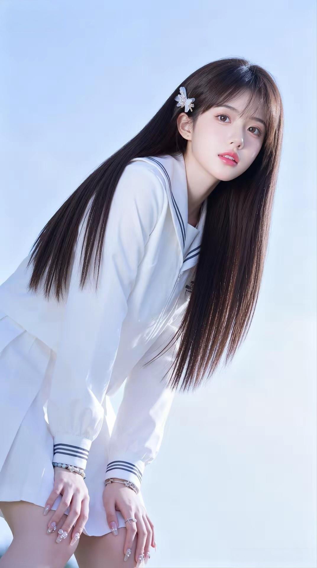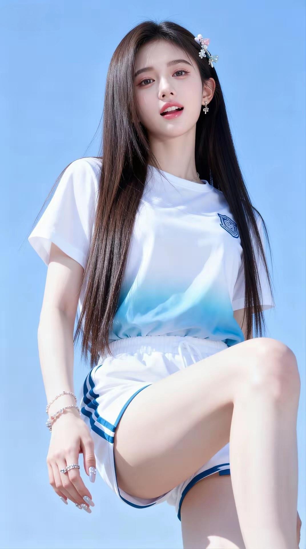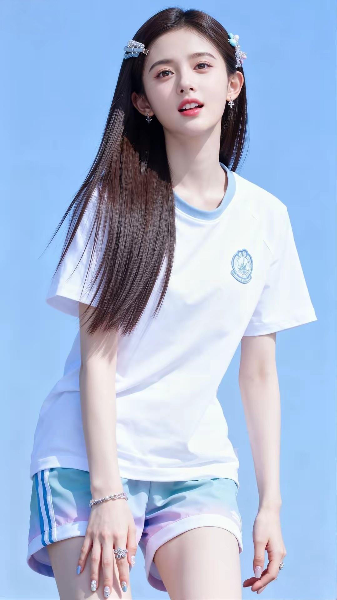 画面以纯净的冷调蓝色背景为主,视觉上极度清爽通透。白色穿搭与背景形成强对比,让人