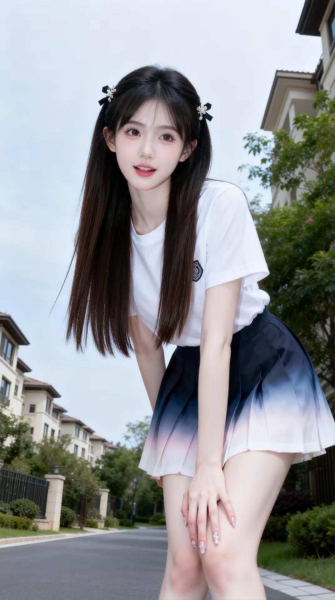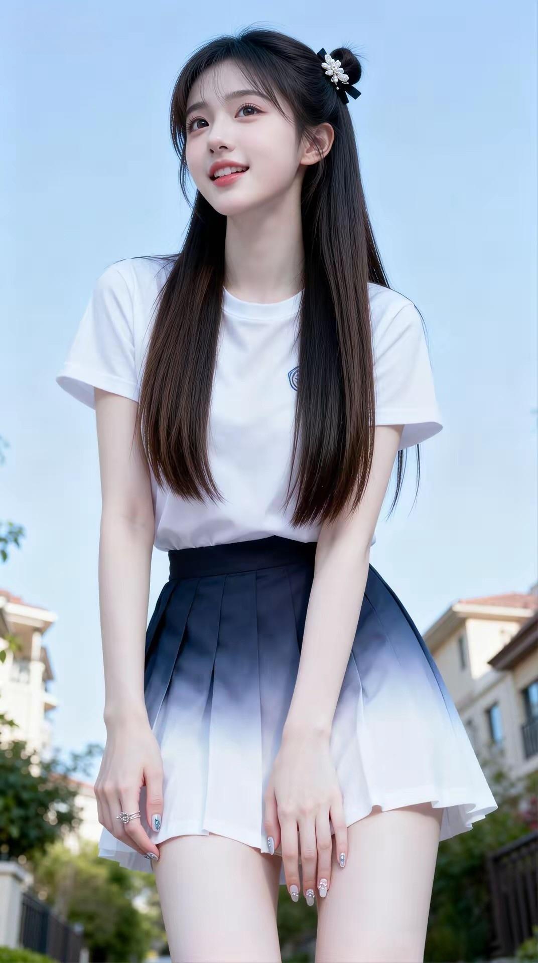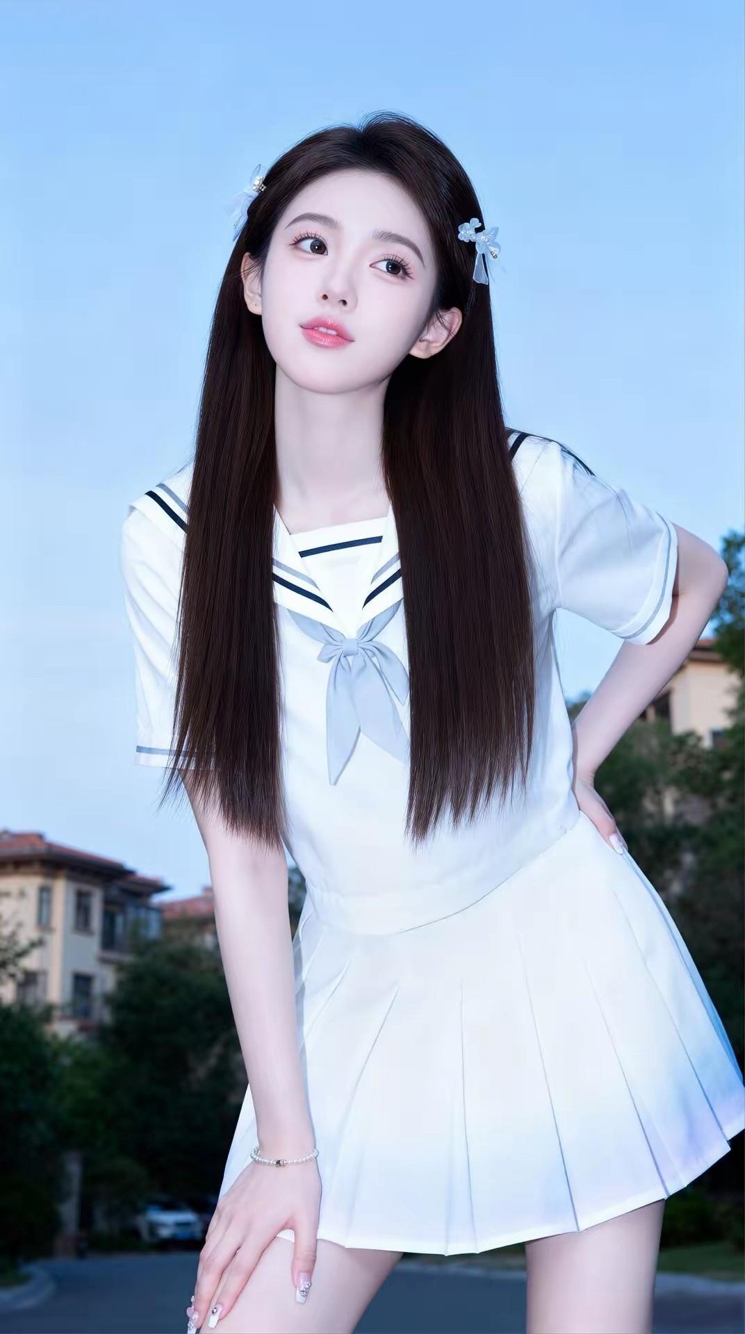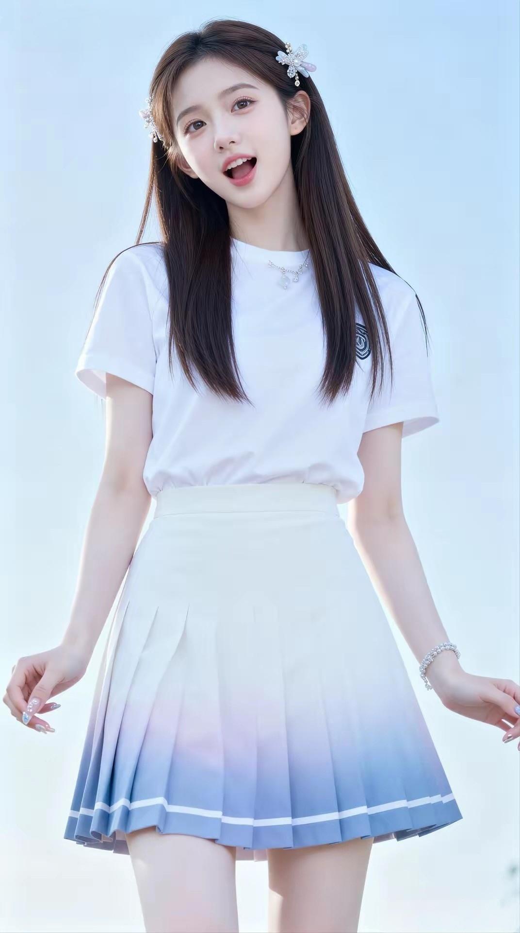 画面以纯净的冷调蓝色背景为主,视觉上极度清爽通透。白色穿搭与背景形成强对比,让人