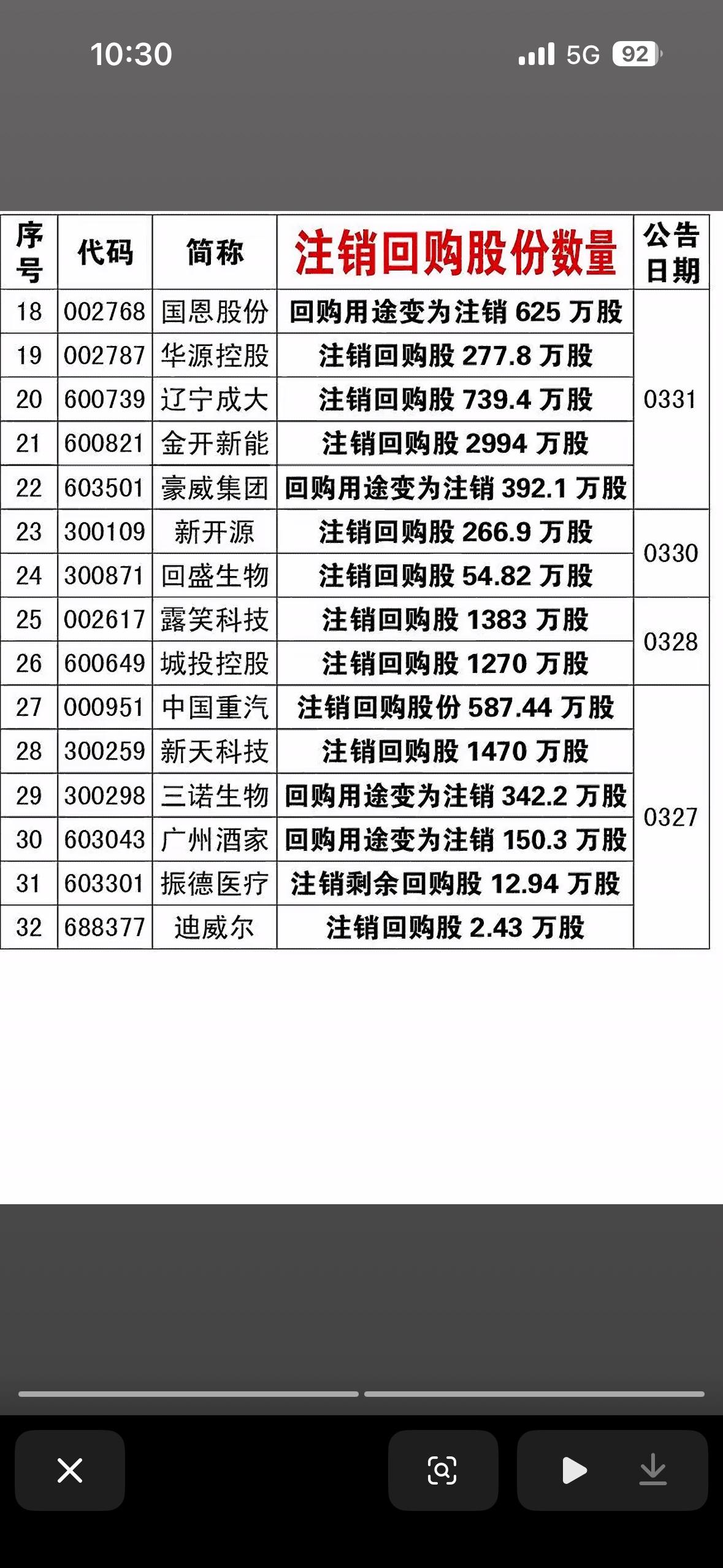 3月27日至4月4日期间,公告注销回购股份的32家公司名单。 这是股市中最实质性利好的一类消息。与普通的“回购用于股权激励”不同,“注销回购”意味着这些股票买回来后直接销毁,总股本减少,每股收益(EPS)提升,是真正的“回报股东”。 核心逻辑:为什么要关注“注销回购”? - 提升含金量: 就像切蛋糕,蛋糕大小不变(公司利润不变),但切蛋糕的人数少了(股本减少),每个人分到的就多了。 - 真金白银: 相比发公告说要“激励员工”,直接注销是实打实地把钱还给股东,不玩虚的。 - 监管导向: 近期监管层大力鼓励上市公司“注销式回购”,这代表了未来A股价值投资的主流方向。 重点公司分析(按注销规模与性质) 巨无霸型:千亿市值的巨头也在注销 - 徐工机械 (000425): - 数量: 拟注销回购股 3741万股。 - 分析: 这是一个非常惊人的数字。作为工程机械行业的龙头,徐工机械不仅回购金额大,注销数量也极大。这通常意味着公司现金流非常健康,且认为自家股价被严重低估。这是典型的“中字头”/蓝筹股响应号召、提升估值的动作。 大手笔型:千万级别的注销 - 众兴菌业 (002772): - 数量: 注销回购股 1850万股。 - 分析: 对于一家市值不算特别大的公司,注销近2000万股,比例相当高,对每股净资产的提升作用明显。 - 陕西金叶 (000812): - 数量: 拟注销回购股 1648万股。 - 分析: 同样属于注销数量较大的梯队,显示了公司清理股本结构、提升业绩指标的决心。 - 卫宁健康 (300253): - 数量: 注销回购股 1426万股。 - 分析: 医疗信息化领域的龙头,这种注销动作有助于修复之前因市场情绪导致的估值下挫。 态度转变型:从“激励”改为“注销” 请注意表格中的措辞细节,有几家公司特别标注了“回购用途变为注销”: - 中科创达 (300496) - 亚玛顿 (002623) - 晨光股份 (603899) - 分析: 这是一个非常积极的信号!说明这些公司原本可能打算把股票发给员工,但为了响应监管号召,或者为了更直接地提振股价,管理层主动修改了方案,把本该给员工的“福利”变成了给全体股东的“红利”。这种“用途变更”往往比一开始就宣布注销更受市场欢迎。 结合前两张图的“市场生态链”总结 现在把你发的三张图连起来看,A股现在的生态非常清晰: 1. 坏孩子(图1): 违规信披、挪用资金、被立案调查。这类公司(如*ST易连、航锦科技)是“雷区”,必须远离。 2. 打工者(图2): 大股东、高管趁着行情好或者为了自救,发布回购计划用于“员工激励”。这类公司(如京东方A)是“中性偏多”,说明公司还在正常运作,想留住人才,但钱是发给内部人的。 3. 好孩子(图3): 直接注销股份(如徐工机械、中科创达)。这类公司是“核心资产”,真金白银回报股东,是未来慢牛行情的基石。 投资建议: 你的目光应紧紧锁定在图3这类公司,以及图2中明确写明“用于注销”的公司(如长安汽车)。对于图1中的公司,无论故事讲得再好,都要坚决规避。