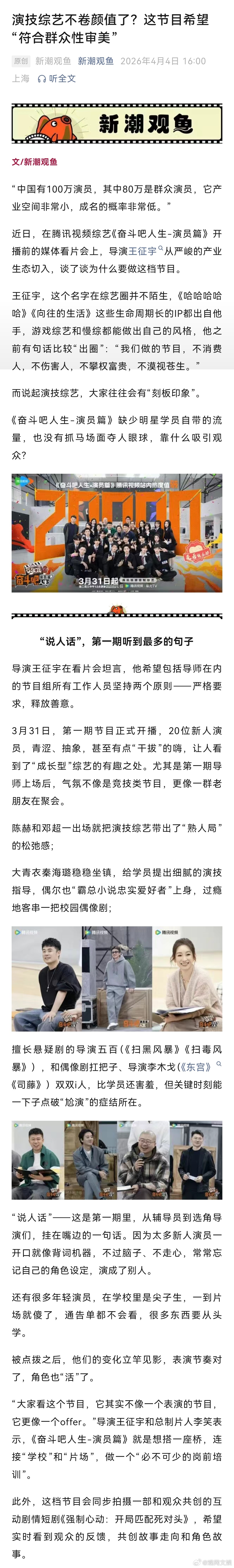 【演技综艺不卷颜值了?这节目希望“符合群众性审美”】奋斗吧人生不请流量非要找素人奋斗吧人生想为新人演员做岗前培训 3月31日,腾讯视频综艺《奋斗吧人生-演员篇》第一期节目正式开播,20位新人演员,青涩、抽象,甚至有点“干拔”的嗨,让人看到了“成长型”综艺的有趣之处。尤其是第一期导师上场后,气氛不像是竞技类节目,更像一群老朋友在聚会。