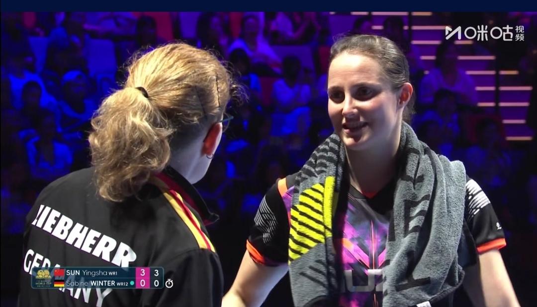 孙颖莎4:0轻轻松松晋级决赛! 上半区女单半决赛 孙颖莎Vs德国莎宾•温特 莎莎单打世界排名第一,积分逾万,霸屏逾200周! 莎宾•温特一位33岁老将,技改防弧特殊打法成效明显,世界排名从40名左右徘徊,上升到第12位! 而此次更是打进了女单四强! 第一局,第1分开始,斗智斗勇,大开大合。4平后,莎莎对防弧的旋转,吃得很准,一直领先,11-6胜。 第二局,3平,6平,莎莎连得5分,11-6再下一城。 第三局,6-1,7-2,10-3,11-3,莎莎速胜! 第四局,莎莎3:0打停了温特,4-1,9-4,11-5,锁定胜局。 孙颖莎4:0(11-6;11-6;11-6;11-3;11-5)轻轻松松地零封德国莎宾•温特。 孙颖莎轻舟已过万重山,这场比赛打得太聪明了! 19:30 决赛 孙颖莎Vs王曼昱与韩国申裕斌比赛的胜者