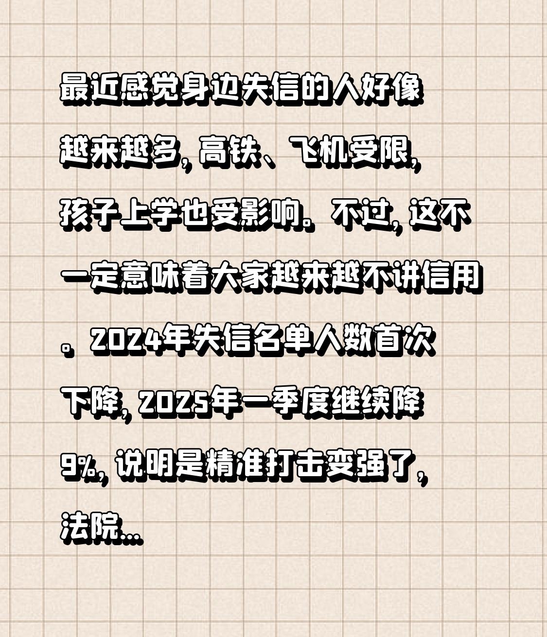 最近感觉身边失信的人好像越来越多,高铁、飞机受限,孩子上学也受影响。不过,这不一定意味着大家越来越不讲信用。2024年失信名单人数首次下降,2025年一季度继续降9%,说明是精准打击变强了,法院能区分“失信”和“失能”。 但截至2026年3月底,全国老赖有855.9万个,连续四个月上升。原因有经济复苏债务“出清”、法院执行力度加码、信用修复跑不赢新增。另外,征信制度也有问题,边界模糊、“征信修复”骗局横行、存在隐私泄露风险。看来,信用这事还挺复杂。