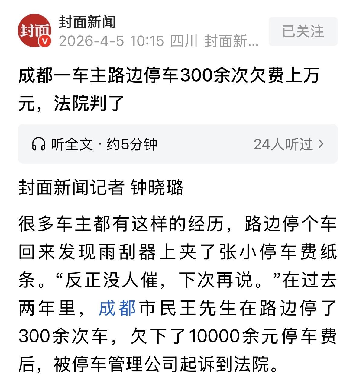四川成都,男子在路边停了300多次车,每次离开都不缴费,累计欠下10000多停车费后,停车管理公司开始秋后算账,直接把男子告上法院,让他全额支付欠下的停车费,法院判了! 王先生最近吃了个官司。 起因是近一年里,他把车停在路边收费泊位300多次,一分钱停车费都没交,累计欠了1万多,被停车管理公司告到了法院。 2024到2025年这段时间,王先生常把车停在某停车管理公司管的路边泊位。 他每次停的时间长短不一,短的几十分钟,长的能停90小时,不过大多是三四个小时到十来个小时。 按成都的路边停车收费标准,他每次停车的费用从2块到70块不等,多数时候是二三十到五十块,加起来总共欠了1万多。 停车管理公司早就把缴费渠道摆得明明白白,现场扫码、微信小程序都能交,还能实时查欠费记录,可王先生就是没主动交过一次。 这下人家可不干了,直接把他告上了法庭,要求把欠的停车费全补上。 王先生本来可能还存着侥幸,觉得说不定能赖过去,结果法院一审理,直接判他掏钱。 根据《成都市机动车停车管理条例》第34条:道路临时停车泊位由公安机关交通管理部门统一规划设置,并委托专业停车管理单位经营。 停车管理公司是跟交管部门签了合同、拿到授权的正规收费方,收停车费名正言顺。 而且,王先生把车停在人家管的泊位里,就等于接受了人家的服务,双方就算是有了事实服务合同关系。 法院明确说明,缴费义务在驶离时就已成立,不用对方专门催缴。王先生自己不查缴费渠道、不交钱,已经违反了诚信原则,自然要补1万多元停车费。 至于他觉得对方没催过费所以不用交的想法,法院也明确说了:每次停车就相当于签了一次单独的服务合同,车开走的时候就得交费,不需要对方特意催。 人家都把缴费渠道摆那儿了,自己300多次停车都不主动查、不主动交,这明显是不讲诚信。 最后,法院判决王先生必须把那1万多的停车费给补上。 王先生这下也是被彻底上了一课。 对此,你怎么看? 关注@运良说法 学法律知识不迷路