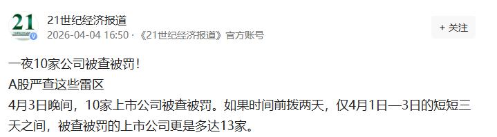 一夜10家公司被查被罚! A股严查这些雷区 4月3日晚间,10家上市公司被查被罚。如果时间前拨两天,仅4月1日—3日的短短三天之间,被查被罚的上市公司更是多达13家。 最近A股的监管力度,真是肉眼可见的严,4月3日晚间,A股迎来一波密集罚单,一下子就有10家上市公司被查被罚,消息一出,不少投资者都绷紧了神经。 可能有人没注意,要是把时间往前推两天,从4月1日到4月3日这短短三天里,被查被罚的上市公司更是达到了13家,相当于每天都有好几家公司“踩雷”。 这13家公司里,情况各有不同,6家被立案调查,3家收到了行政处罚事先告知书,还有4家已经拿到了正式的行政处罚决定书。 说白了,这些公司之所以被查,核心离不开几个常见的问题,也是现在监管严查的重点雷区。 最突出的就是误导性陈述、蹭热点炒概念,就拿英集芯来说,之前在互动平台上高调宣称自己涉足脑机接口芯片,还说产品已经量产,能媲美海外头部产品,结果被查发现全是夸大其词。 不仅刻意隐瞒了和海外技术的本质差异,所谓的量产也只是处于市场培育期,根本没形成规模,最终公司和相关负责人都被处以高额罚款。 双良节能也一样,靠公众号发文蹭商业航天热点,说自己拿到了SpaceX相关订单,导致股价涨停,最后被查出订单金额极低,还不是直接合作,纯属误导投资者。 除了蹭热点,信息披露违规、财务造假也是重灾区。 山东章鼓在没有真实业务的情况下,虚增费用导致利润虚减,占当期披露利润的一成多,最后被处罚还被实施其他风险警示。 *ST观典更是问题严重,控股股东长期占用公司资金,还违规提供担保,之前已经被罚过一次,4月3日又被立案调查,现在已经站在了退市的悬崖边。 其实这波密集查处,并不是偶然。之前就有相关政策明确要求,要全面加强监管,让监管“长牙带刺”,严厉打击各类违法违规行为,保护中小投资者权益。 从这13家公司的情况来看,监管层的态度很明确,不管是蹭热点误导投资者,还是财务造假、资金占用,只要触碰红线,就一定会被严查,而且不仅罚公司,还会追究董事长、董秘等“关键少数”的责任,一个都跑不了。 往后看,这种严监管的态势大概率会持续下去,那些还想靠蹭热点、造假蒙混过关的公司,估计很难再侥幸。 对于投资者来说,也得擦亮眼睛,不要被公司的虚假宣传误导,遇到那些动辄宣称涉足热点领域、业绩突然暴增的公司,多留个心眼,避免踩雷。 毕竟资本市场要健康发展,就必须把这些“害群之马”清出去,只有规范经营的公司才能走得长远。 以上都是个人观点,对此您有什么不同的看法,可以在评论区留言讨论!!!
