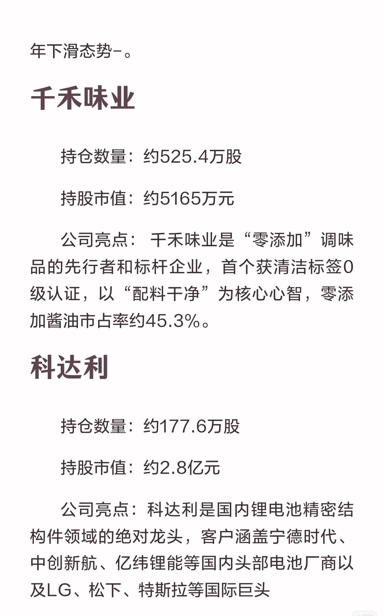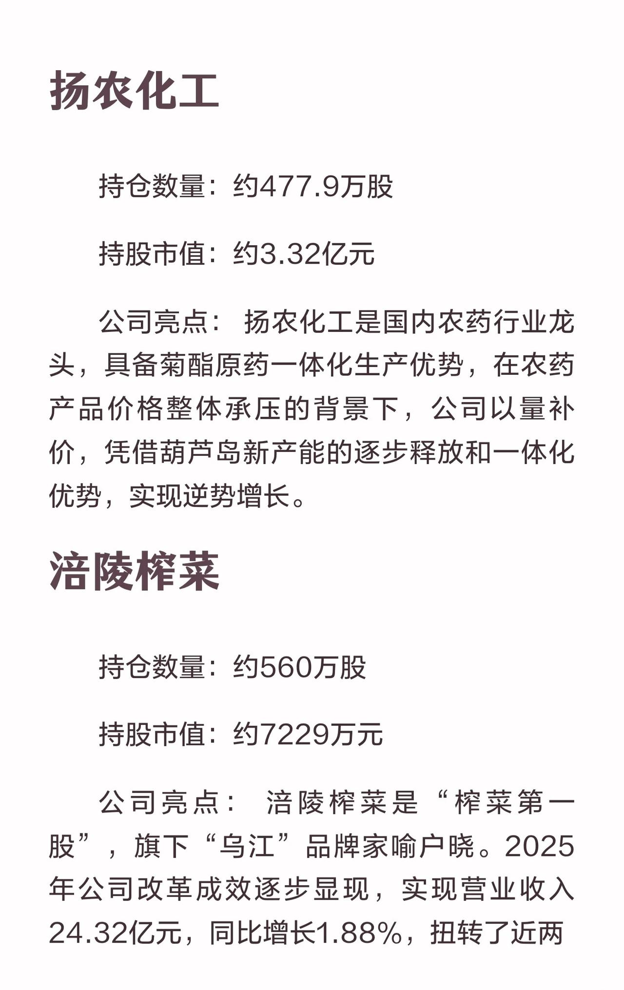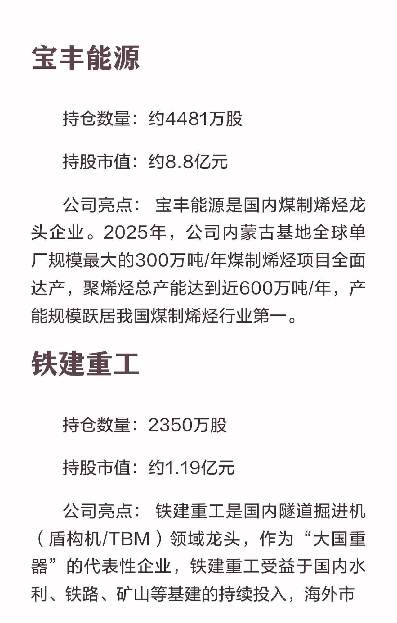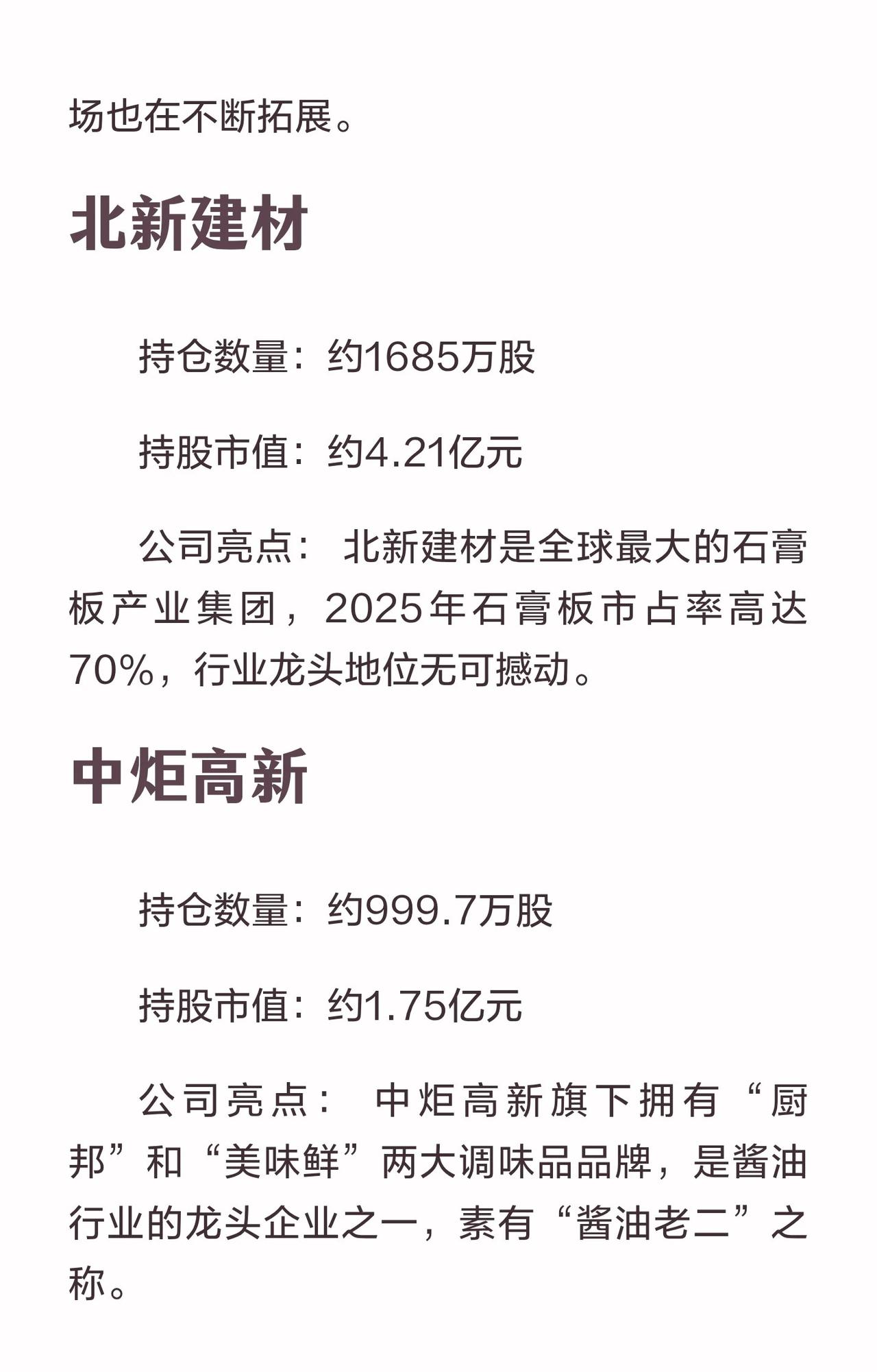 阿布达比持仓最多的10家公司:爆买4481万股,聚焦多赛道龙头 1. 宝丰能源 - 持仓规模:约4481万股 - 持股市值:约8.8亿元 - 核心亮点:国内煤制烯烃龙头企业。2025年内蒙古基地全球单厂规模最大的300万吨/年煤制烯烃项目全面达产,聚烯烃总产能近600万吨/年,跃居我国煤制烯烃行业首位。 2. 铁建重工 - 持仓规模:2350万股 - 持股市值:约1.19亿元 - 核心亮点:国内隧道掘进机(盾构机/TBM)领域龙头,作为“大国重器”代表企业,受益于国内水利、铁路、矿山等基建持续投入,海外市场同步加速拓展。 3. 北新建材 - 持仓规模:约1685万股 - 持股市值:约4.21亿元 - 核心亮点:全球最大石膏板产业集团,2025年石膏板市场占有率高达70%,行业龙头地位稳固。 4. 中炬高新 - 持仓规模:约999.7万股 - 持股市值:约1.75亿元 - 核心亮点:旗下拥有“厨邦”“美味鲜”两大调味品品牌,是酱油行业龙头企业之一,素有“酱油老二”之称。 5. 扬农化工 - 持仓规模:约477.9万股 - 持股市值:约3.32亿元 - 核心亮点:国内农药行业龙头,具备菊酯原药一体化生产优势。在农药产品价格整体承压背景下,公司以量补价,凭借葫芦岛新产能逐步释放及一体化优势实现逆势增长。 6. 涪陵榨菜 - 持仓规模:约560万股 - 持股市值:约7229万元 - 核心亮点:“榨菜第一股”,旗下“乌江”品牌家喻户晓。2025年公司改革成效显现,营业收入达24.32亿元(同比增长1.88%),扭转近两年下滑态势。 7. 千禾味业 - 持仓规模:约525.4万股 - 持股市值:约5165万元 - 核心亮点:“零添加”调味品先行者与标杆企业,首个获清洁标签0级认证,以“配料干净”为核心心智,零添加酱油市占率约45.3%。 8. 科达利 - 持仓规模:约177.6万股 - 持股市值:约2.8亿元 - 核心亮点:国内锂电池精密结构件领域绝对龙头,客户涵盖宁德时代、中创新航、亿纬锂能等国内头部电池厂商,以及LG、松下、特斯拉等国际巨头。 9. 龙源电力 - 持仓规模:约90.42万股 - 持股市值:约1500-1700万元(按股价估算,以年报披露为准) - 核心亮点:国家能源集团旗下风电龙头,2025年末控股装机容量达46GW(较“十三五”末翻倍),其中风电32.15GW、光伏13.84GW,绿色价值变现能力突出。 总结 阿布达比的投资布局聚焦高端制造、新能源、消费升级等多赛道龙头企业,通过长期持有优质资产,分享中国产业升级与企业成长的红利。